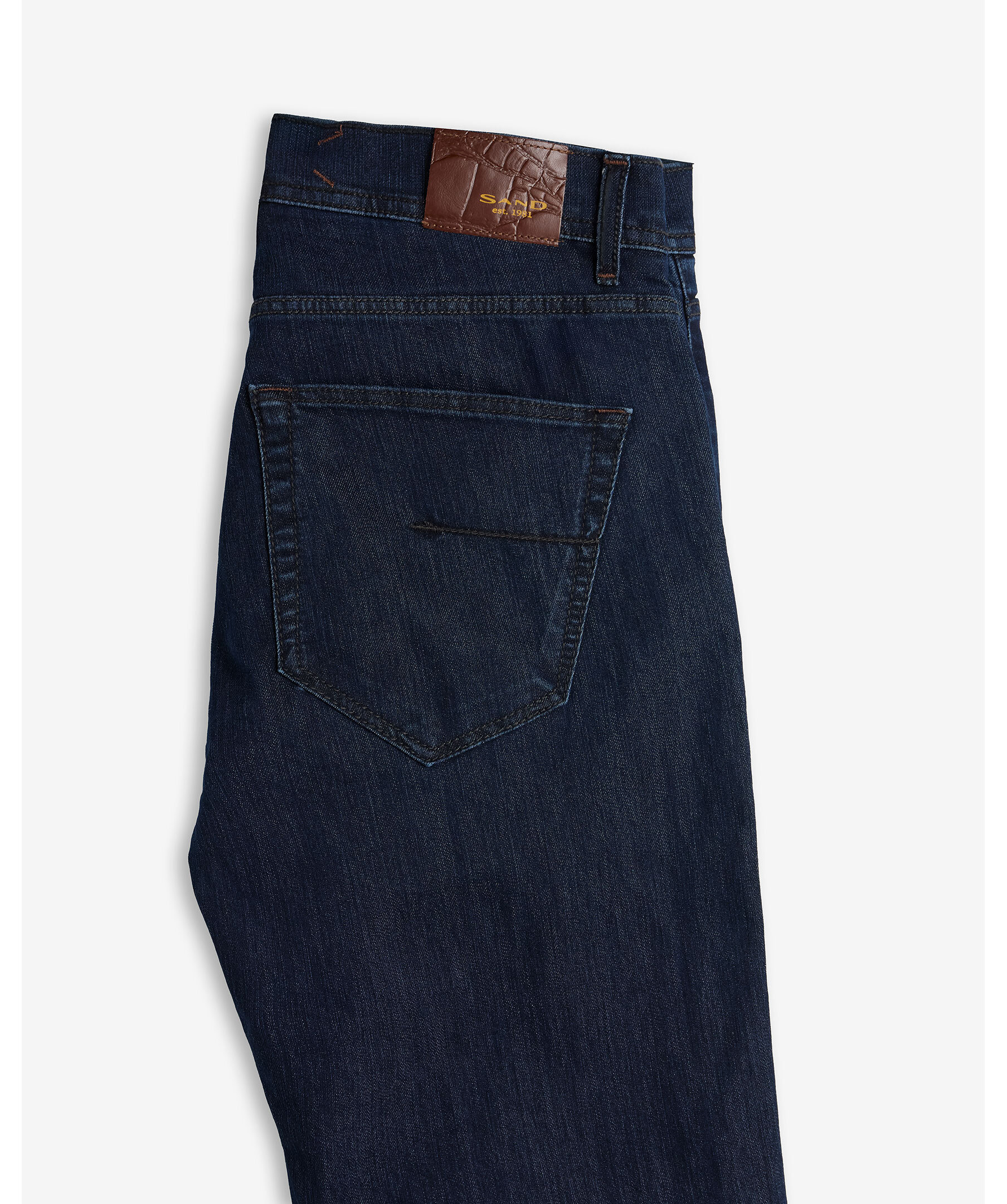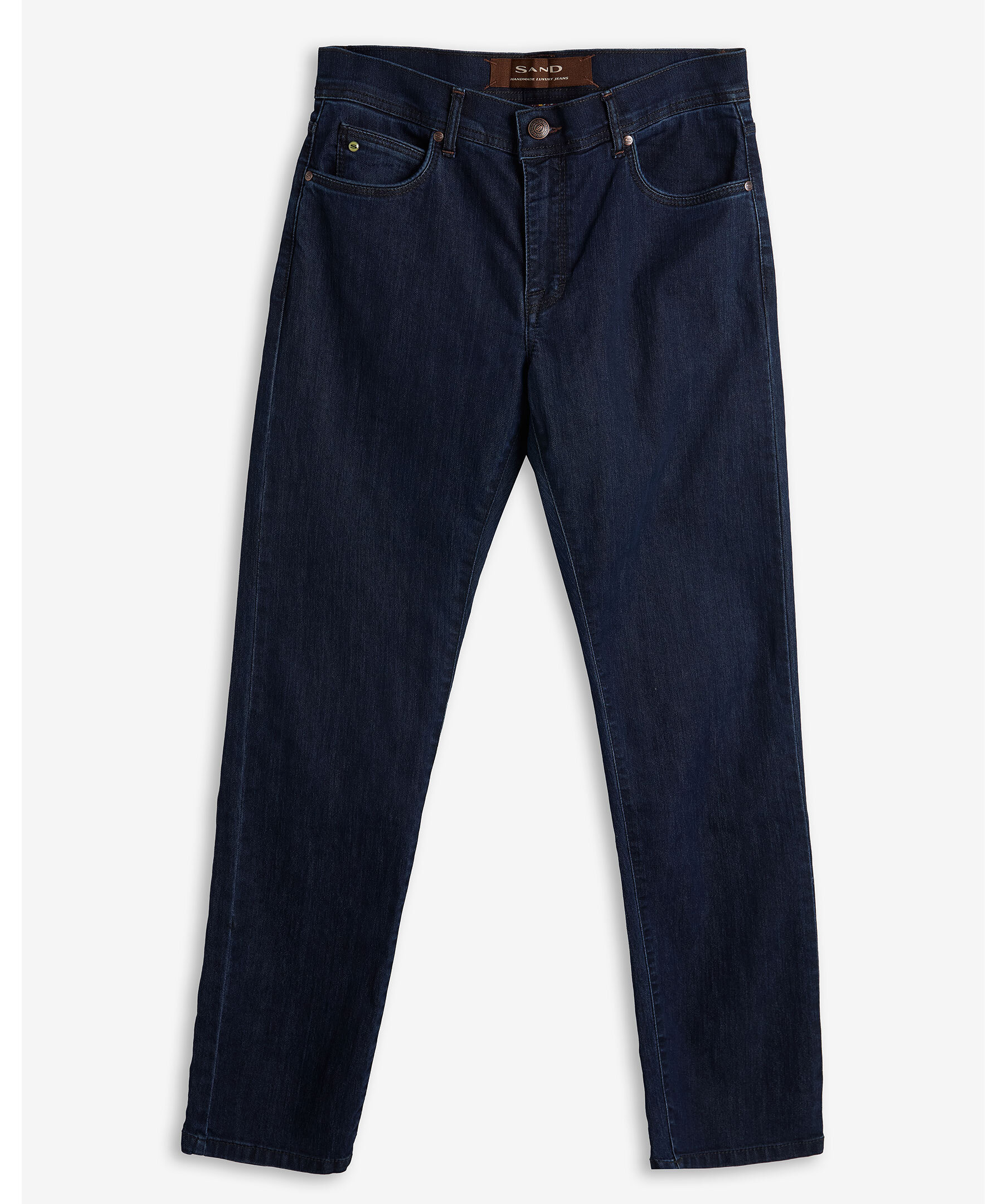 Mörklblåa byxor från SAND. Byxorna har rak benform med standardhöjd (regular rise) samt metallknapp och dold dragkedja framtill. Tyget har tvåfärgad struktur och är en performance stretch-blandning. Ett mångsidigt plagg som passar både till skjorta och stickad tröja för kontor eller fritid.