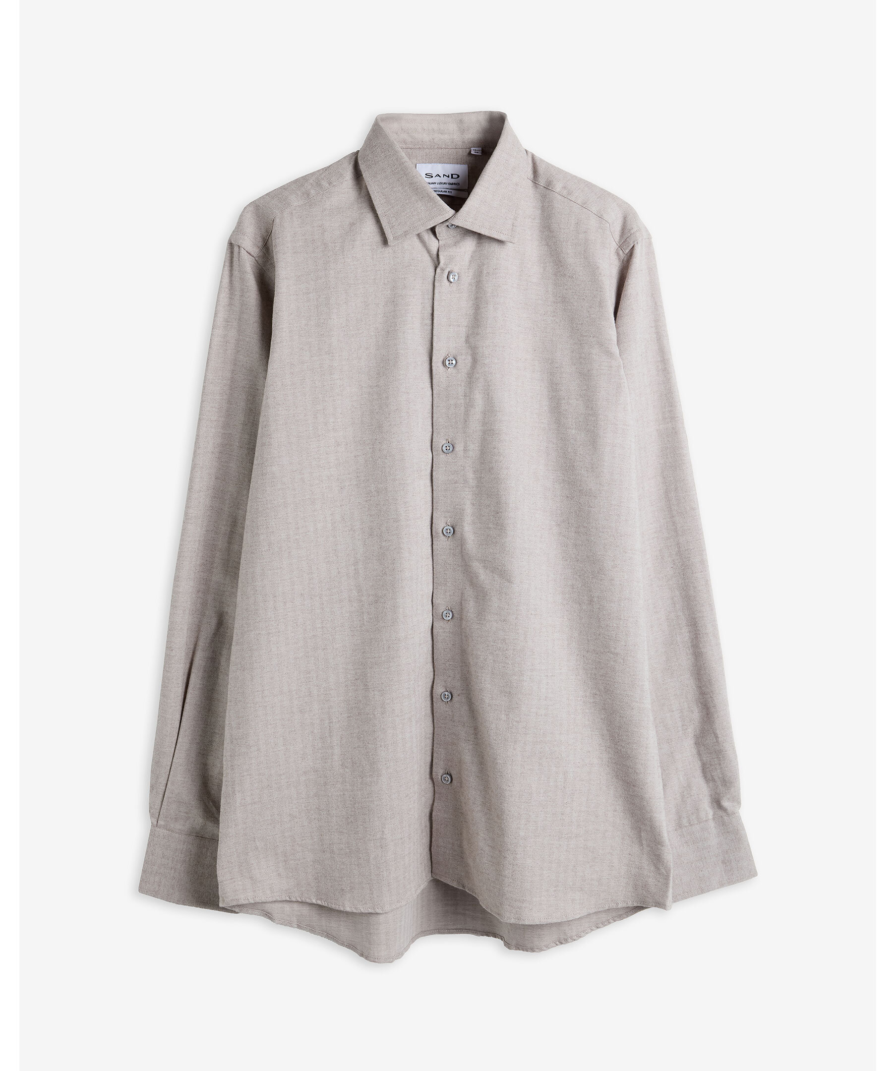 Stilren och mångsidig skjorta i färgen Light Camel från SAND. Tillverkad i 100% bomull med en mjuk och fin twill-väv i herringbone-mönster, vilket ger en exklusiv känsla. Skjortan har en modern passform, spetsig krage, två insnitt bak, justerbara enkla manschetter och är helt i italienskt vävt tyg. Perfekt för både vardag och finare tillfällen.