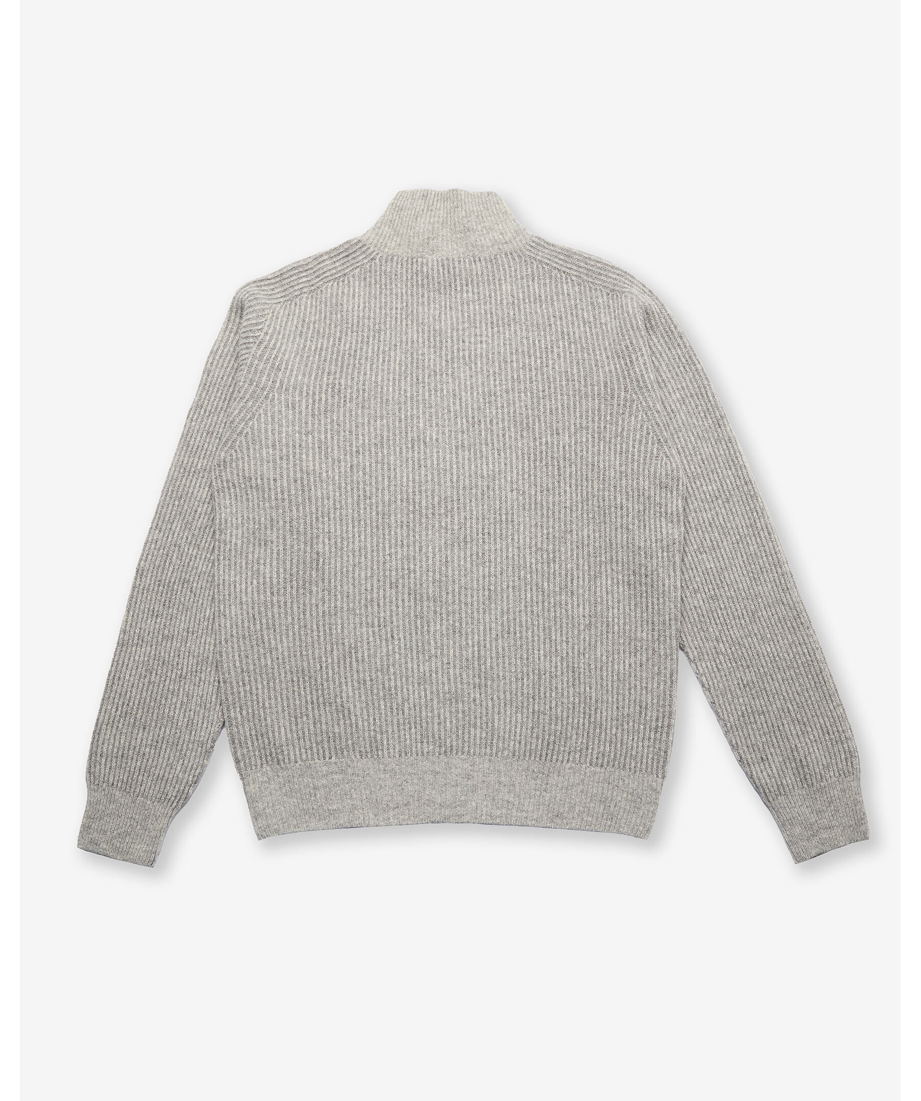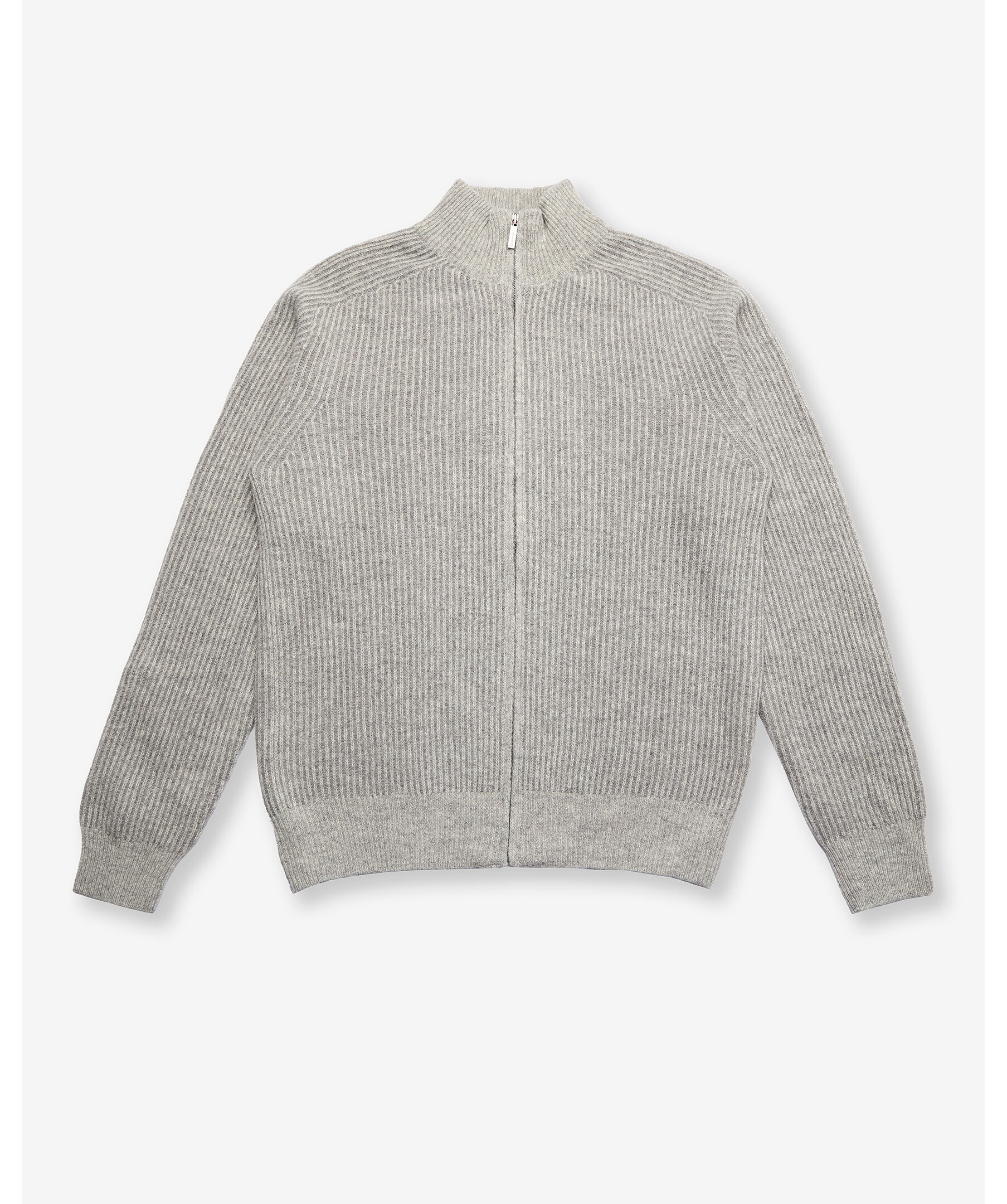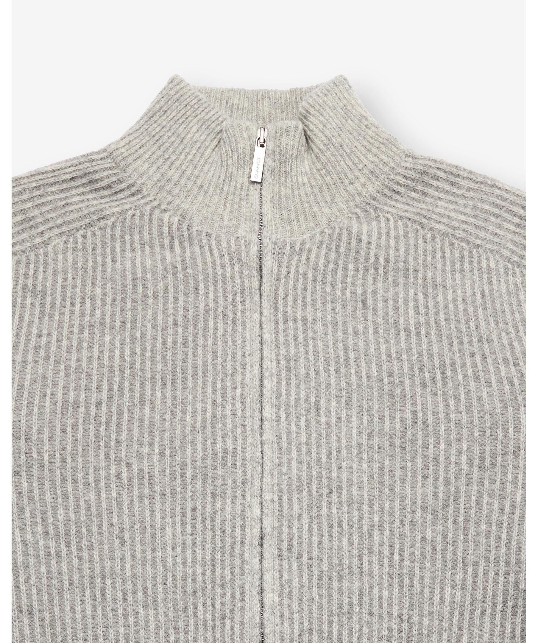 Grå, ribbstickad cardigan från Sand. Koftan har en hög krage och ribbstickade muddar. Tillverkad i en ullblandning.