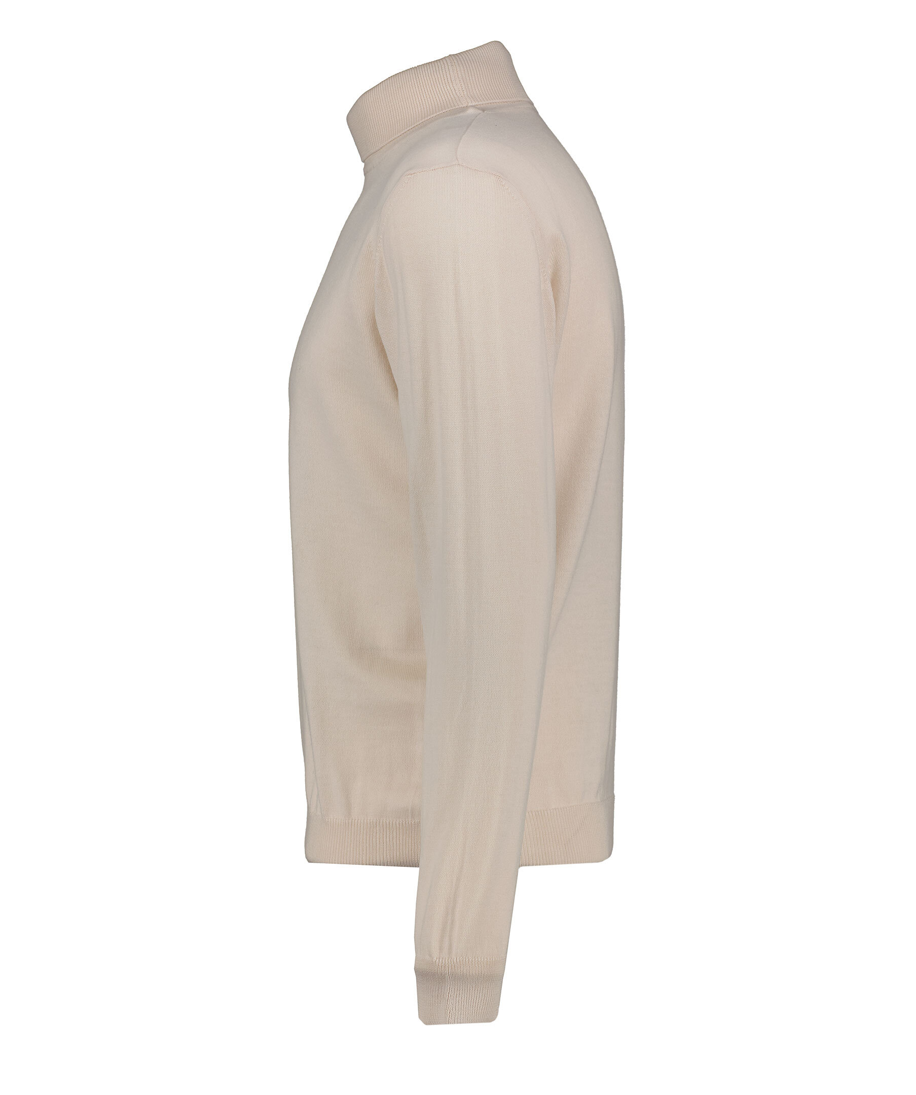 Krämvit, finstickad polotröja från Sand. Tröjan har en hög ribbstickad krage samt ribbstickade muddar vid ärm- och plaggslut. Tillverkad i 100% merinoull.
