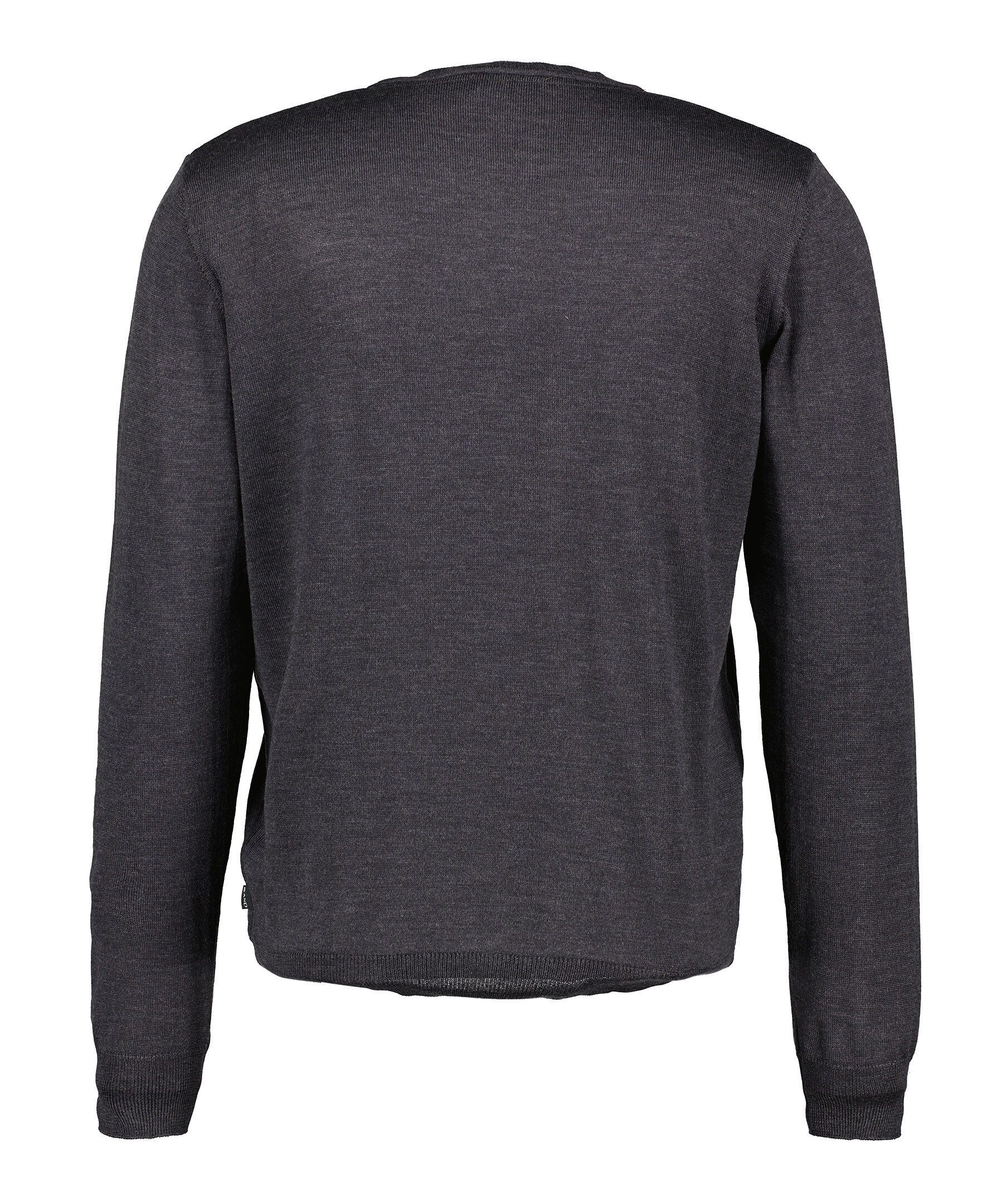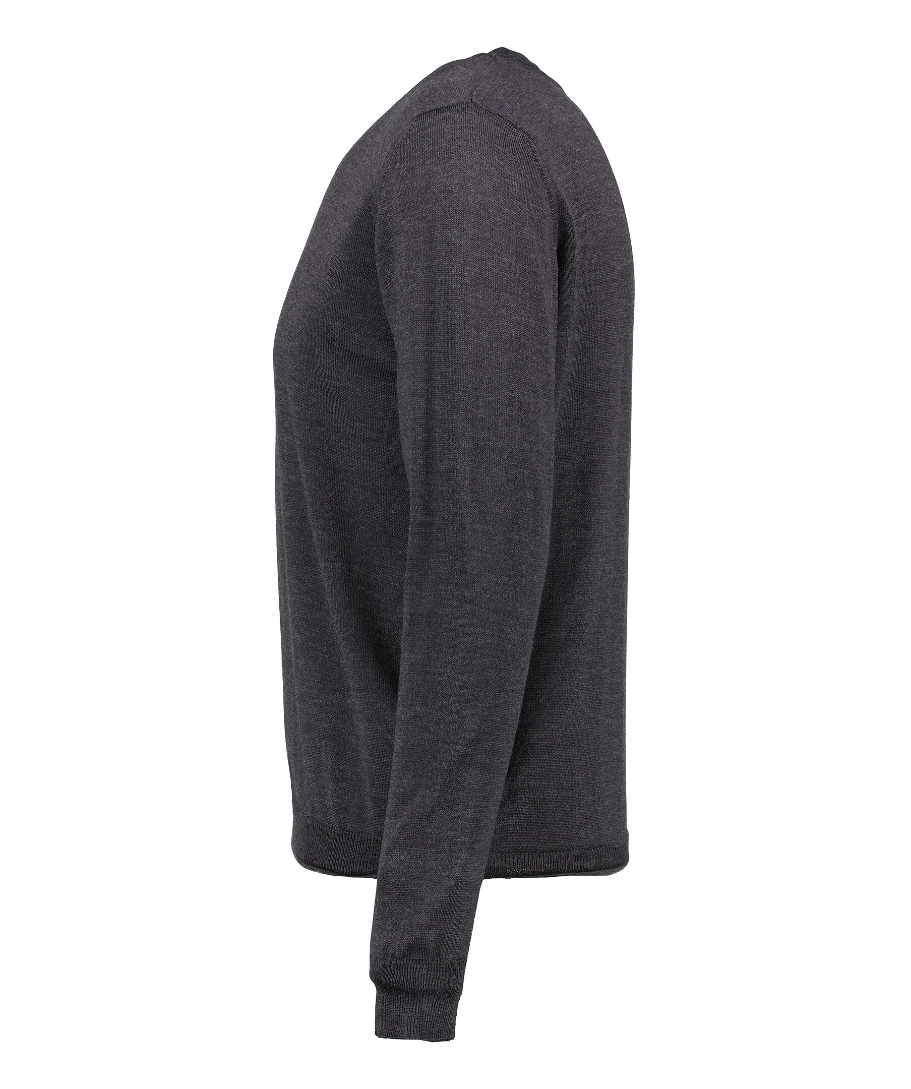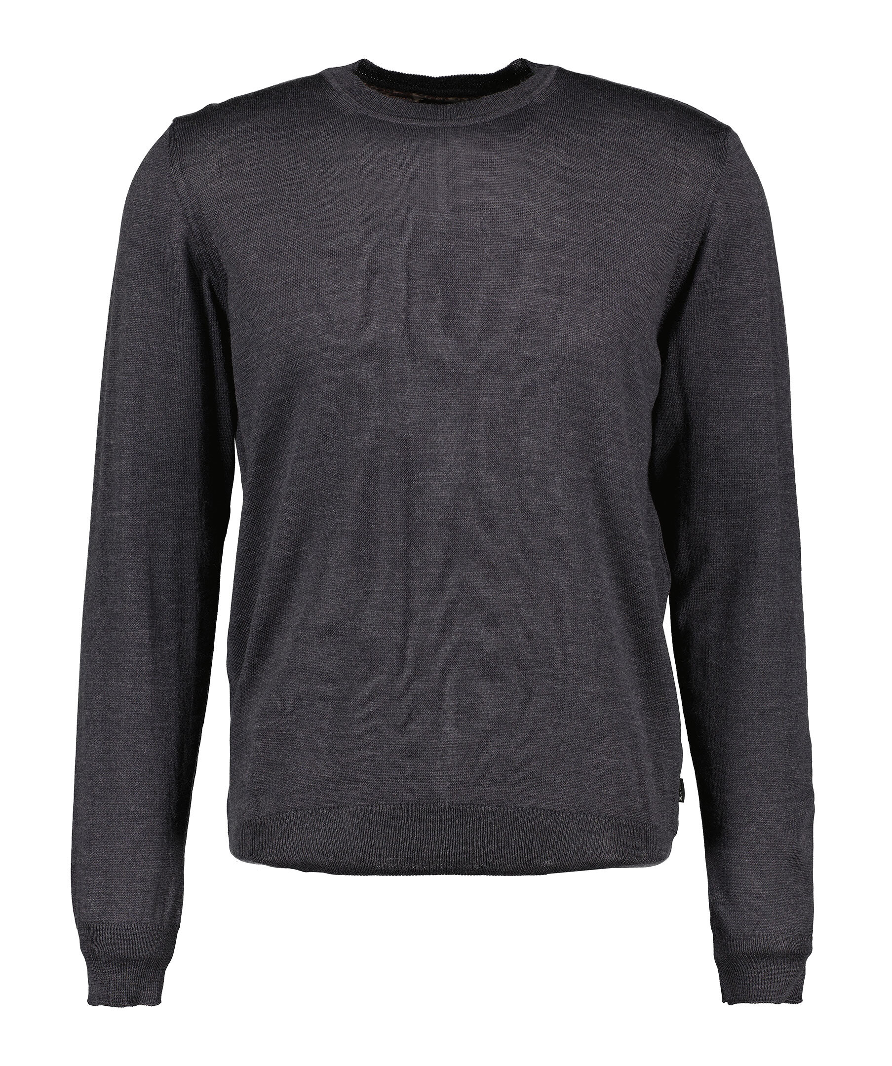 Mörkgrå, finstickad tröja från Sand. Tröjan har rund och ribbstickad halsringning samt ribbstickade muddar vid ärm- och plaggslut. Tillverkad i 100% merinoull.