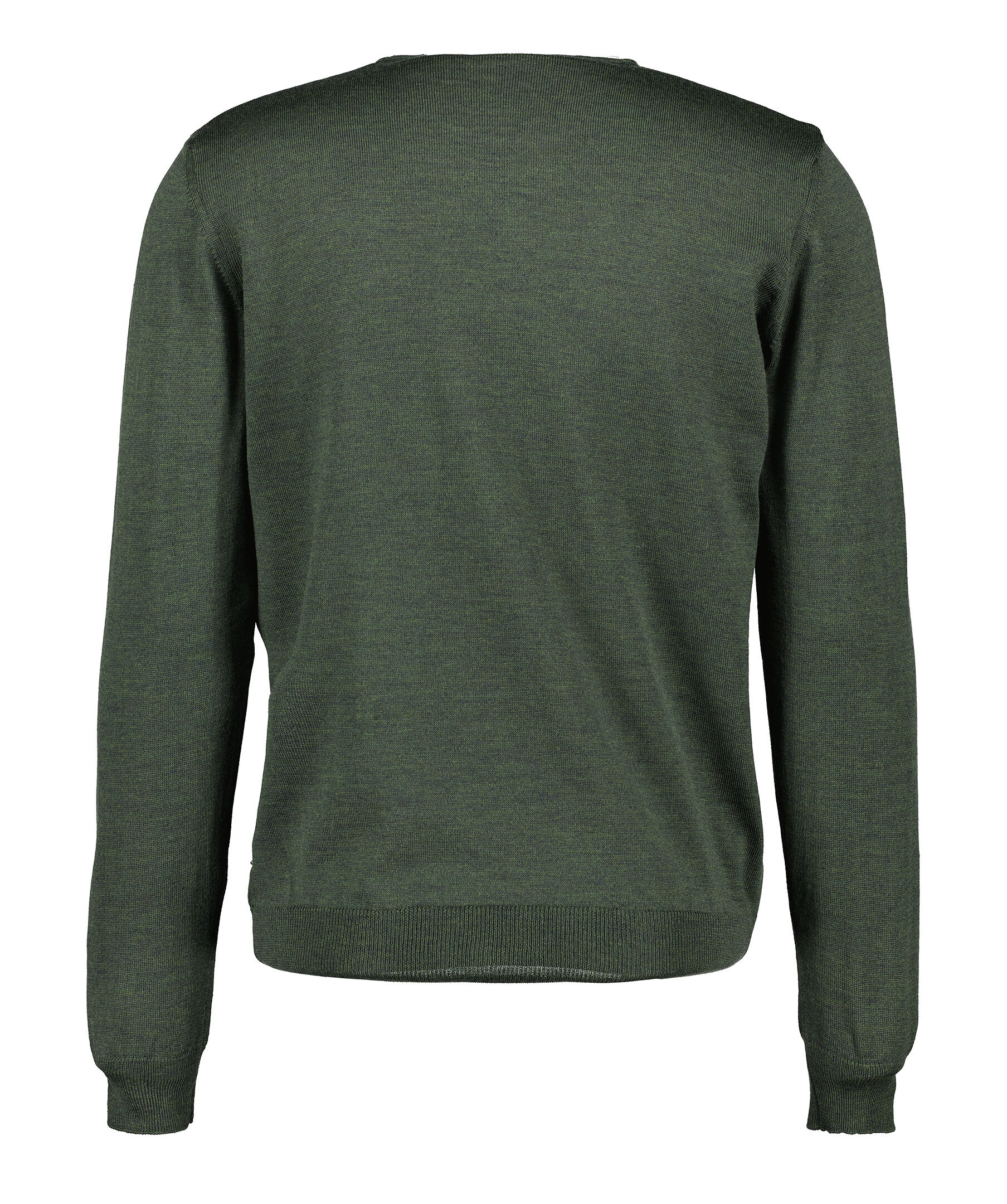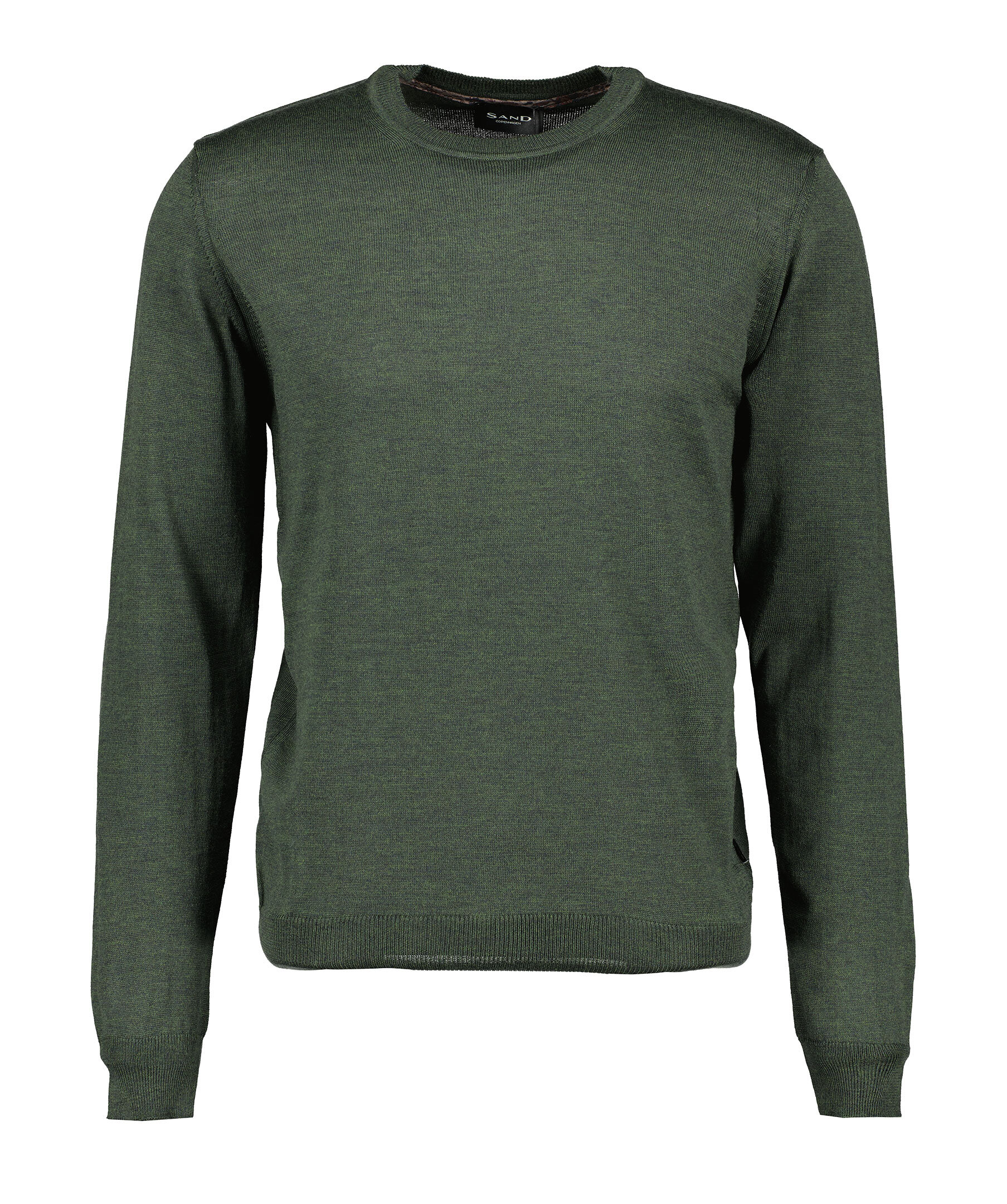 Skogsgrön, finstickad tröja från Sand. Tröjan har rund och ribbstickad halsringning samt ribbstickade muddar vid ärm- och plaggslut. Tillverkad i 100% merinoull.