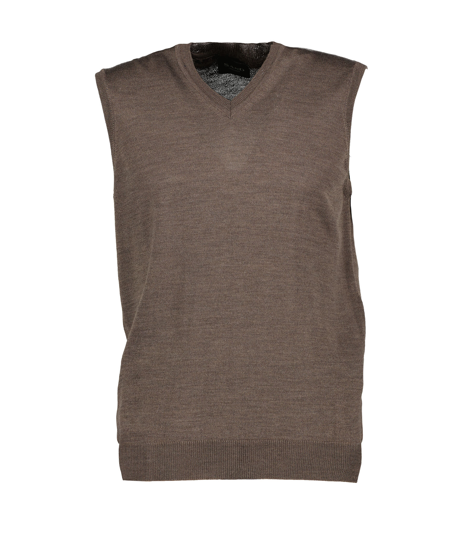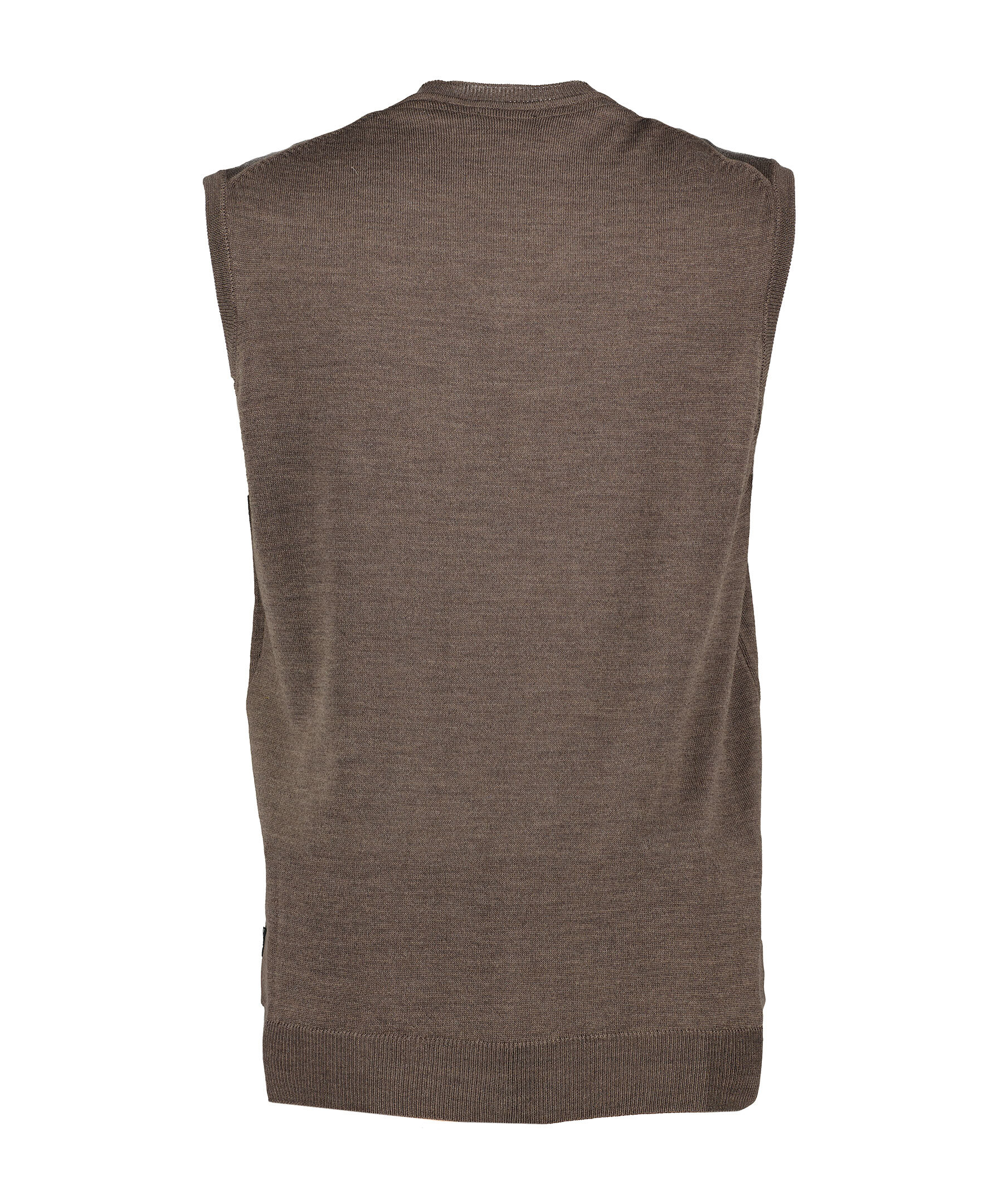 Brun finstickad väst från Sand. Västen har en ribbstickad V-ringning samt ribbstickade avslut. Tillverkad av 100% merinoull.