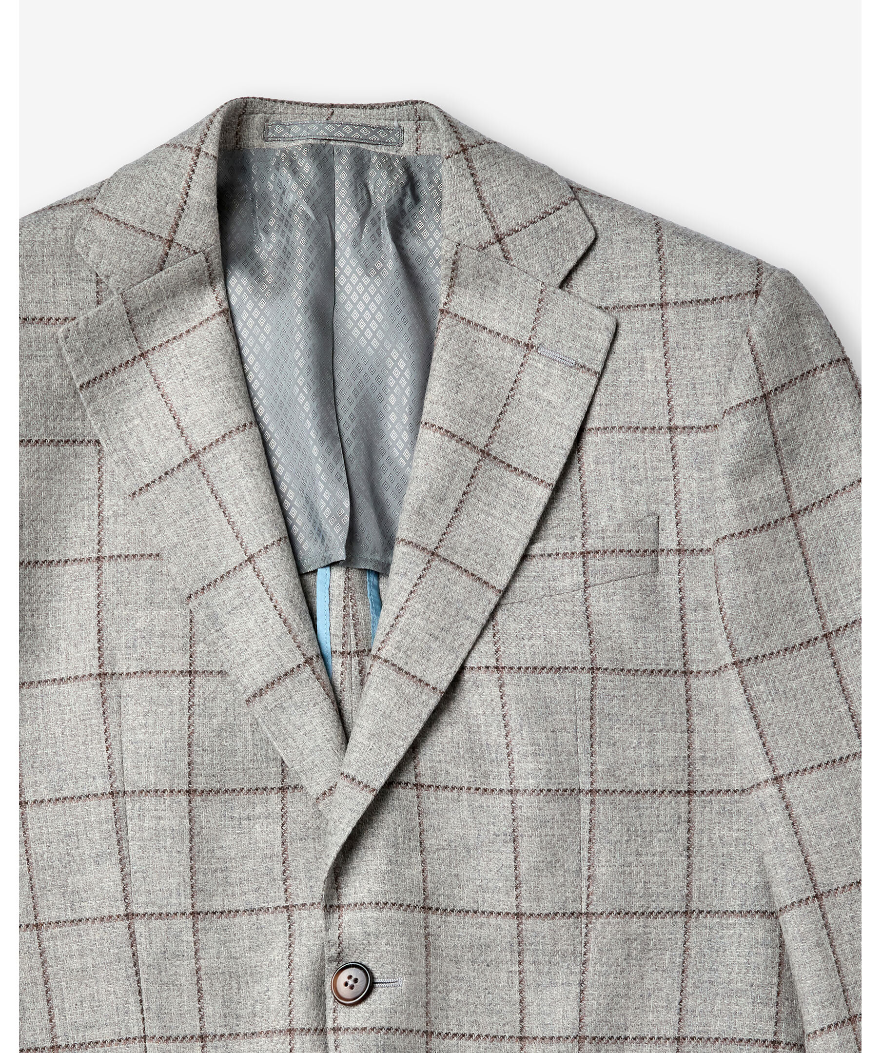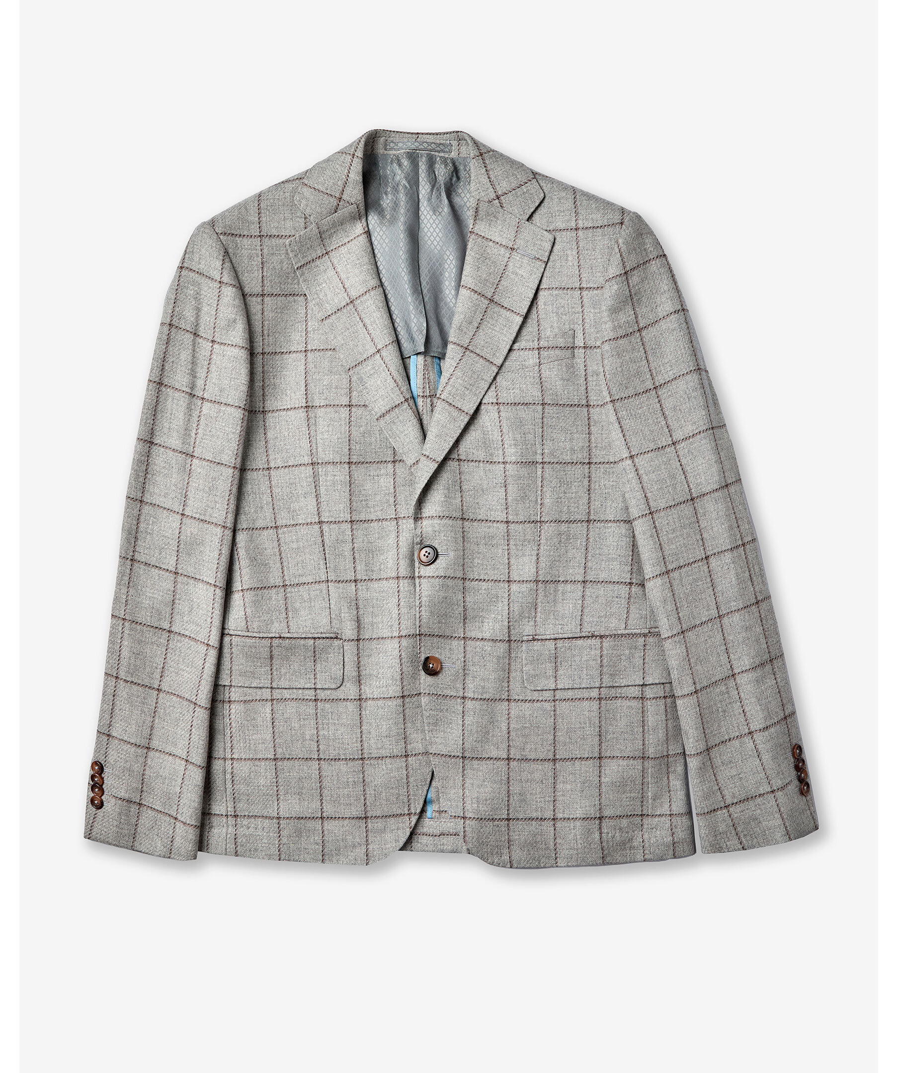 Ljusgrå, rutig kavaj från Sand. Kavajen stängs med två knappar framtill och har två fickor med lock samt en passpoalficka på bröstet, och två innerfickor. Tillverkad i en ullblandning.