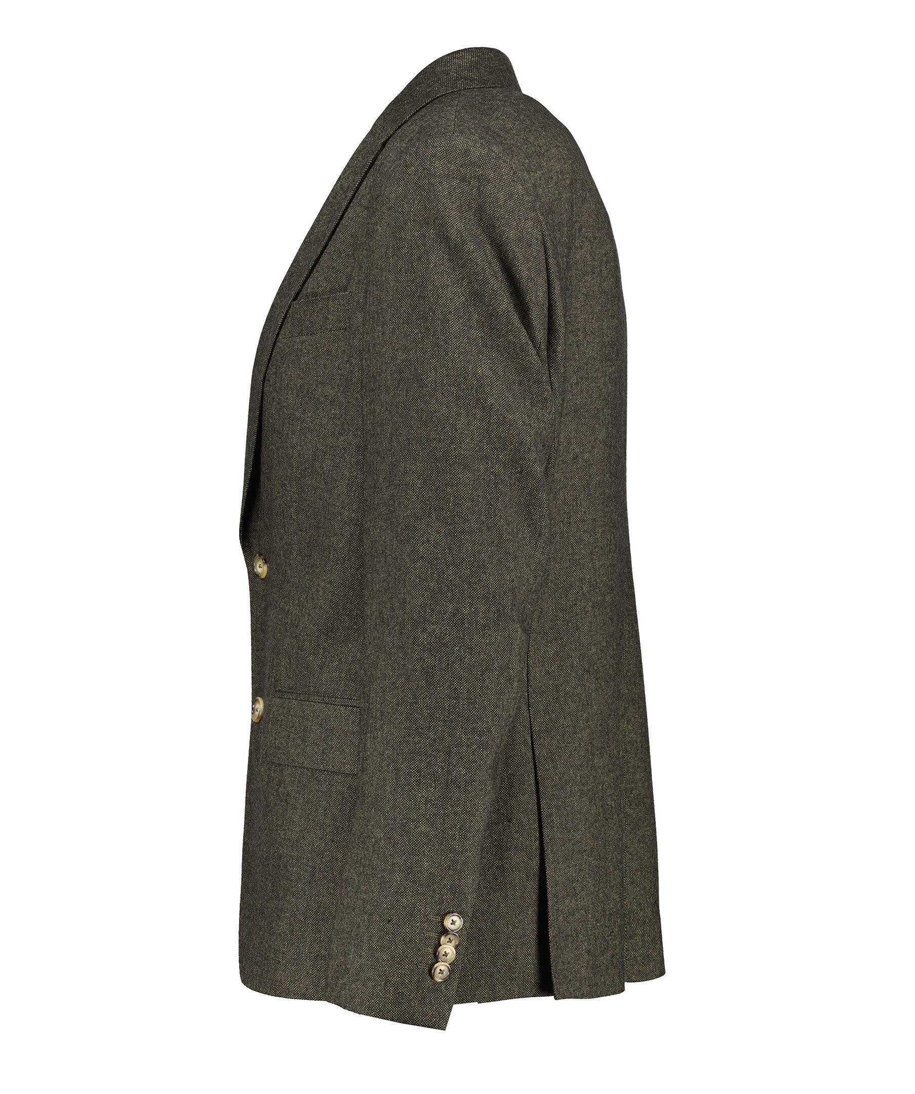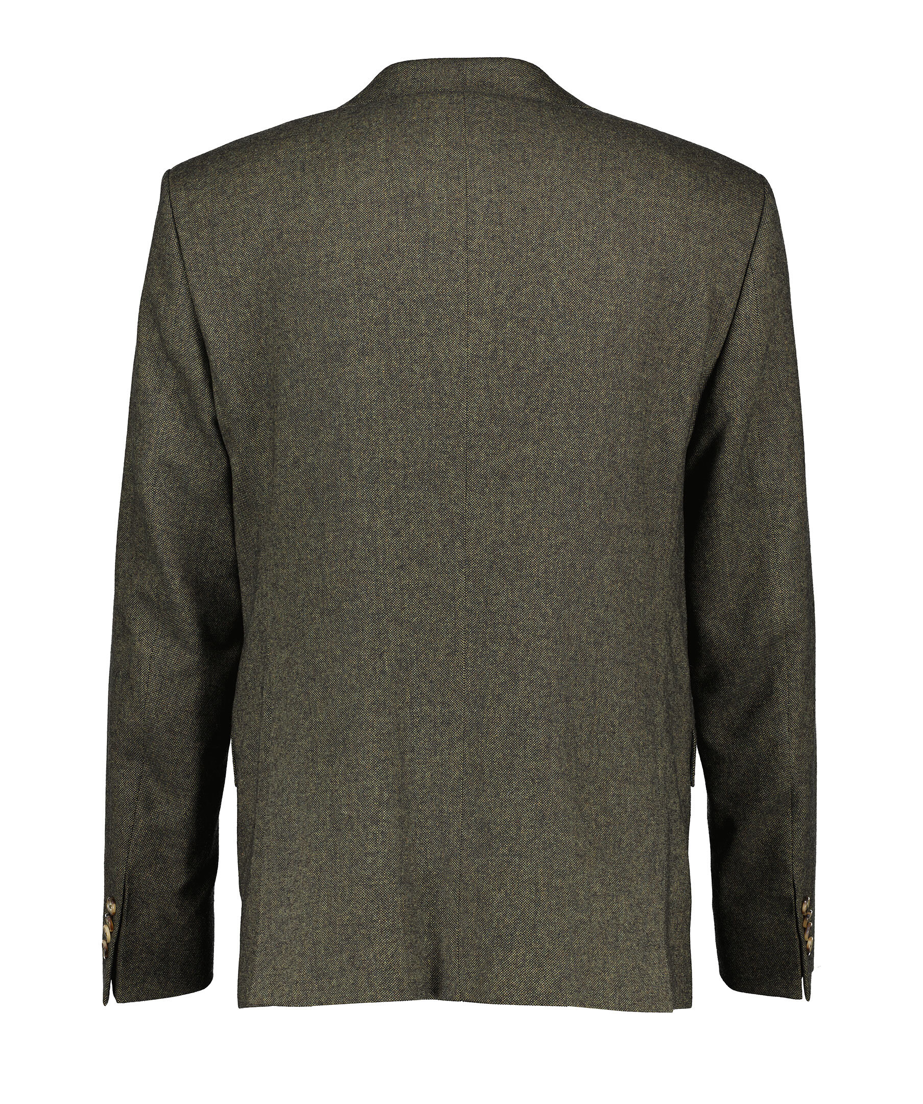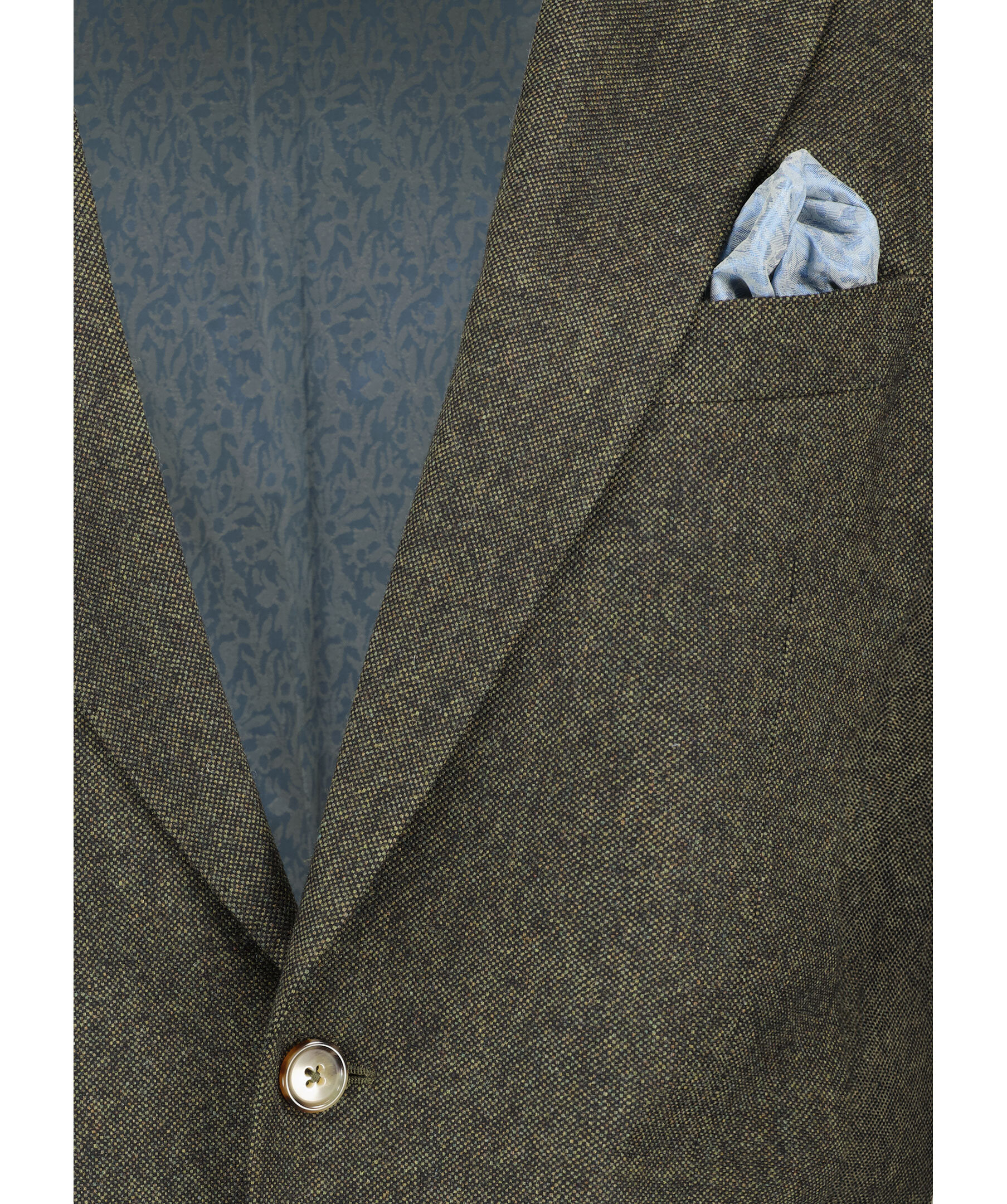 Olivgrön kavaj från Sand. Kavajen stängs med knappar framtill och har två fickor med lock samt en passpoalficka på bröstet, och tre innerfickor. Ljusblått mönstrat innerfoder. Tillverkad av 100% ull.