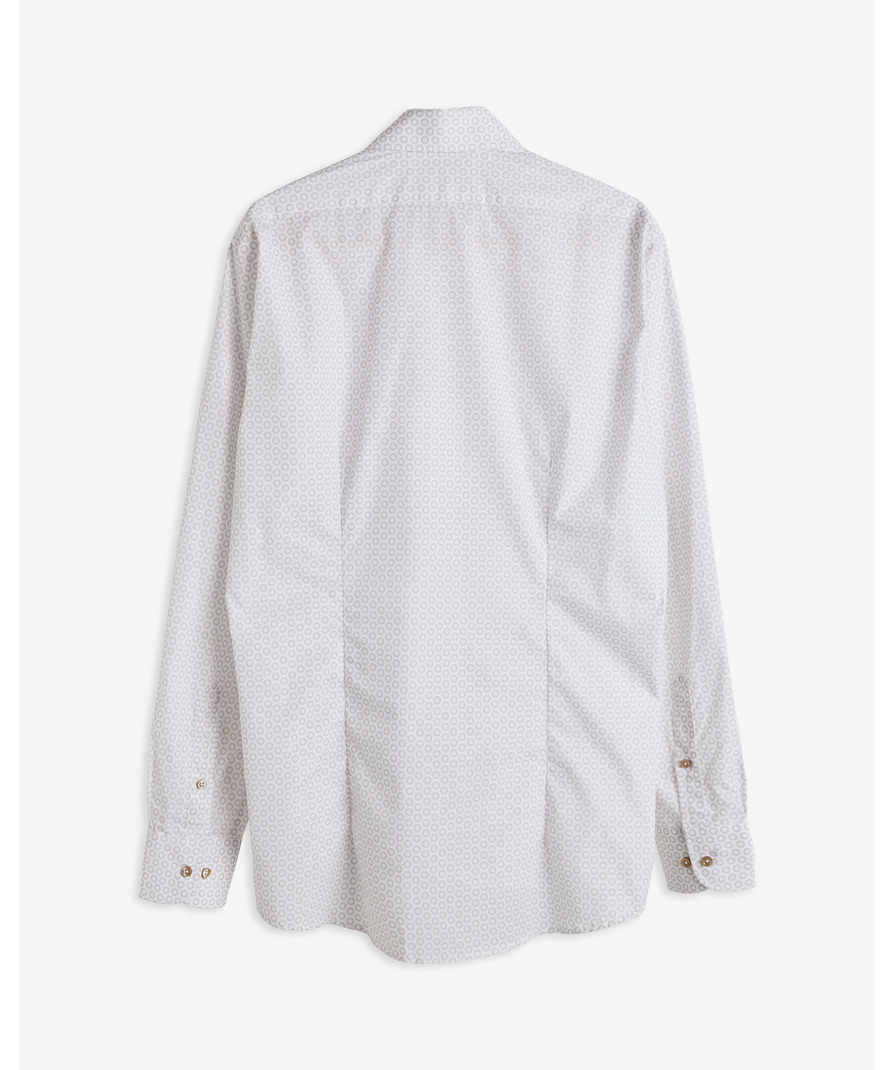 Stilren och mångsidig mönstrad skjorta från SAND. Tillverkad i en exklusiv blandning av 100% bomull, vilket ger en mjuk och bekväm känsla. Skjortan har en modern passform, något spetsig krage, två insnitt bak, justerbara enkla manschetter och är helt i italienskt vävt tyg med ett modernt "circles"-tryck på vit botten.
