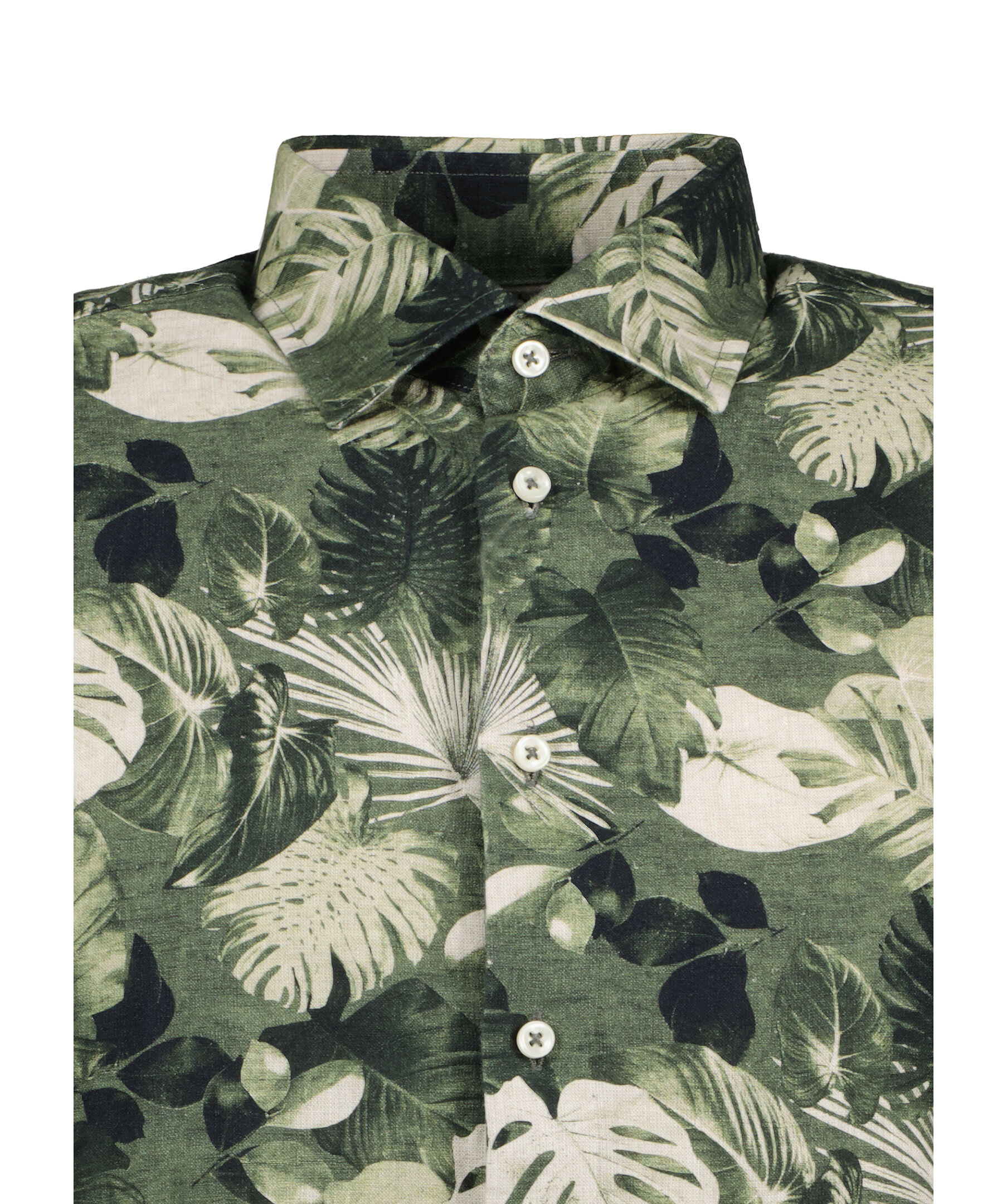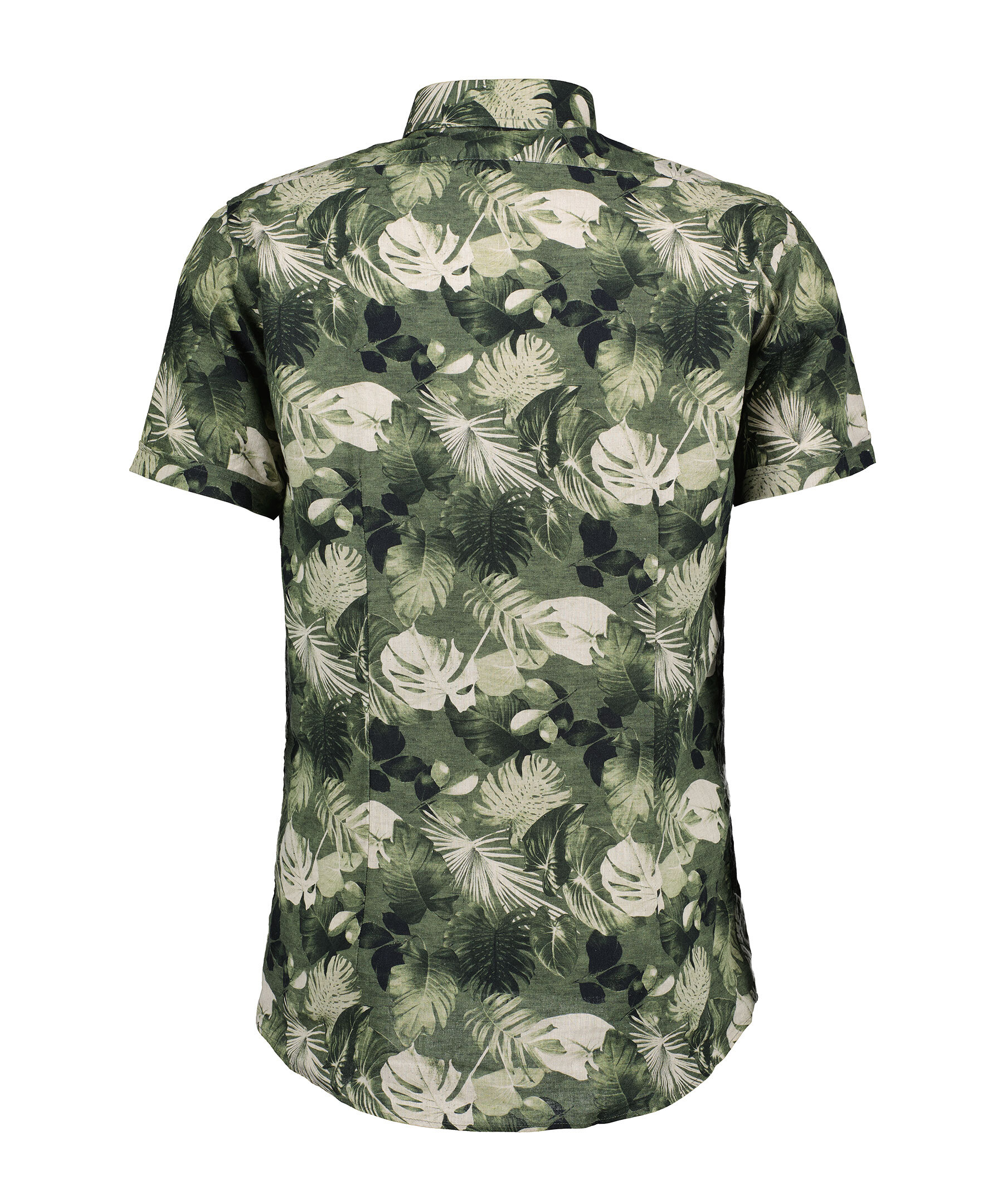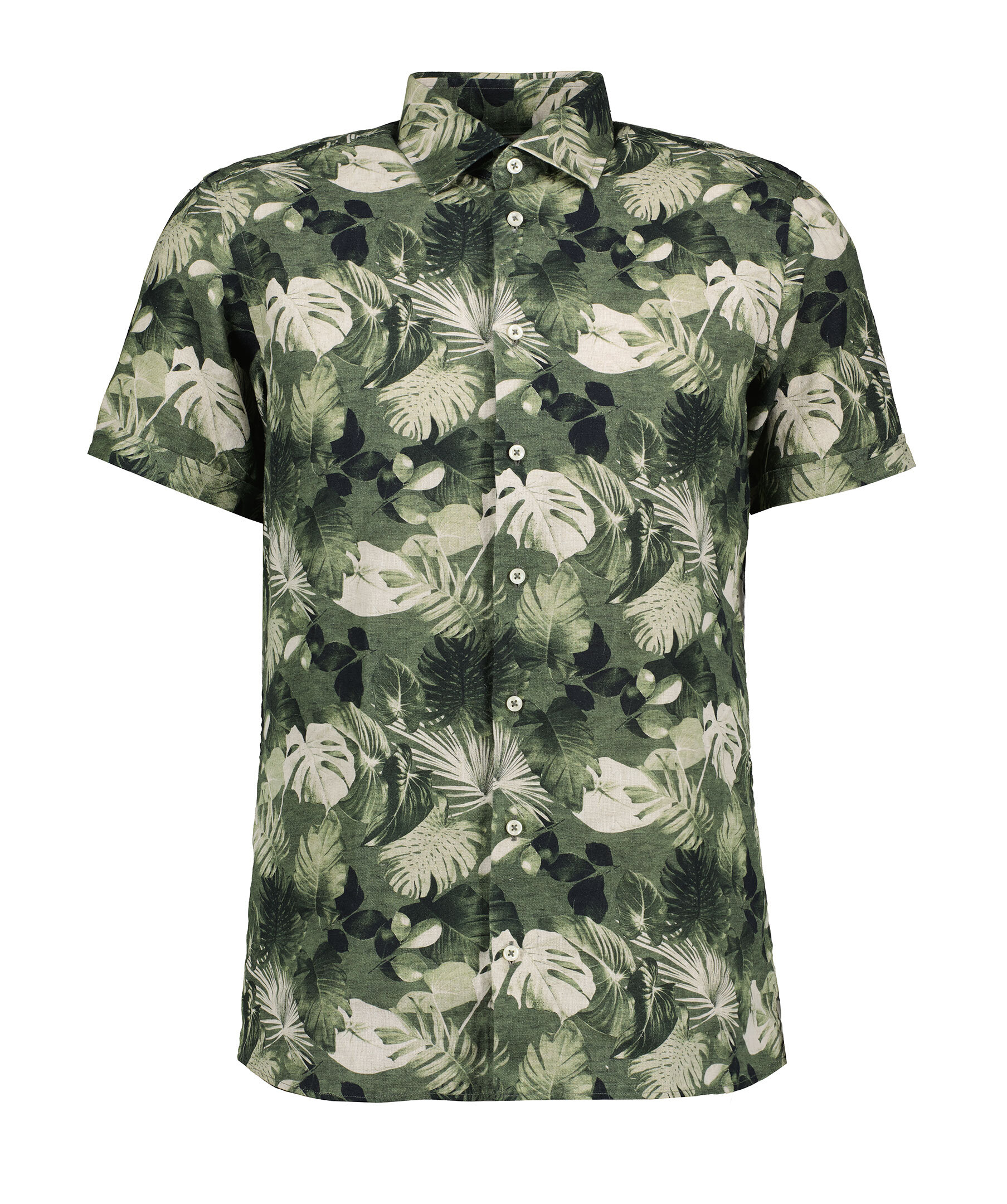 Grönmönstrad skjorta med bladmönster från Sand. Skjortan har korta ärmar och ett lätt rundat tröjslut. Tillverkad av en linneblandning.