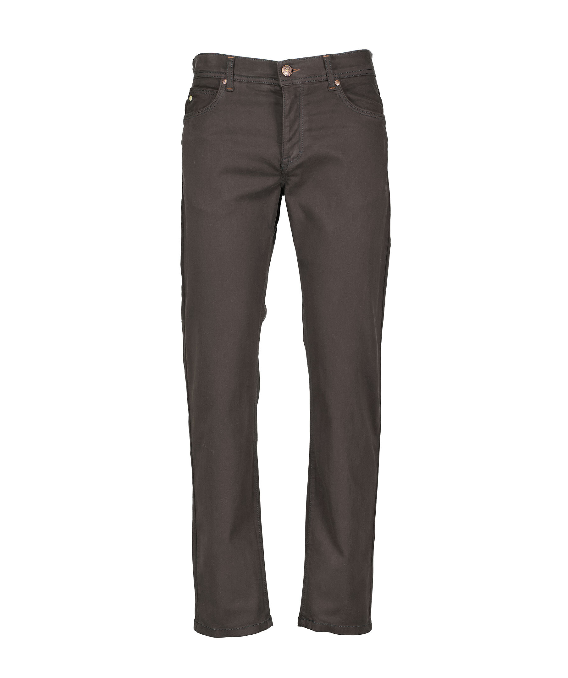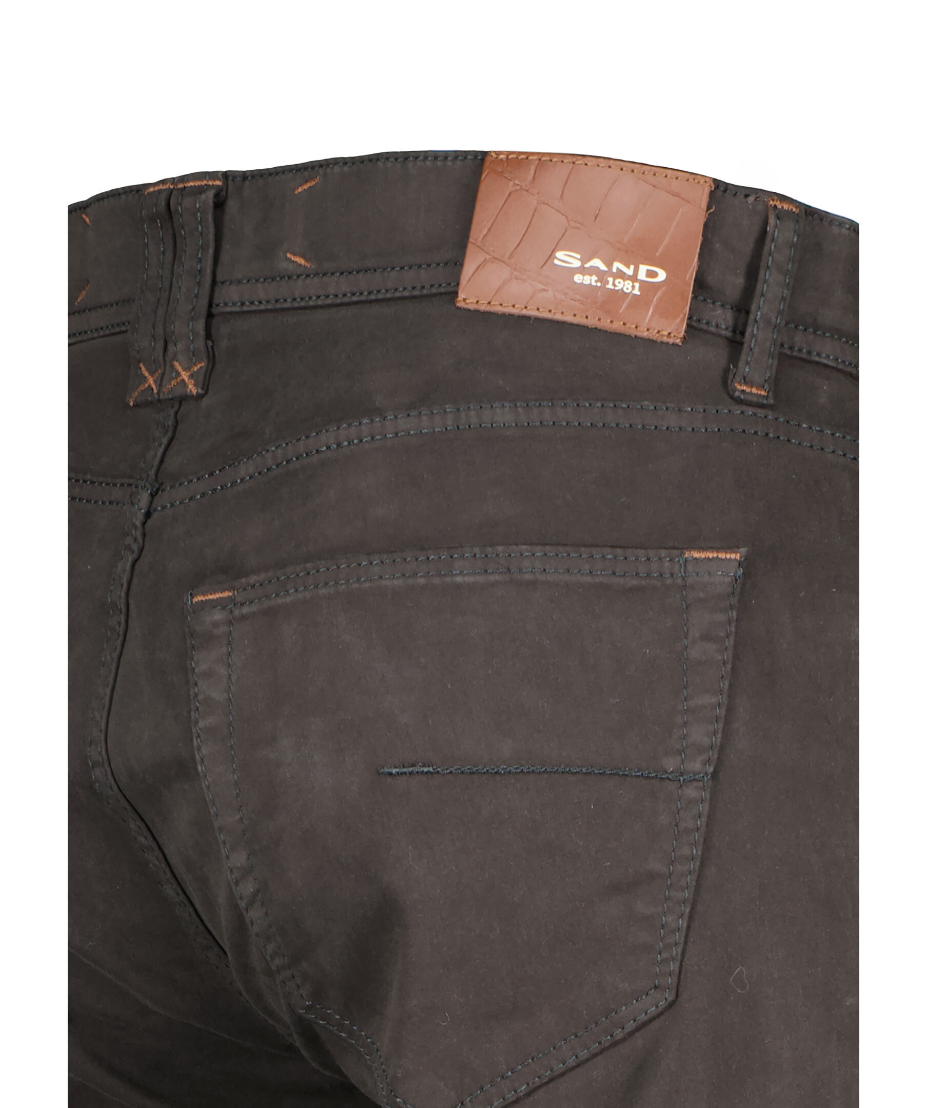 Mörkbruna jeans från Sand i modern fit. Byxorna har dragkedja med knapp, hällor för bälte. Framfickor, med myntficka, bakfickor samt läderdetalj bak på linningen med logotyp och bruna söm detaljer. Tillverkade av en bomullsblandning.