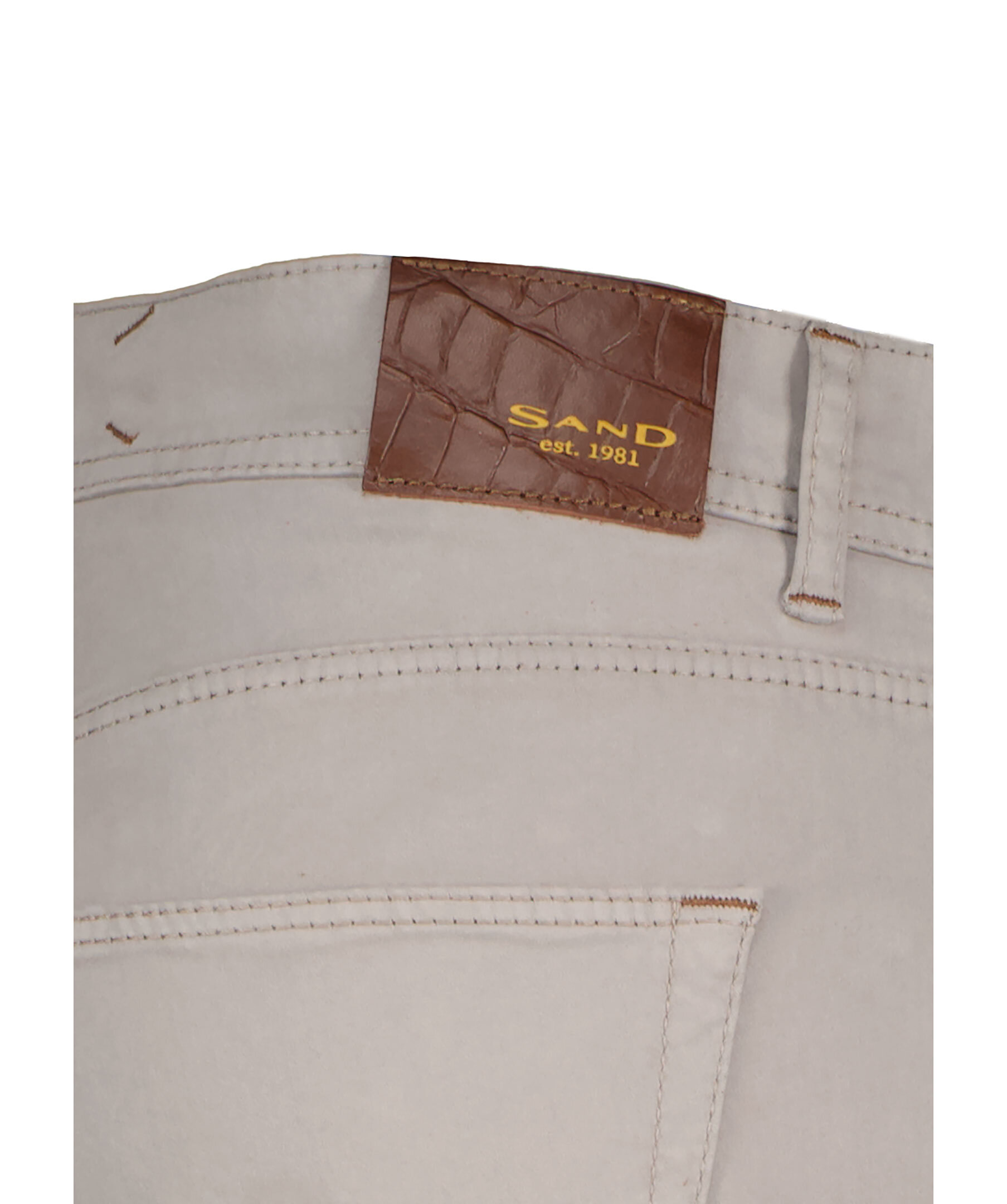 Gråa byxor i mocka från Sand. Byxorna har bälteshällor i midjan, fem fickor, dekorativa sömmar på bakfickorna och patch med logotyp på linningen. Tillverkade i en bomullsblandning.
