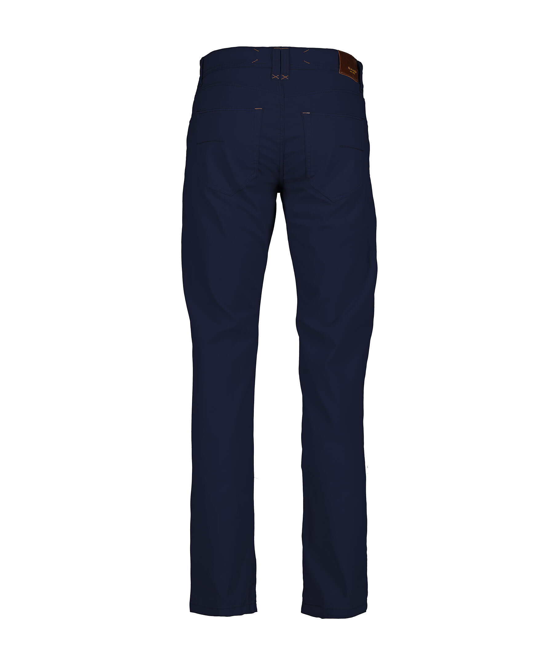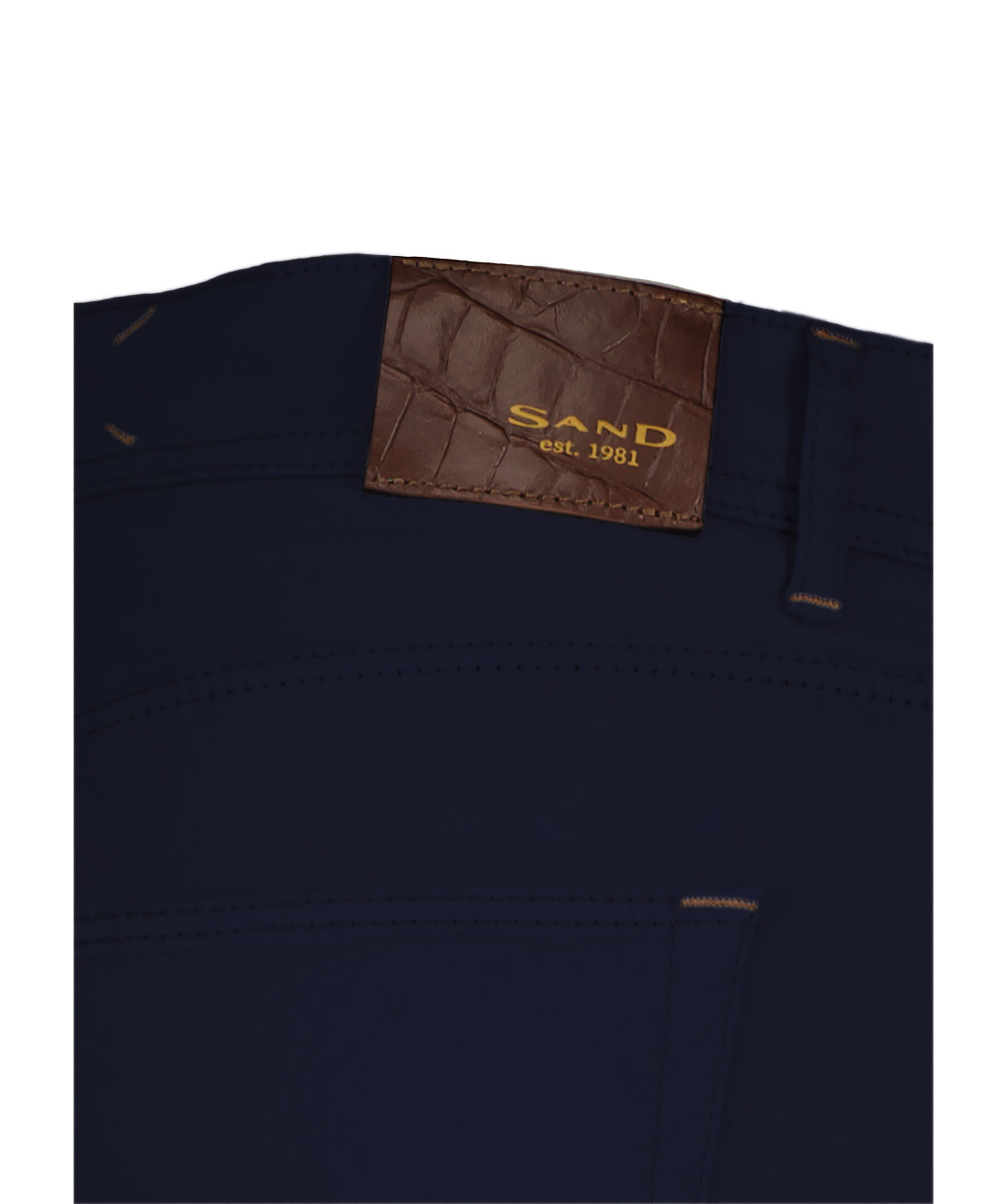 Mörkblåa byxor i mocka från Sand. Byxorna har bälteshällor i midjan, fem fickor, dekorativa sömmar på bakfickorna och patch med logotyp på linningen. Tillverkade i en bomullsblandning.