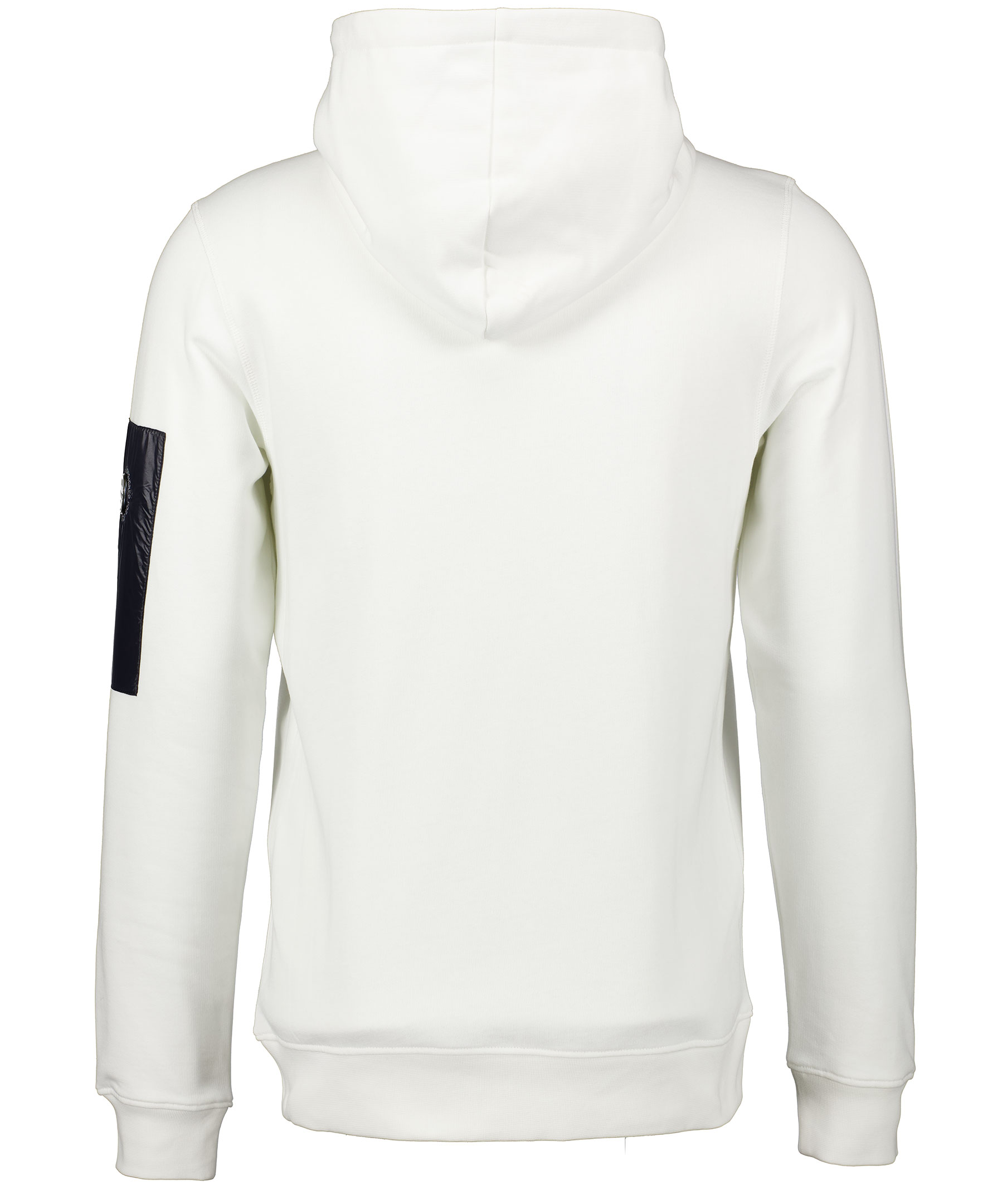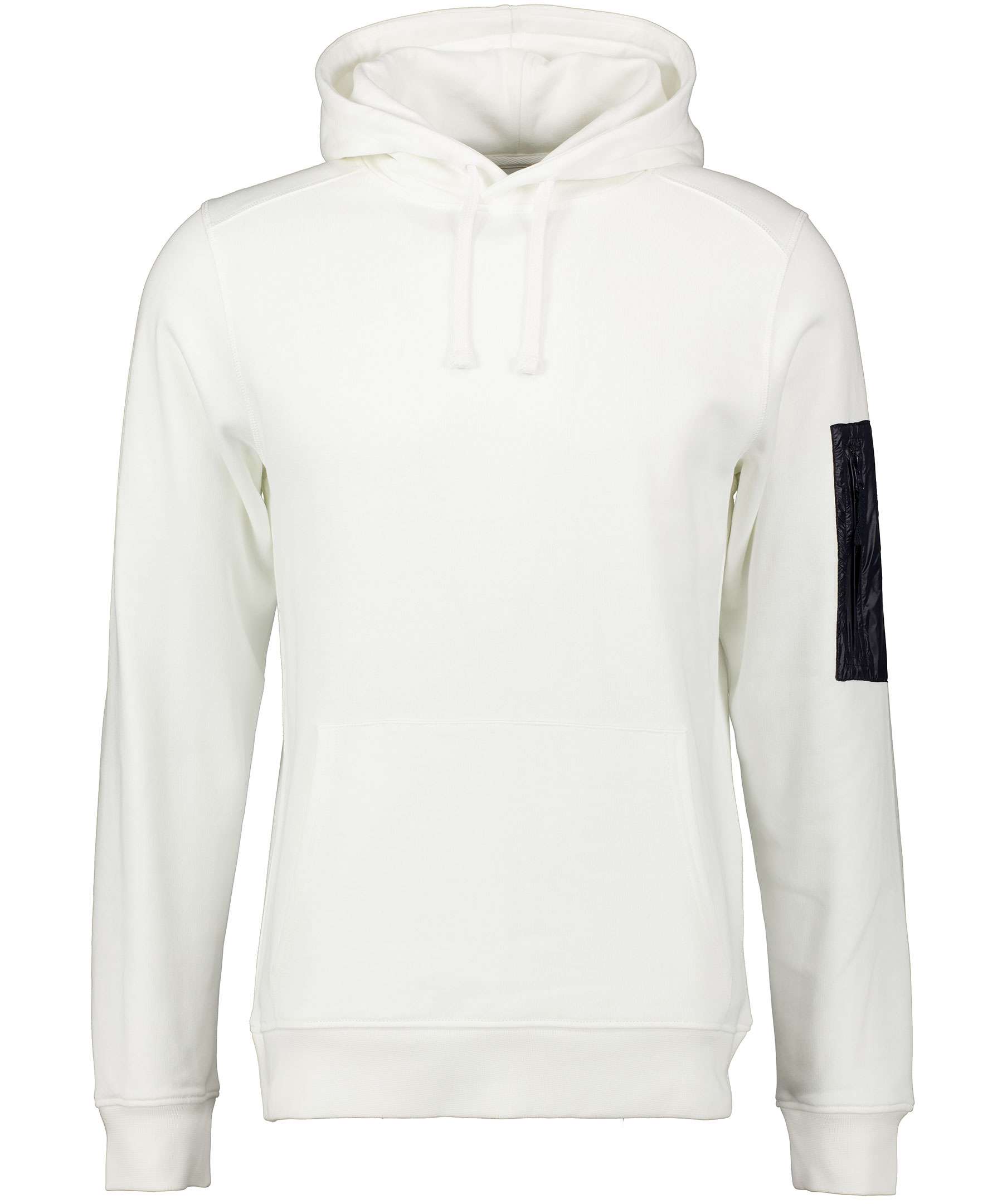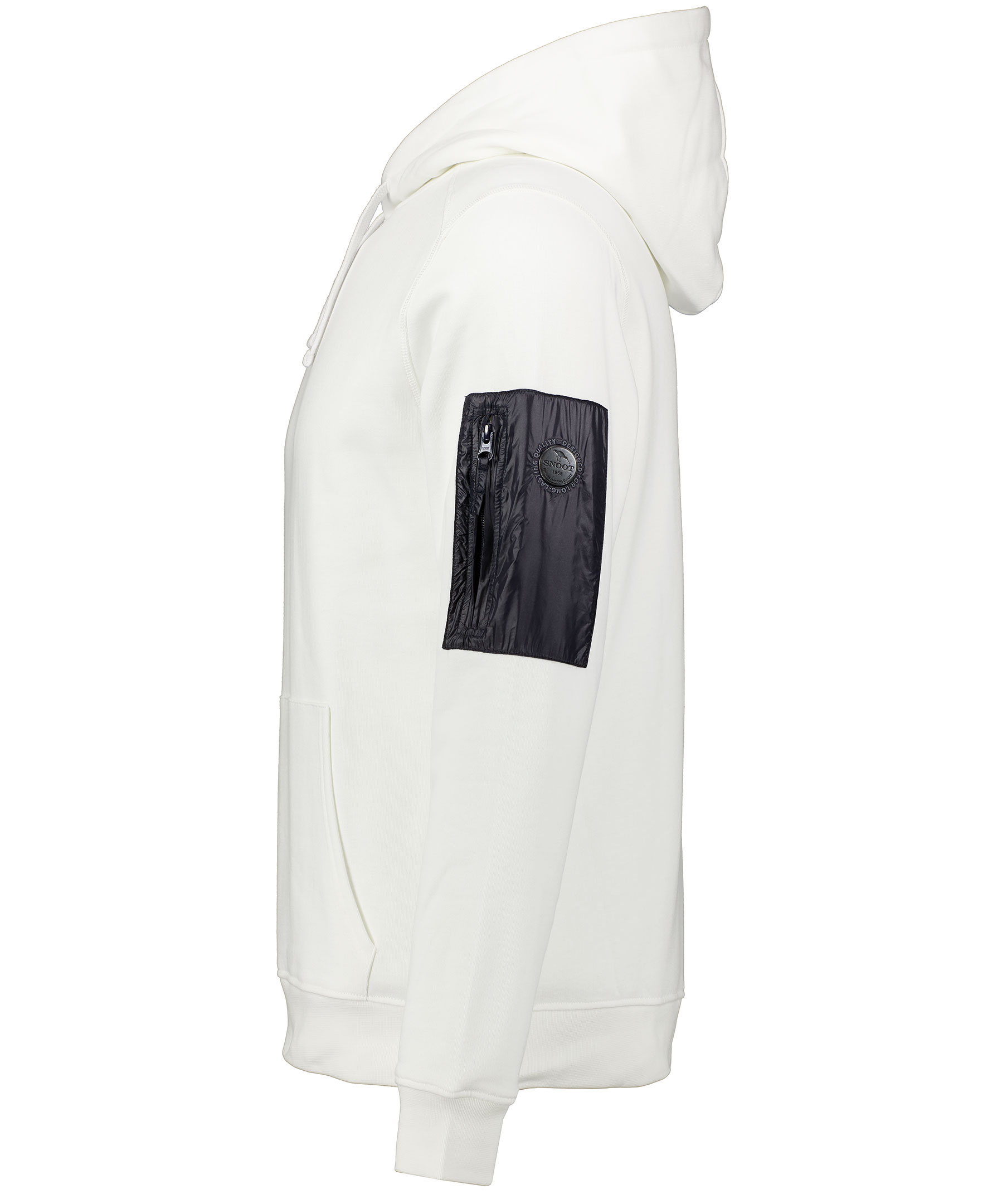 Vit hoodie från Snoot. Tillverkad i 100% bomull. Ficka och logotyp på vänster över ärm. Ribbade muddar och en mjuk borstad insida. Dragsko i luva och ficka på magen.