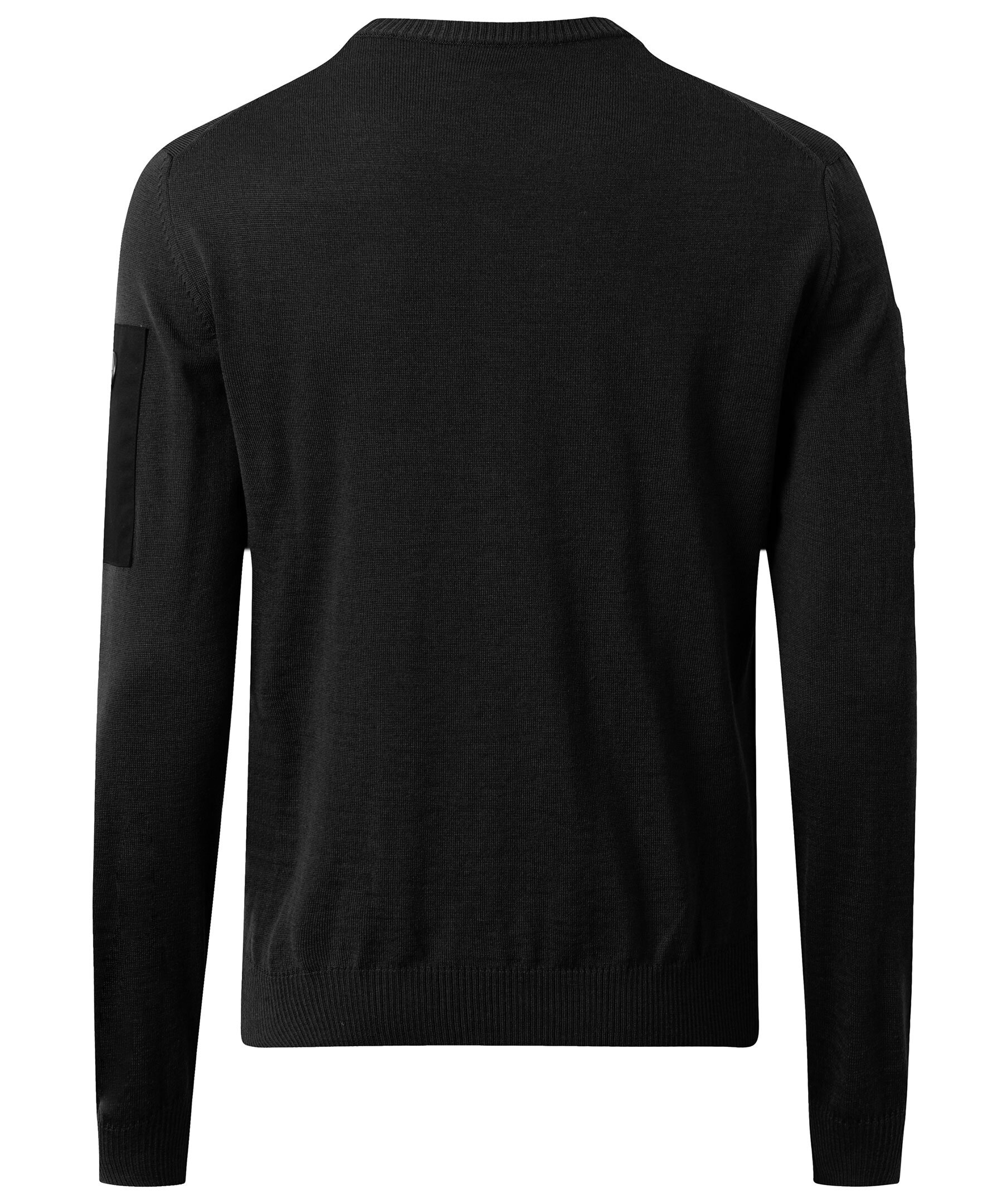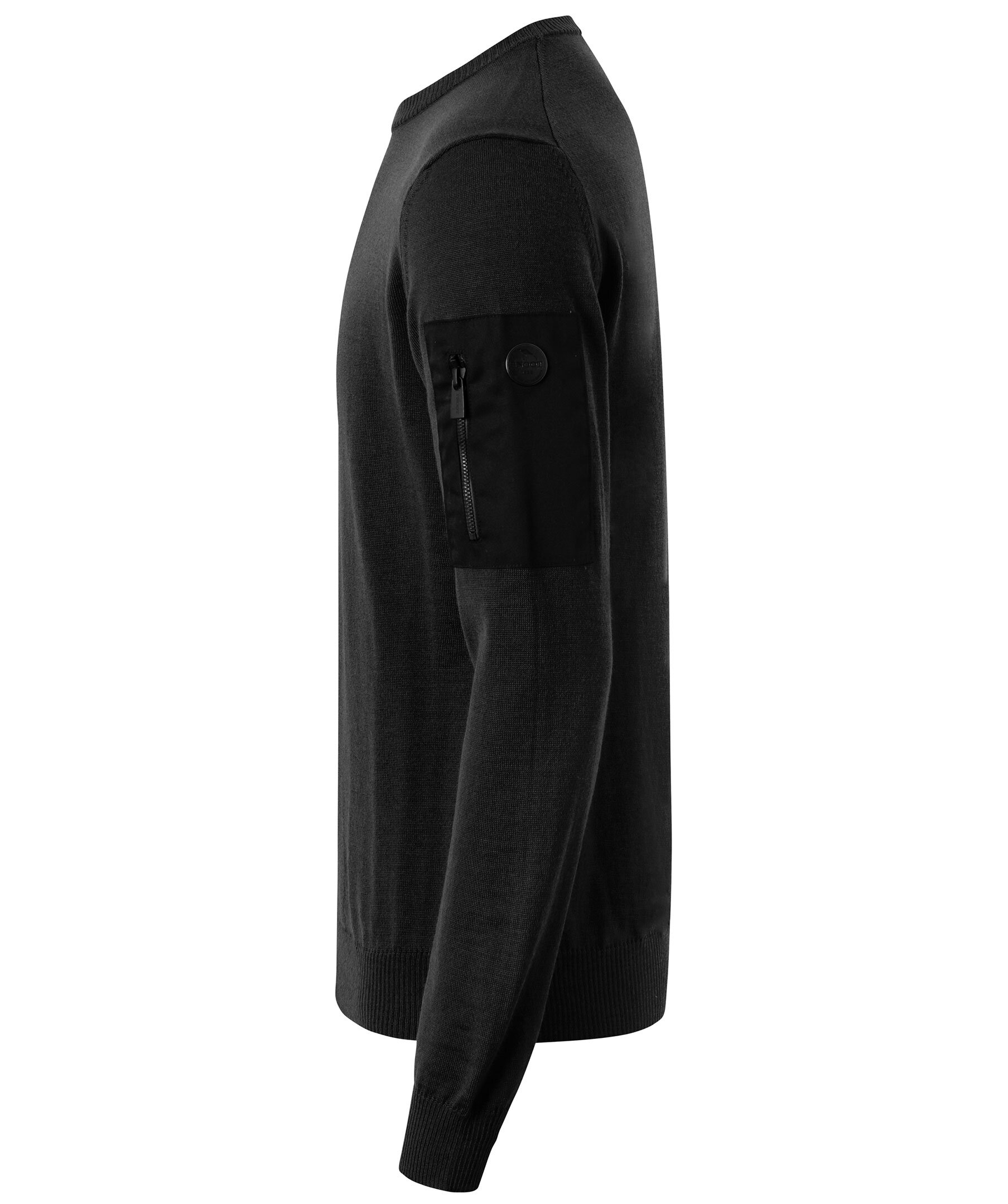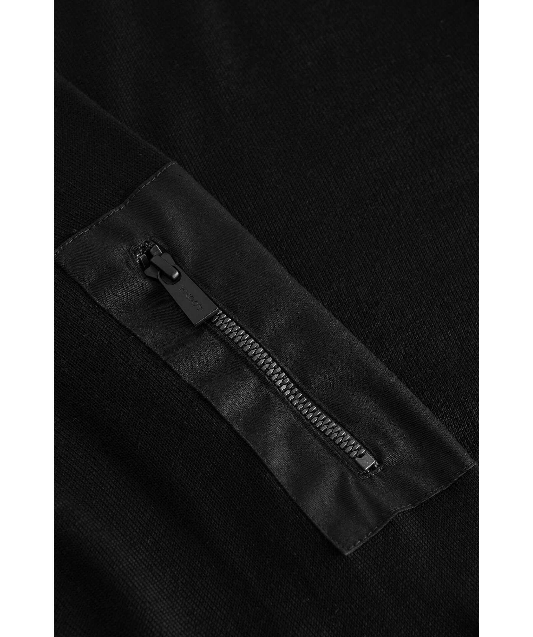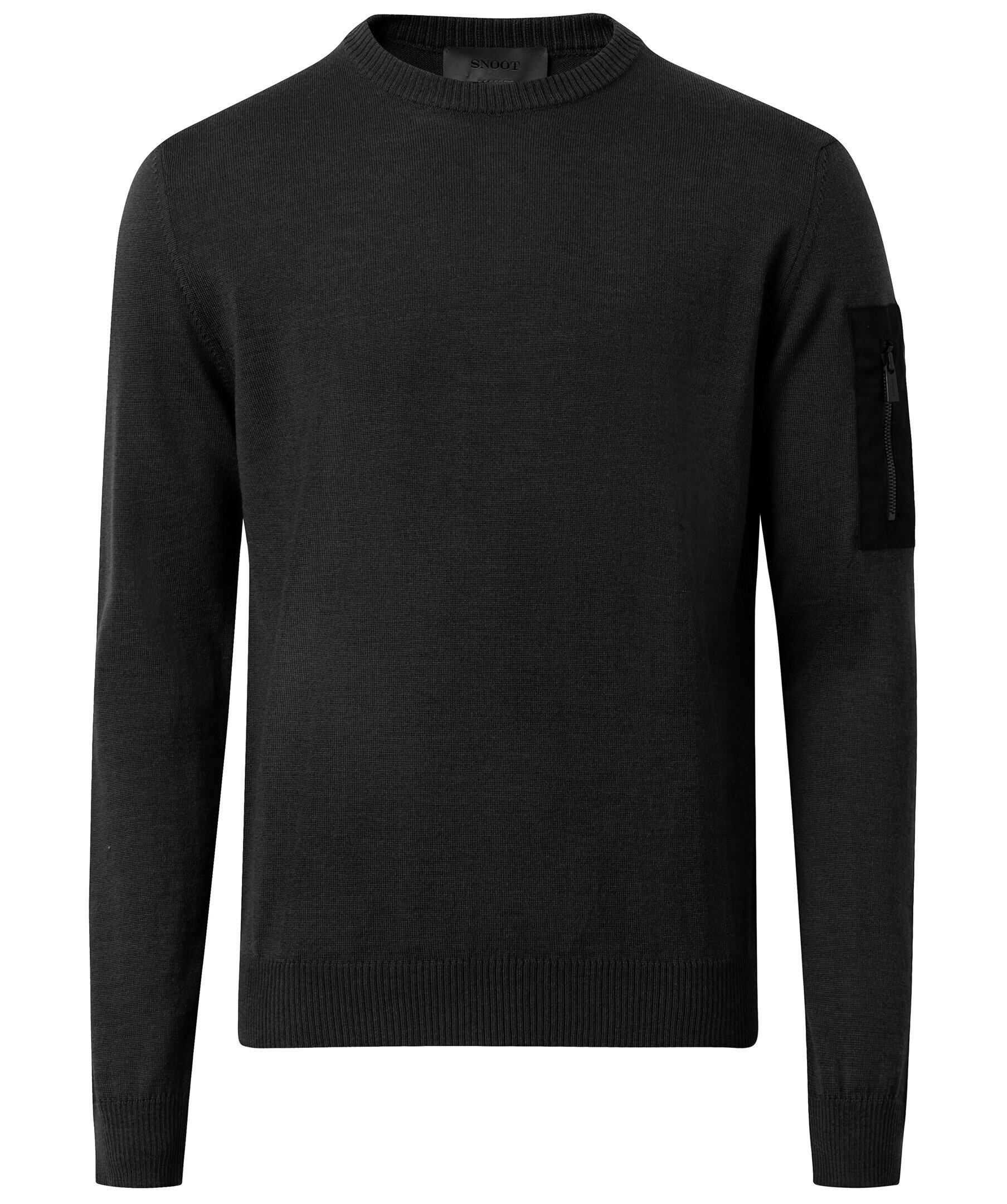 Svart finstickad tröja från Snoot. Tillverkad i 100% merinoull. Ribbstickad halsringning, ficka med blixtlås och logga på vänster ärm.