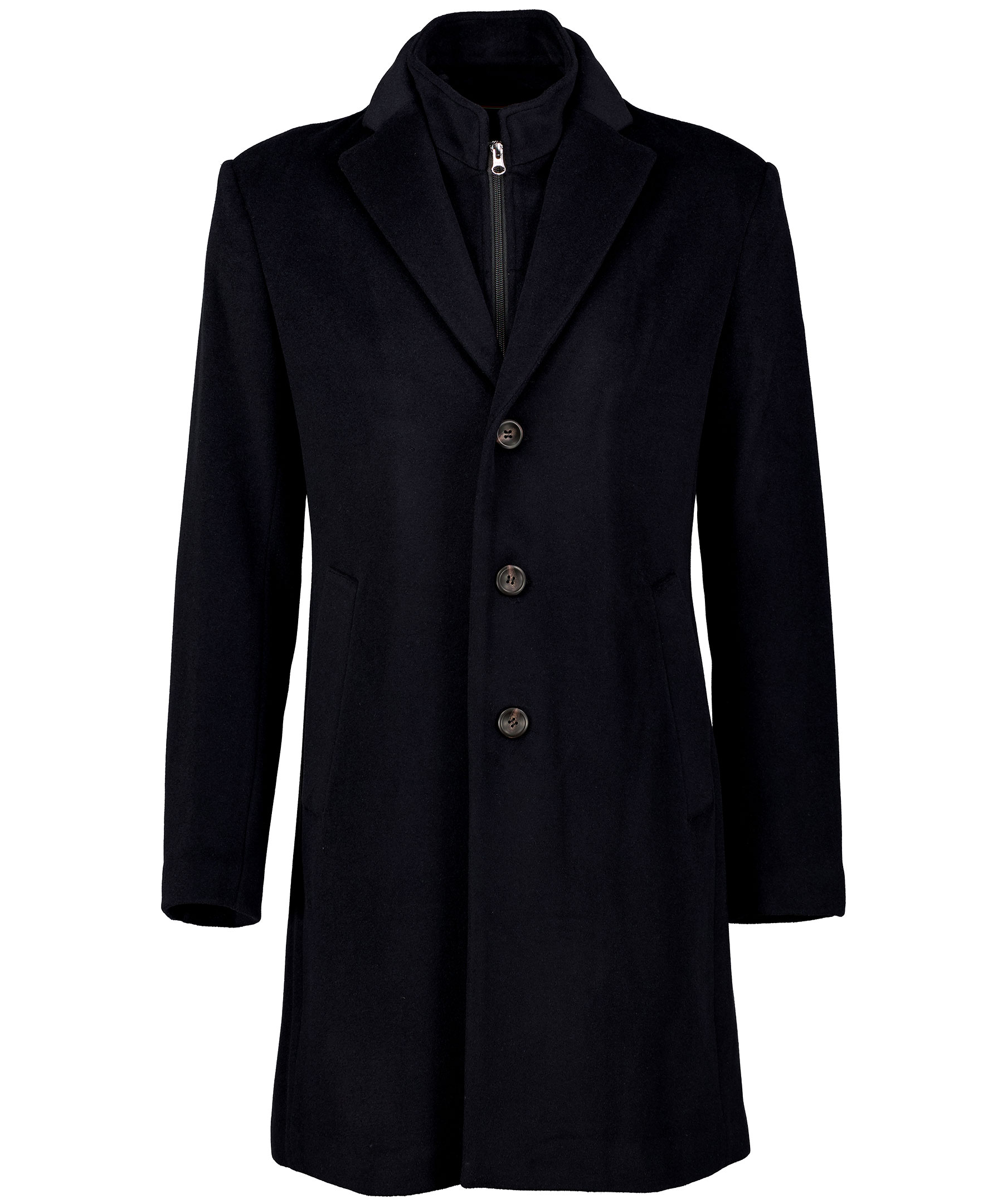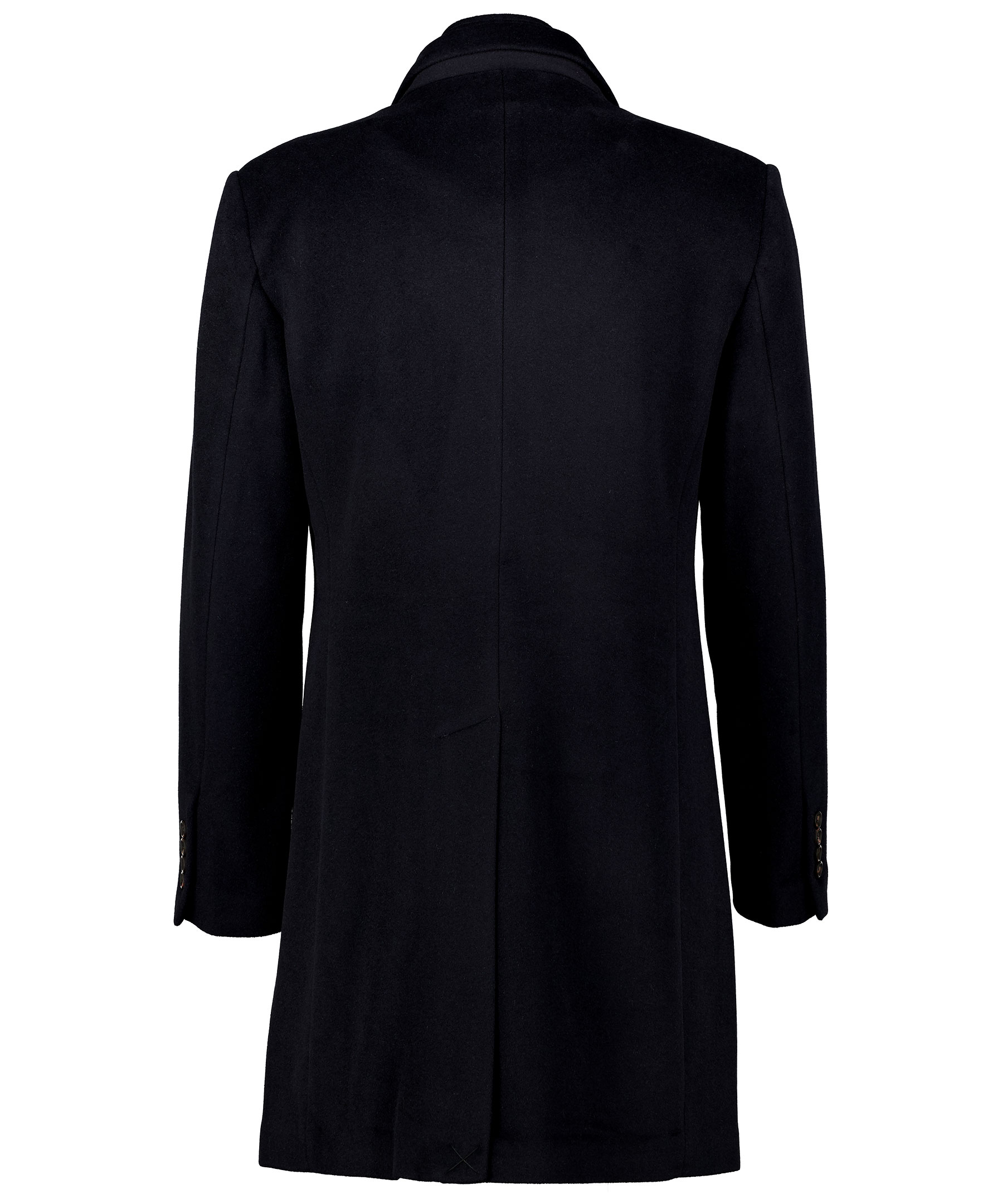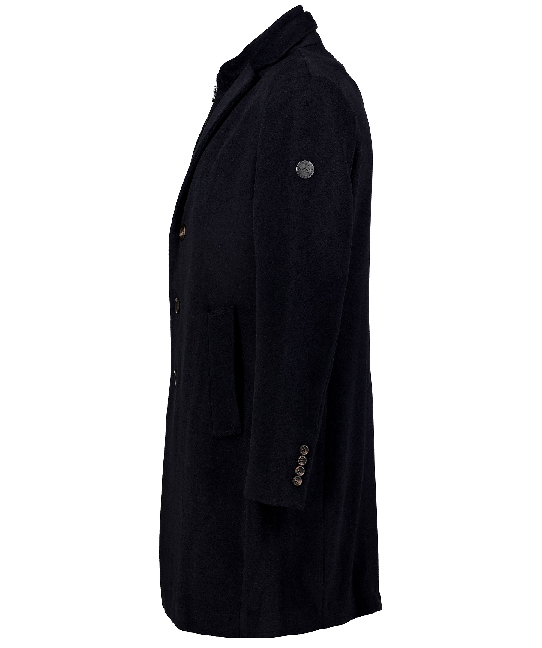 Svart lång rock från Snoot. Tillverkad i en mjuk blandning av ull och kashmir. Rocken har en avtagbar förstärkt krage som fortsätter ner mot bröstet. Två snedställda framfickor och två innerfickor. Jackan stängs med tre knappar framtill. Sprund baktill och logotyp i metall på vänster överärm.