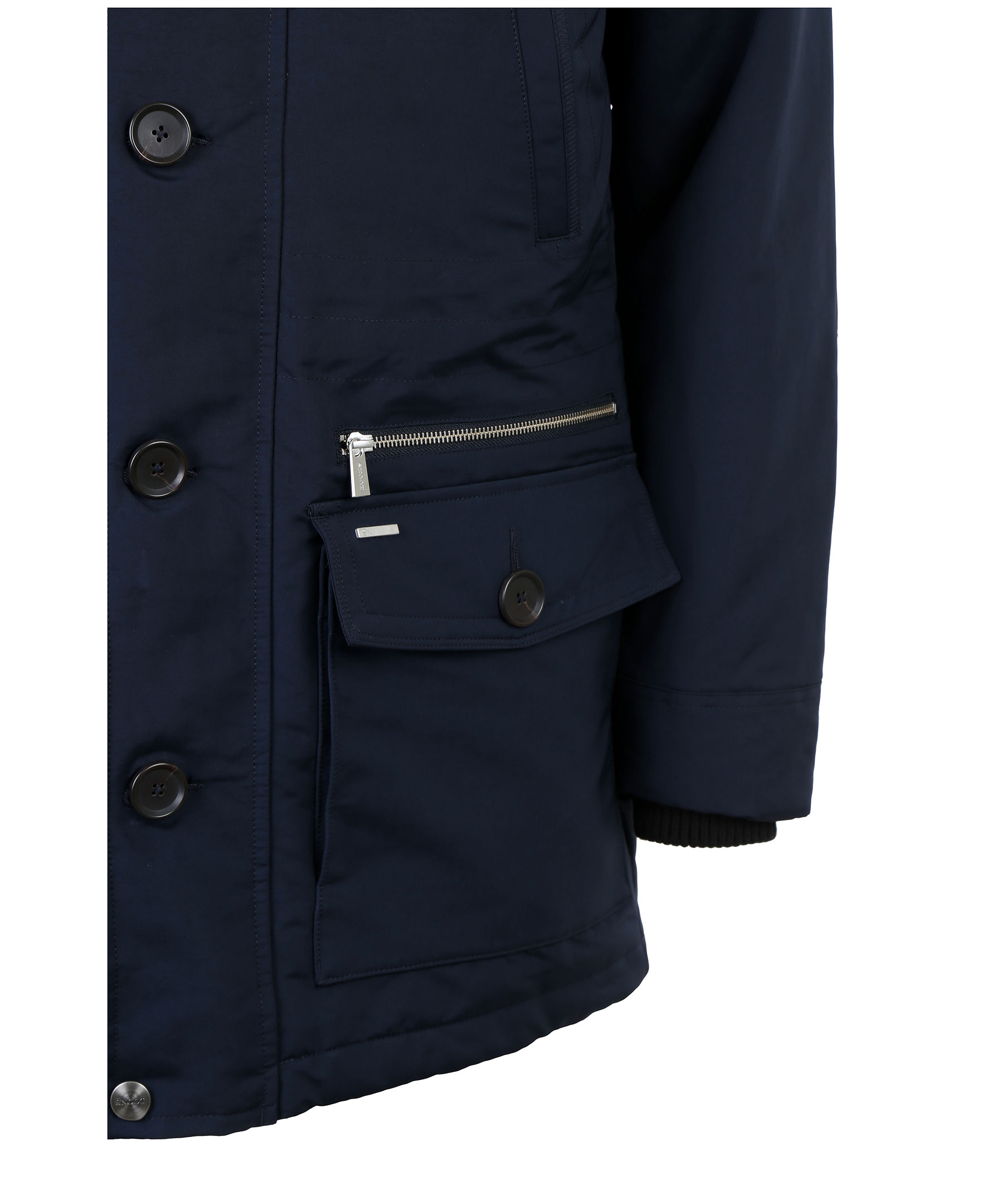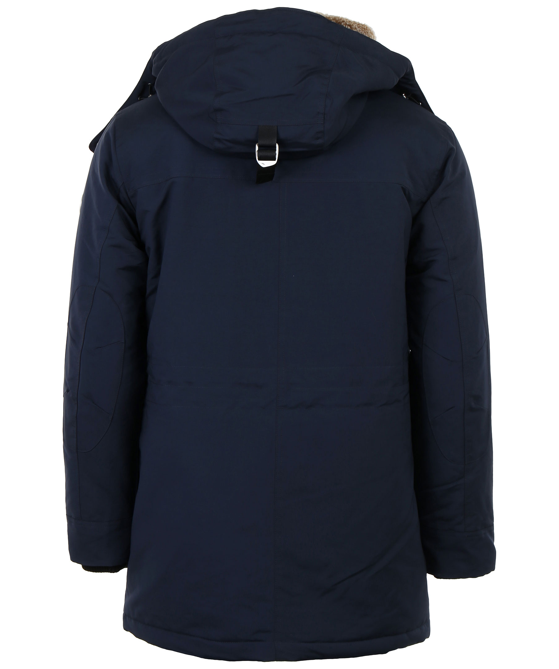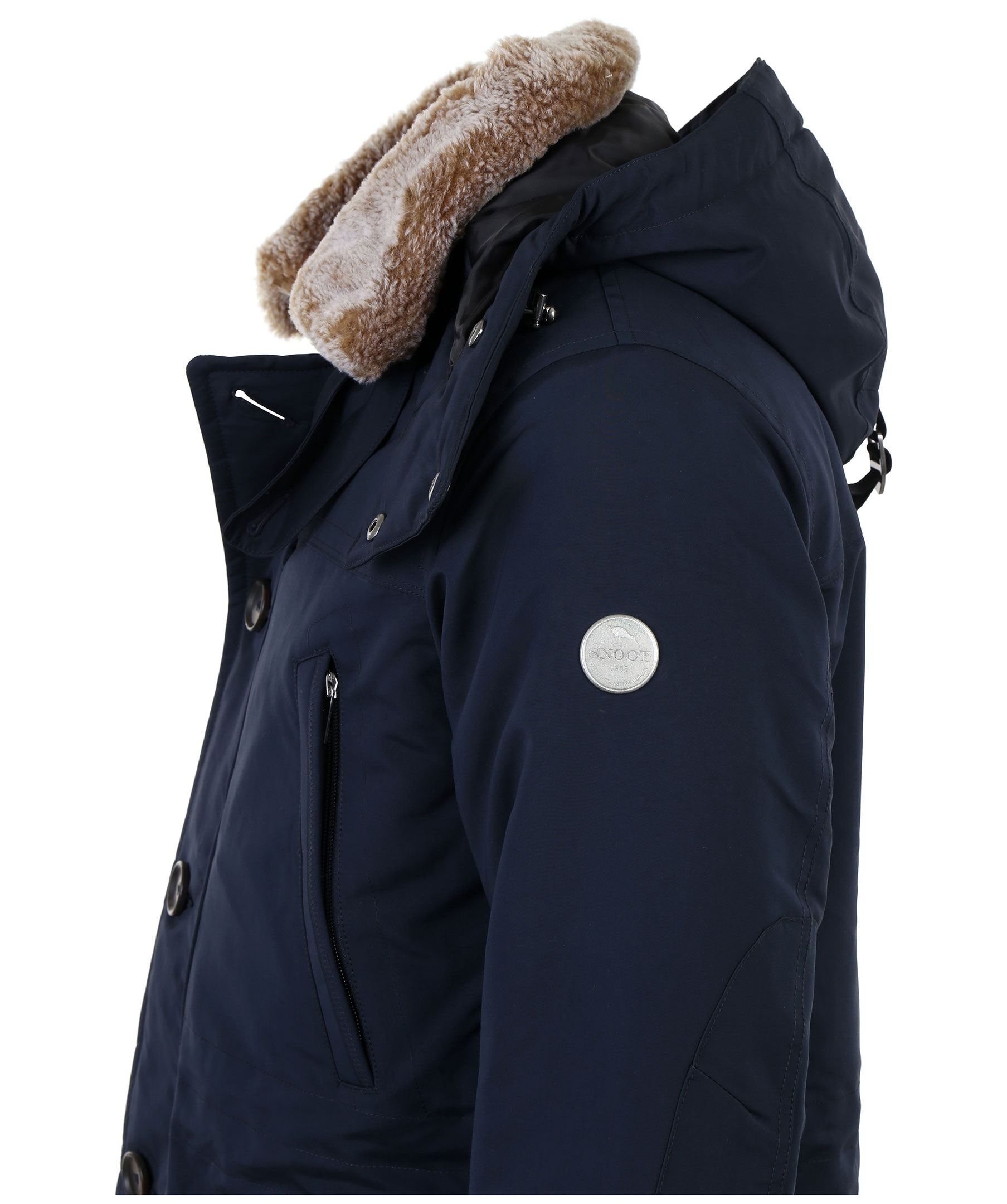 Mörkblå dunparkas från Snoot i vattenavstötande polyester. Jackan har sex praktiska fickor fram samt en innerficka. Reglerbar luva och krage i syntetpäls. Jackan stängs med dragkedja samt grova knappar. Dragsko i midjan och rund metallbricka med logotyp på vänster ärm.