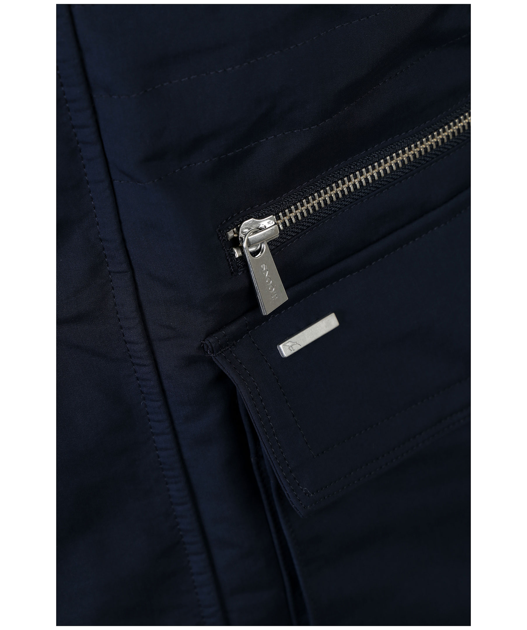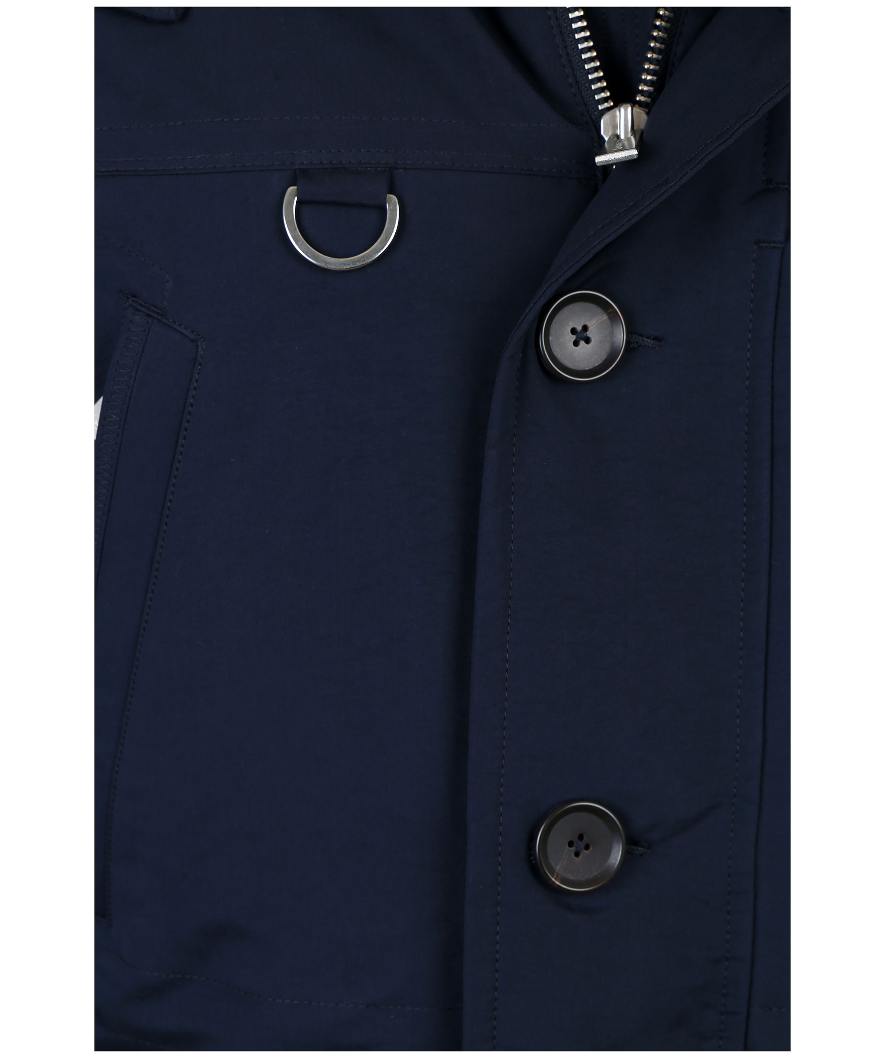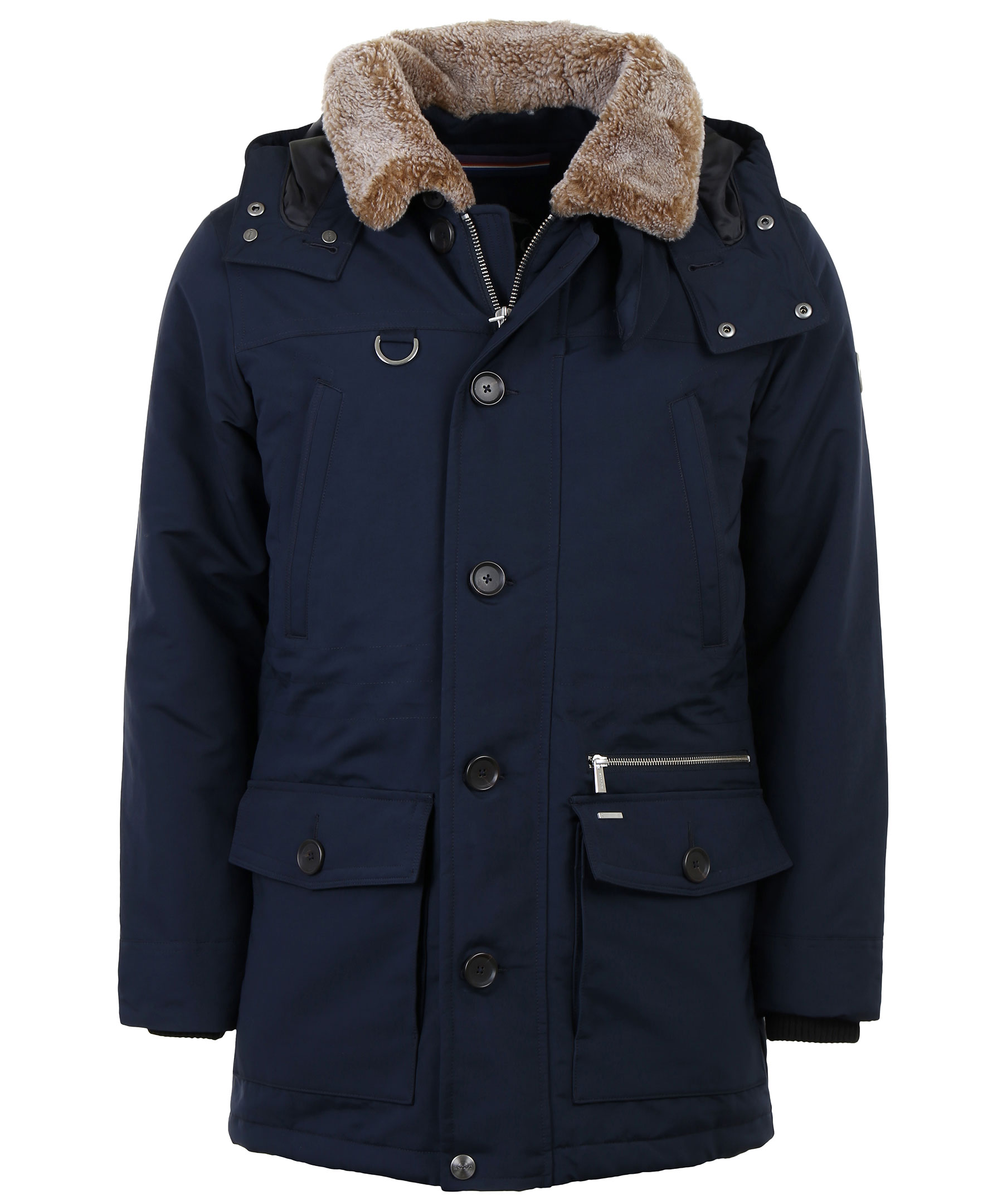 Mörkblå dunparkas från Snoot i vattenavstötande polyester. Jackan har sex praktiska fickor fram samt en innerficka. Reglerbar luva och krage i syntetpäls. Jackan stängs med dragkedja samt grova knappar. Dragsko i midjan och rund metallbricka med logotyp på vänster ärm.
