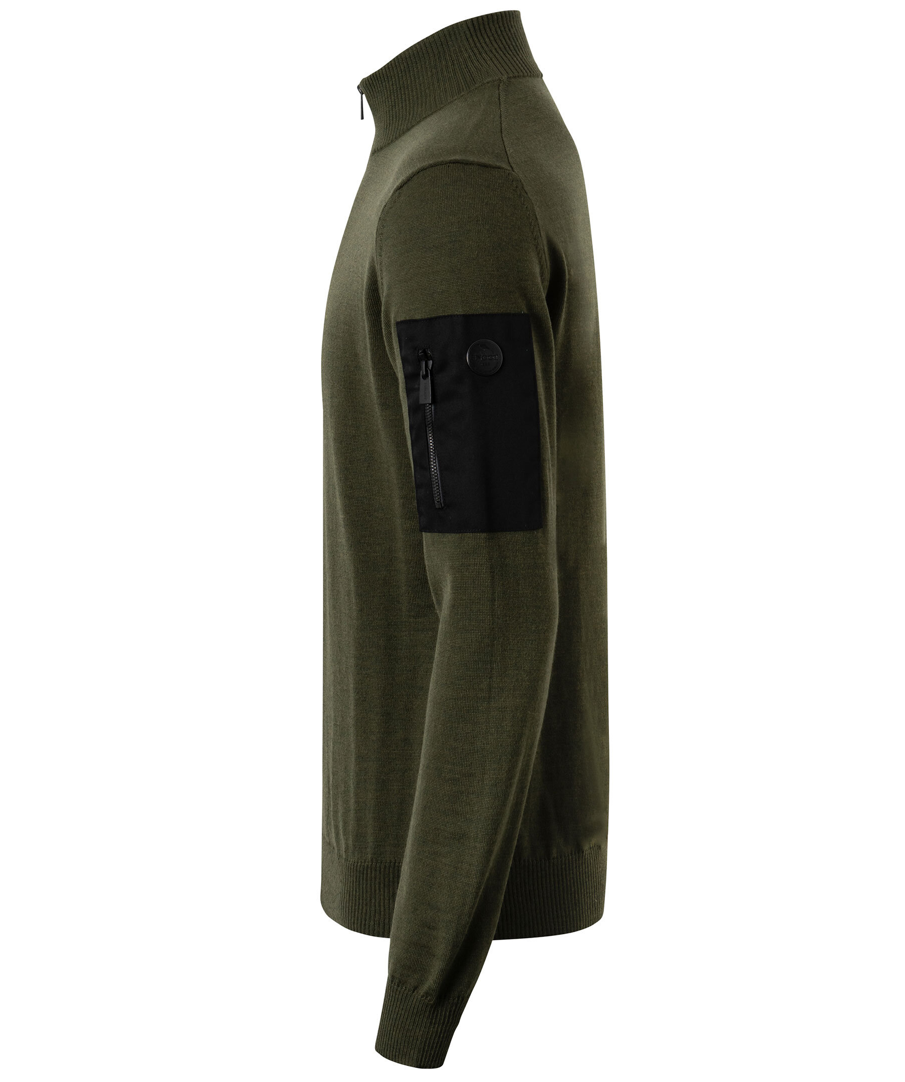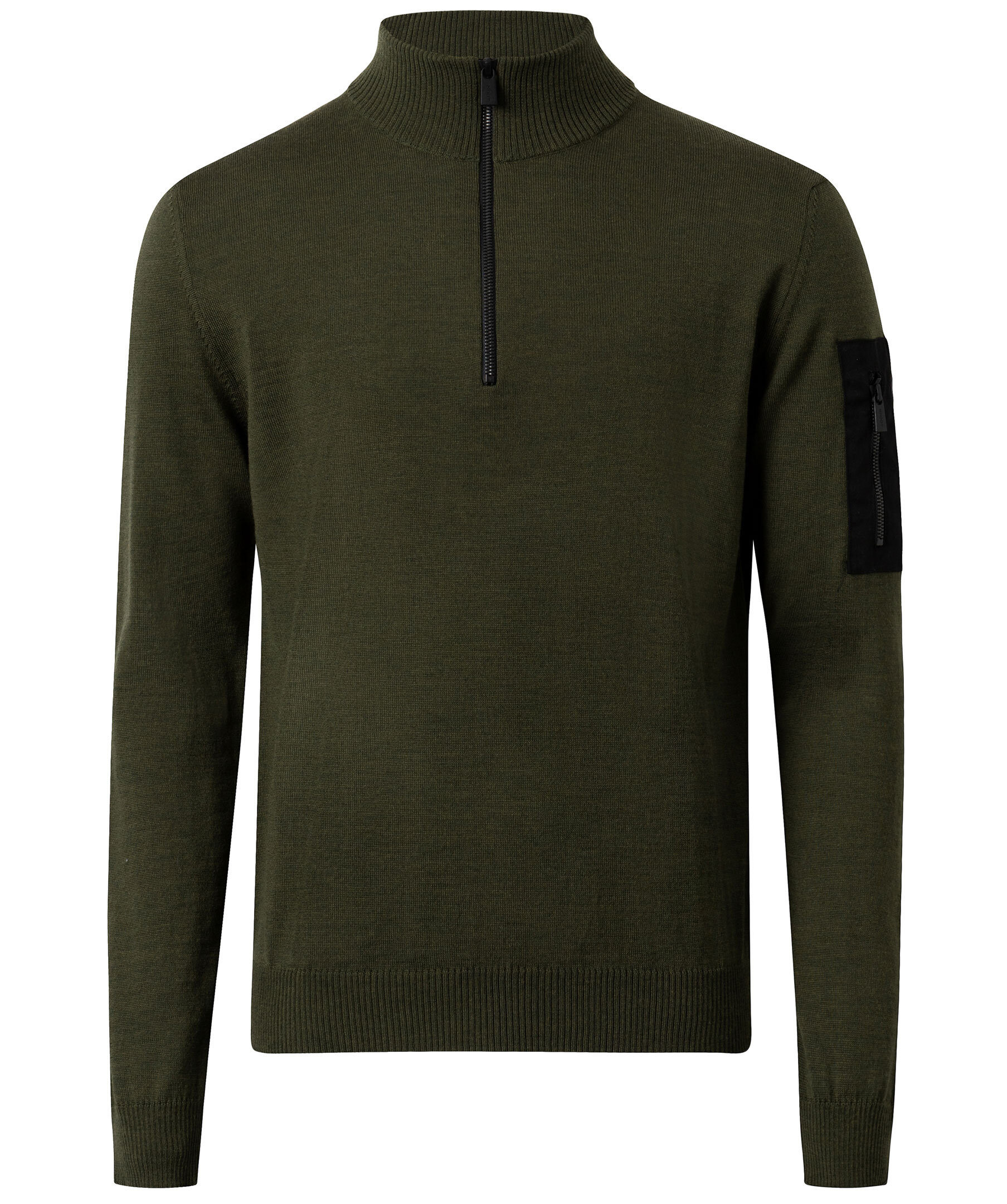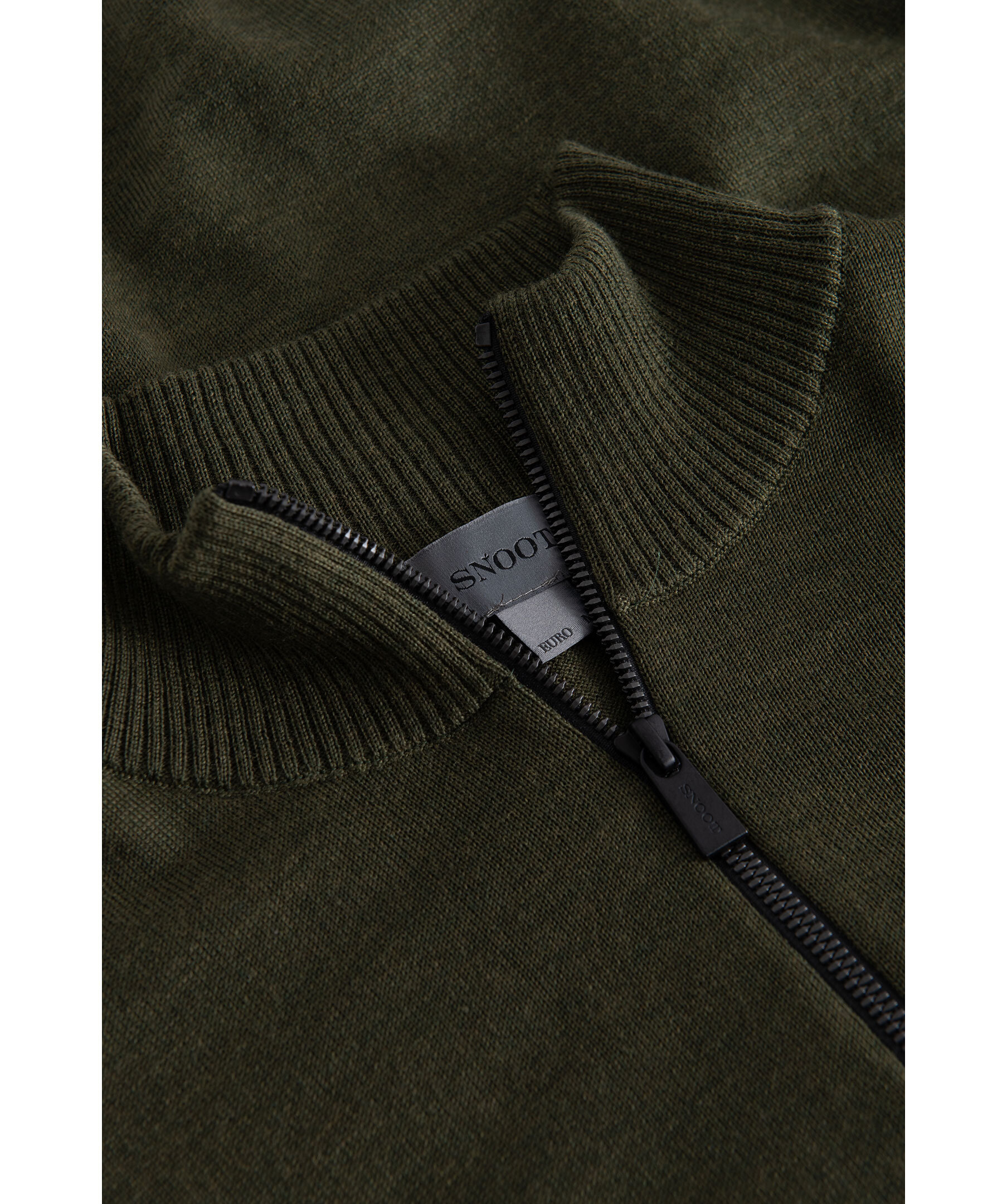 Mörkgrön finstickad tröja från Snoot. Tillverkad i 100% merinoull. Hög krage med svart dragkedja, logga och liten ficka med blixtlås på vänster ärm.