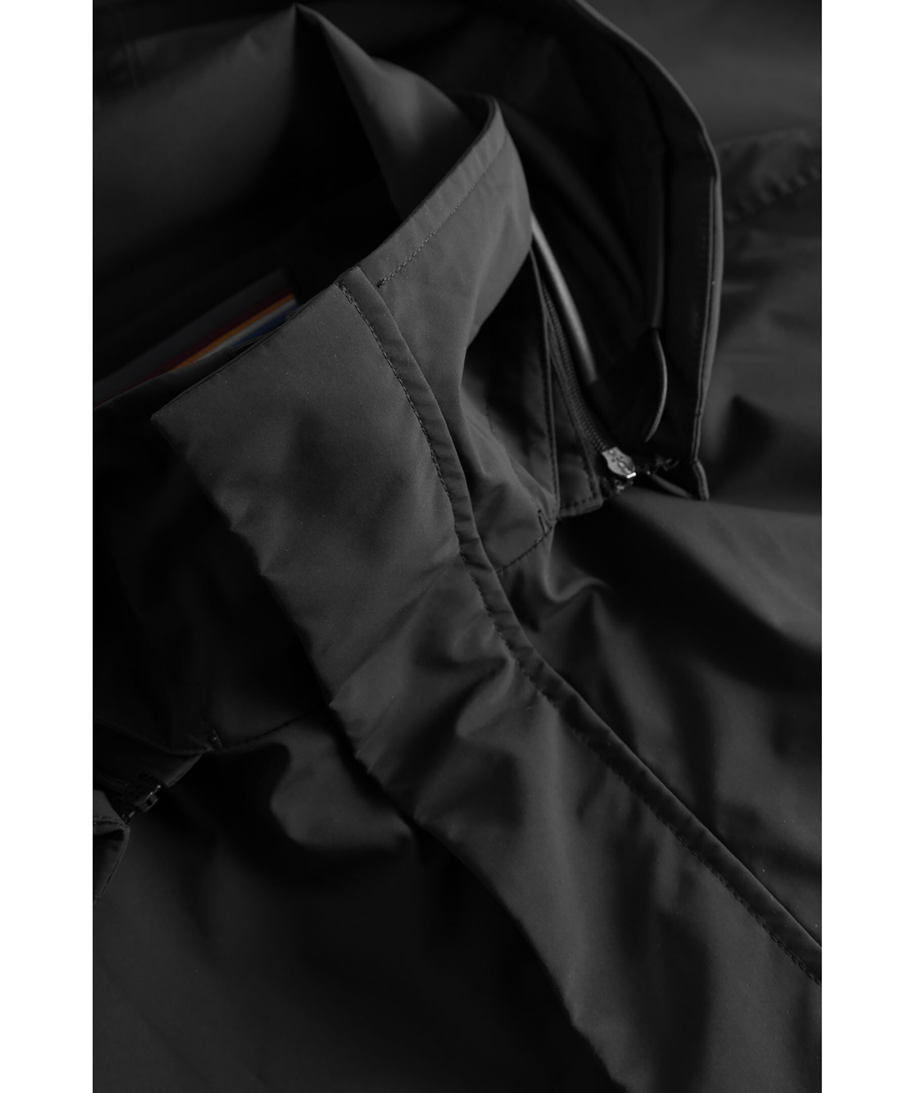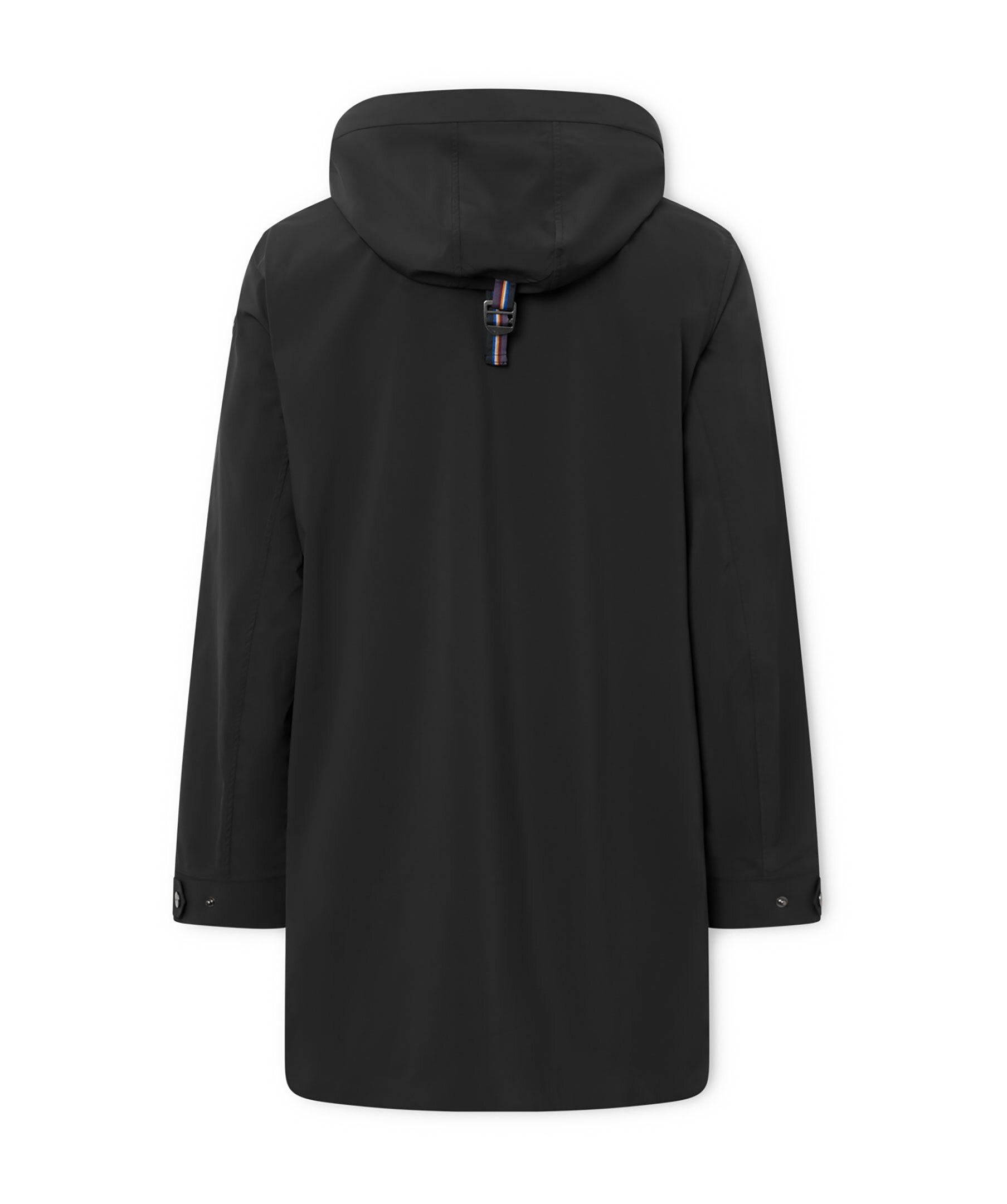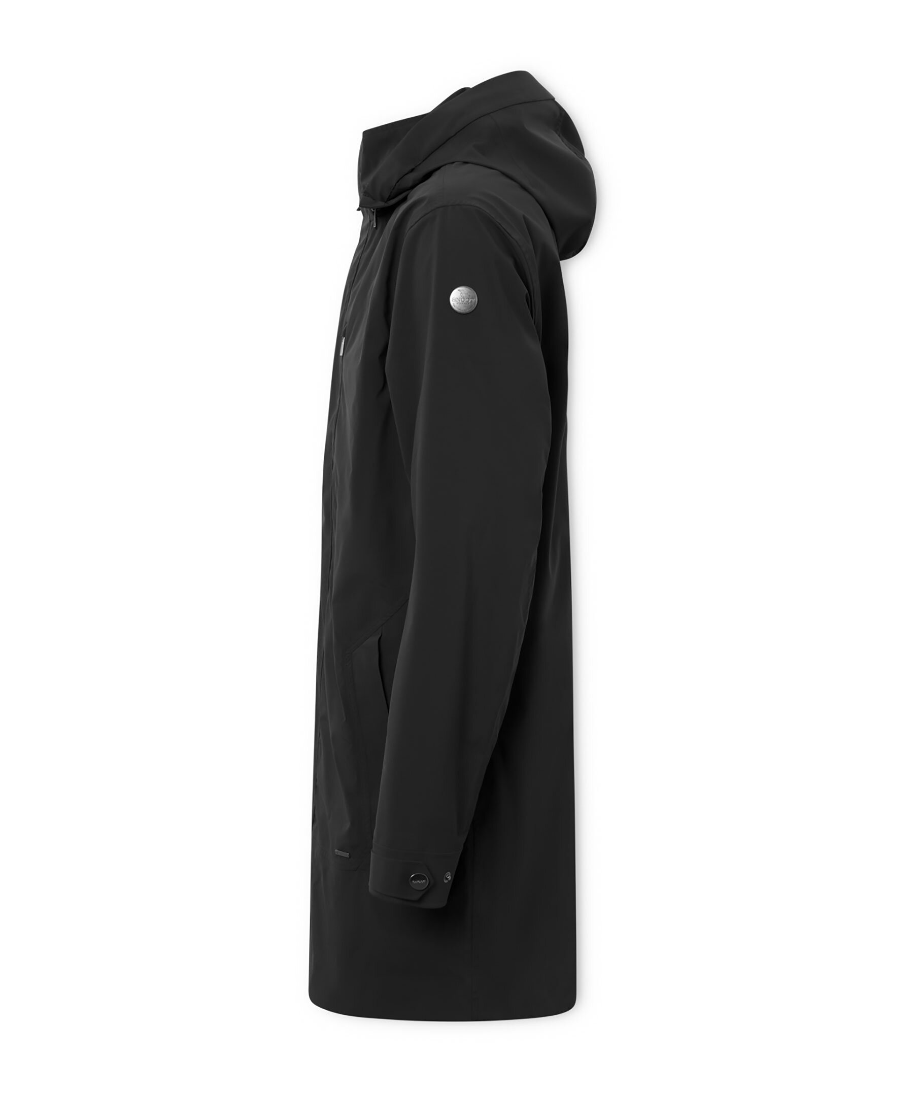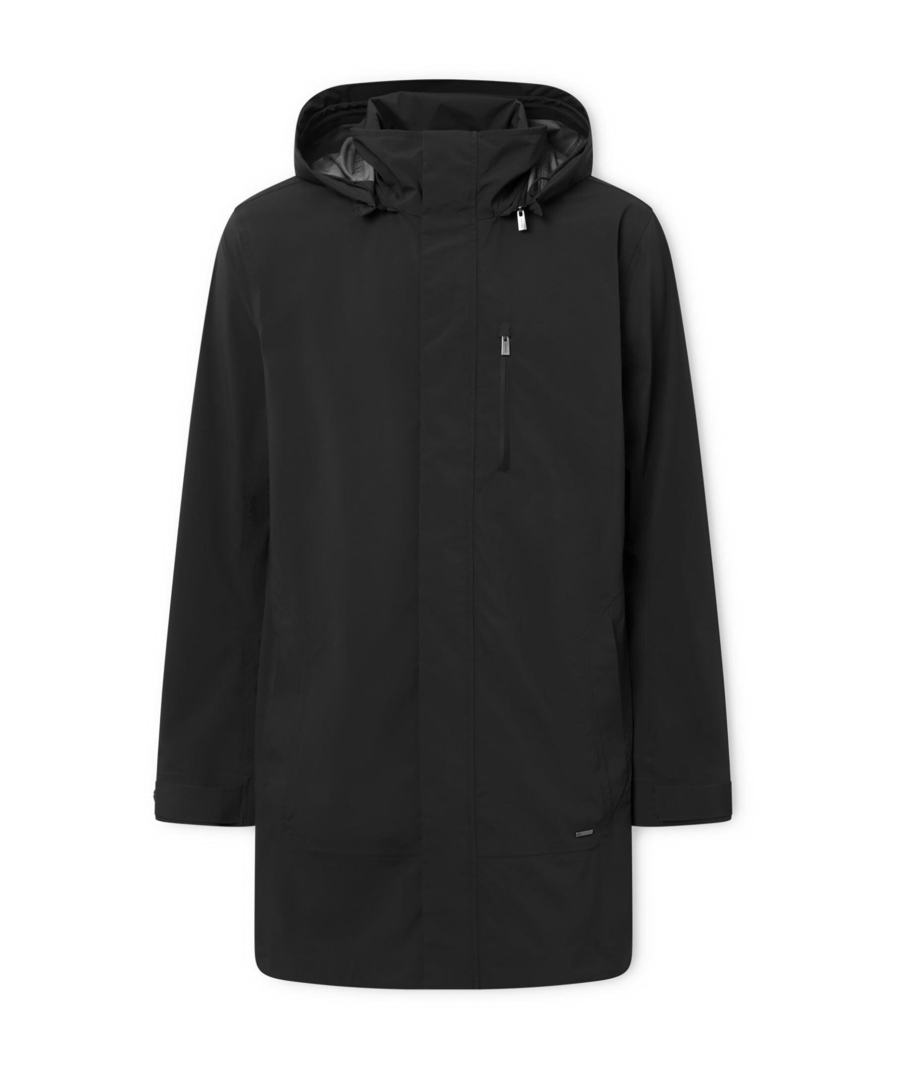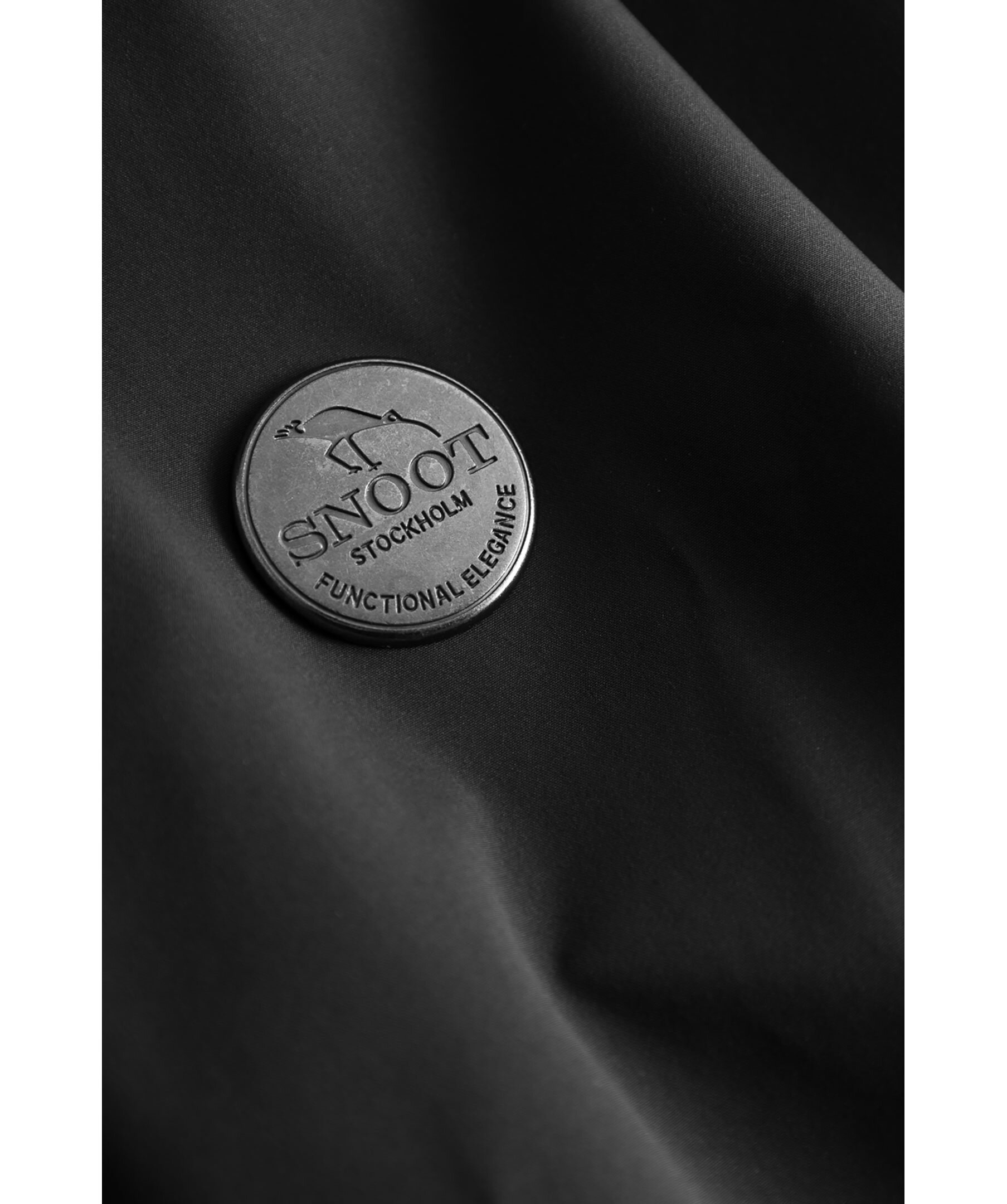 Svart lång jacka med huva från Snoot. Stängs med dold tvåvägsdragkedja och knappar. En bröstficka och en innerficka med dragkedja. Två sidfickor med dragkedja. Metallogotyp på vänster ärm. Avtagbar huva. Tillverkad i 100% Polyester.