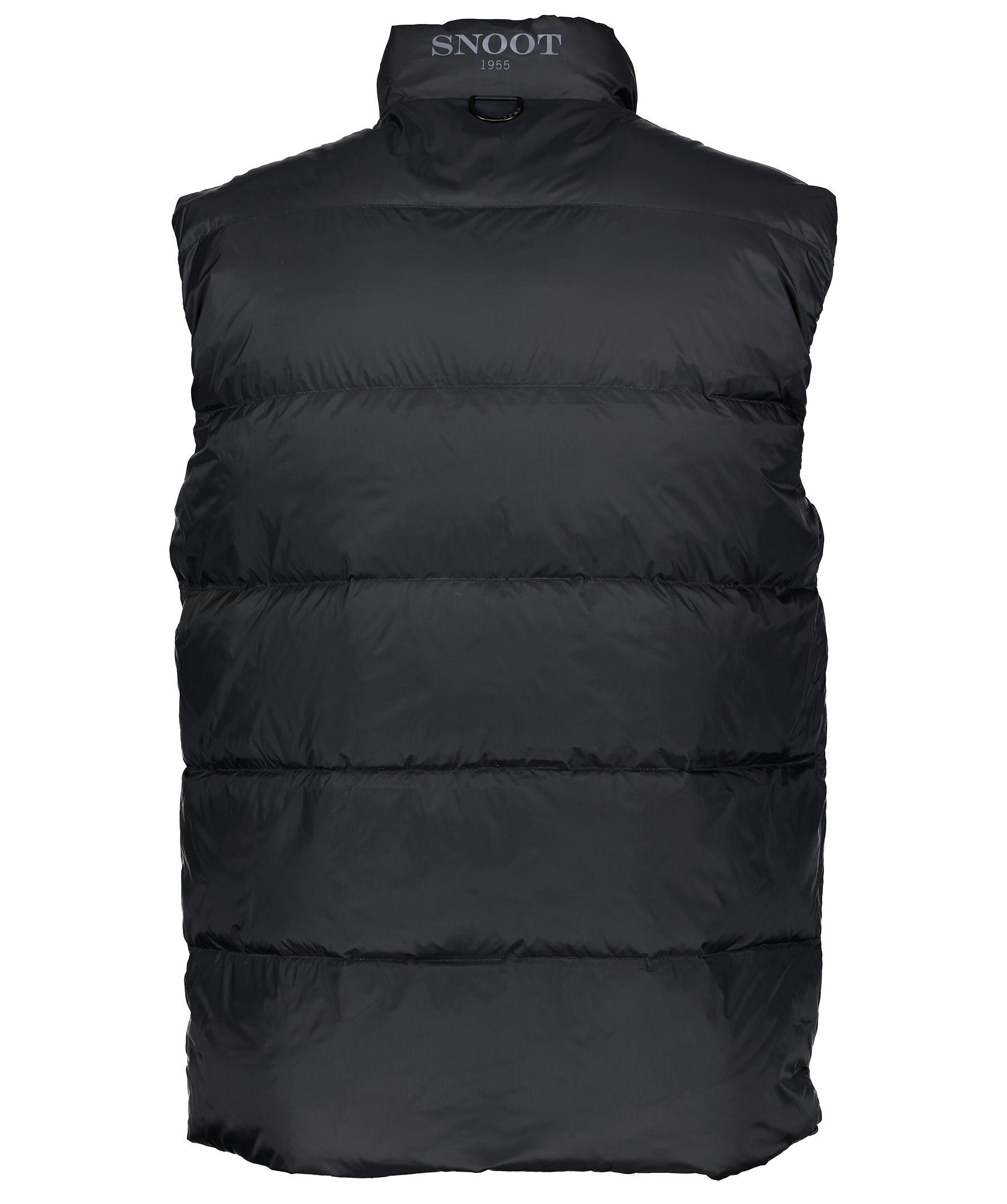 Svart dunväst från Snoot. Yttertyg tillverkat i polyamid med en matt finish. Två framfickor med dragkedja, en innerficka med dragkedja och en bröstficka med dragkedja och med en patch med rund logotyp i metall. Liten krage, dragsko i plaggslut och stängs med tvåvägsdragkedja.