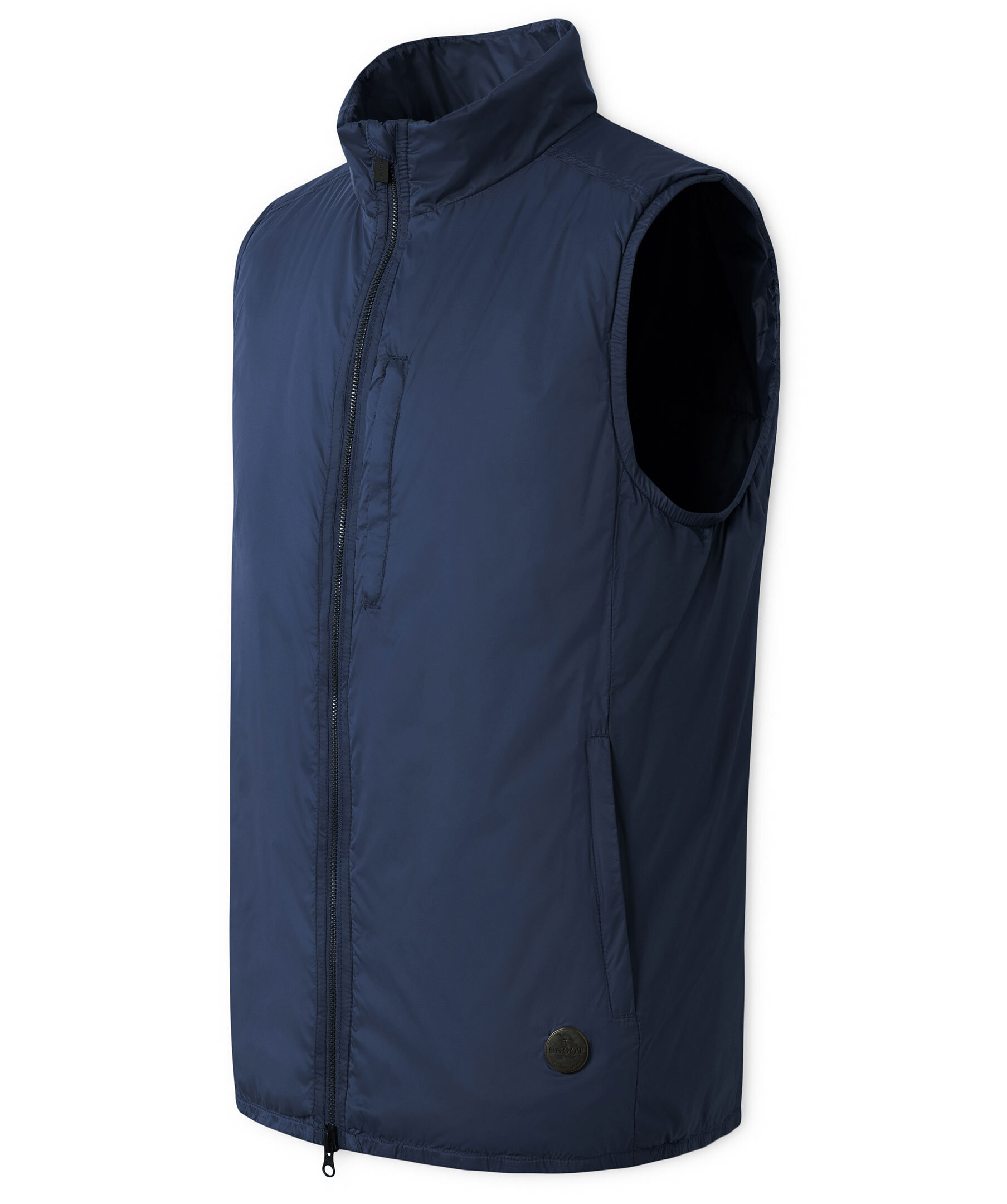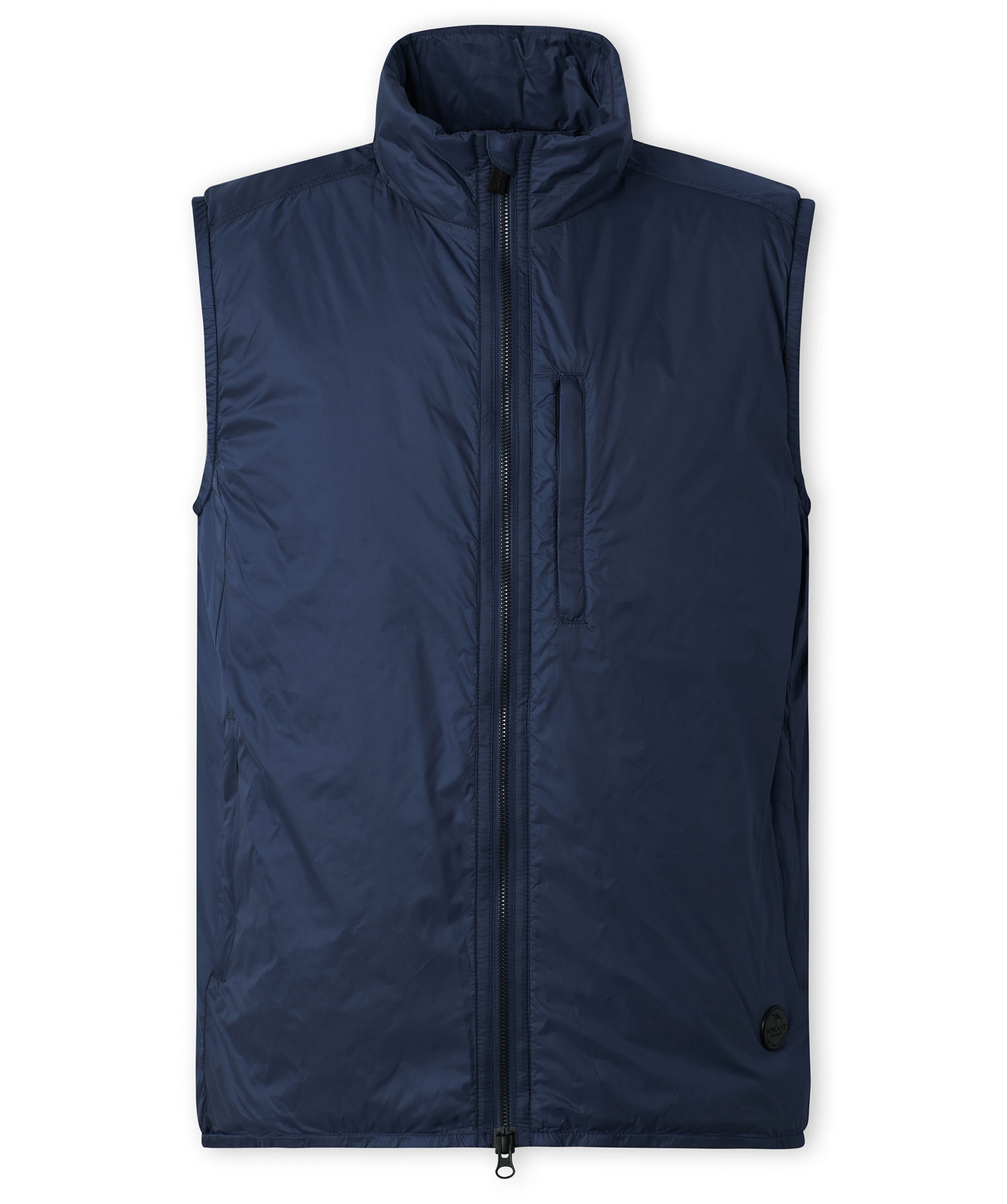 Marinblå lättviktsväst i klassisk passform från Snoot. Tillverkad i syntet med thermore fyllning. En ficka på bröstet, två snedställda fickor fram, logotyp i nederkant, hög krage.