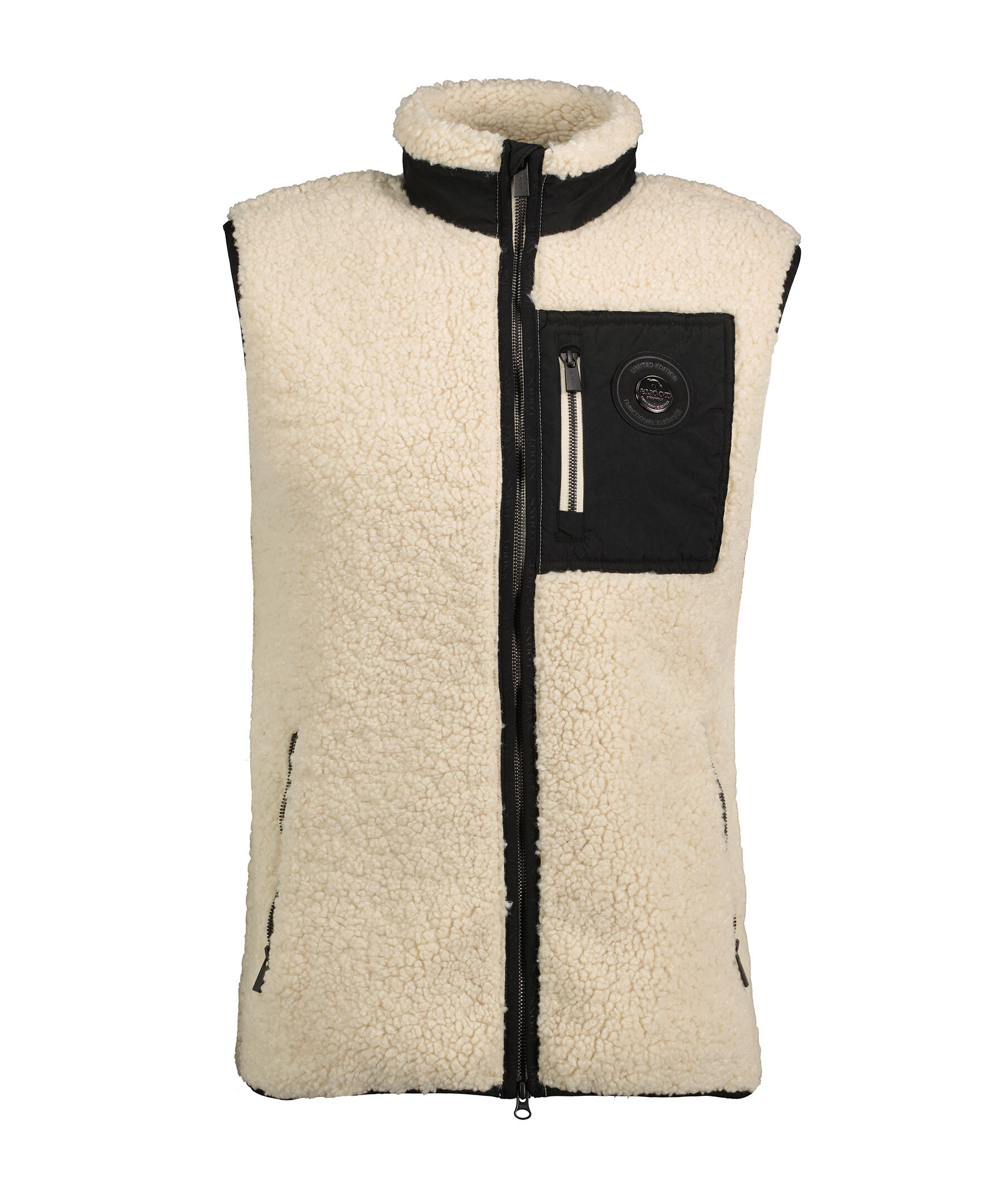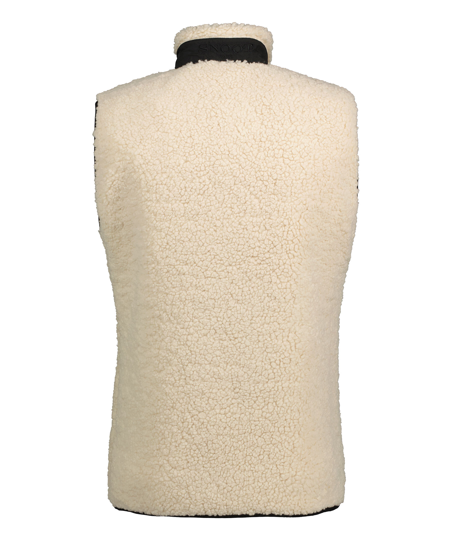 Benvit pileväst från Snoot med svarta vävda detaljer. Stängs framtill med tvåvägsdragkedja. Bröstficka i svart med logotyp som stängs med dragkedja. Två sidfickor som stängs med dragkedja. Broderad logotyp i nacken, smal elastisk mudd i ärm-plaggslut och längst dragkedjan med logotyper.