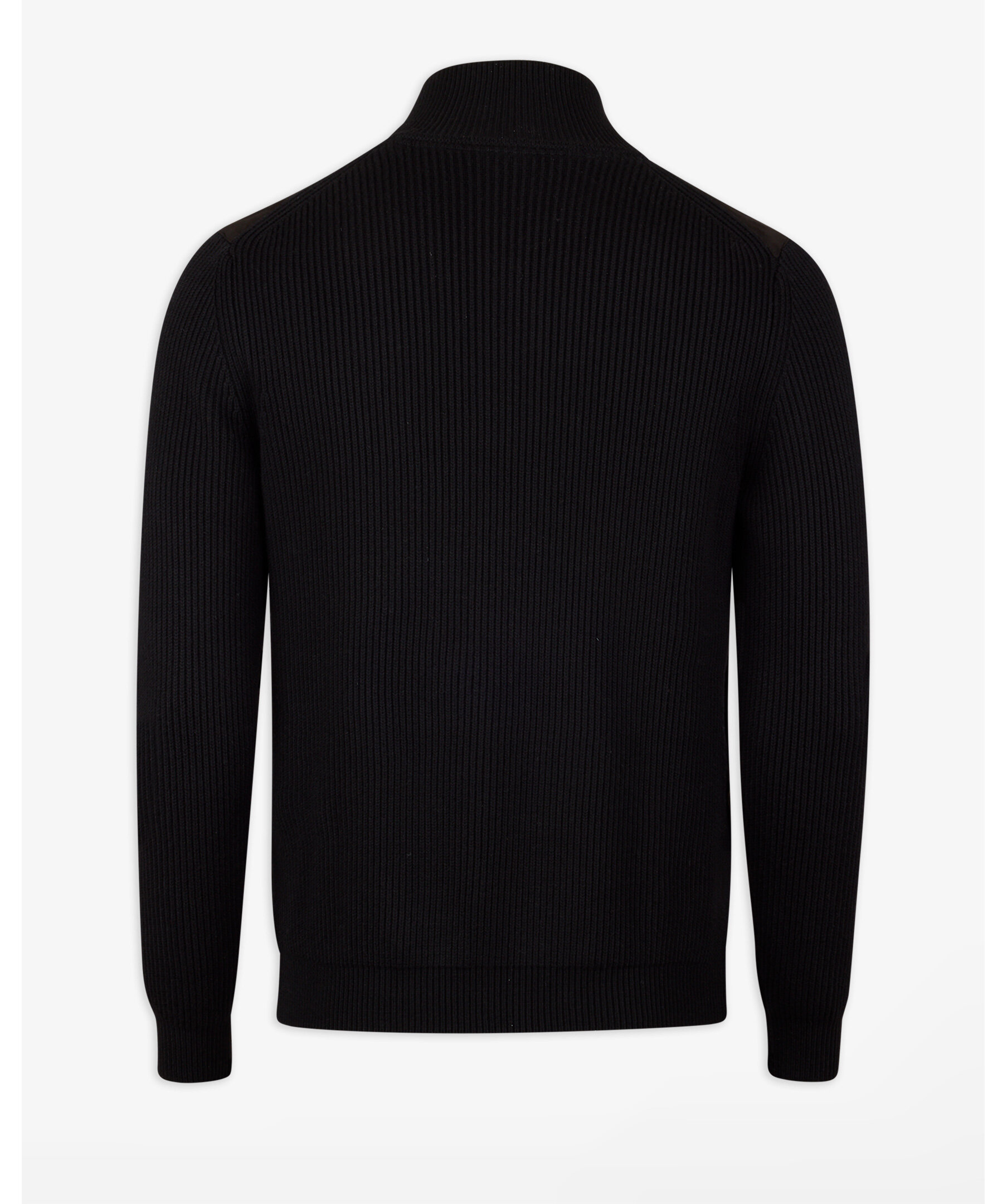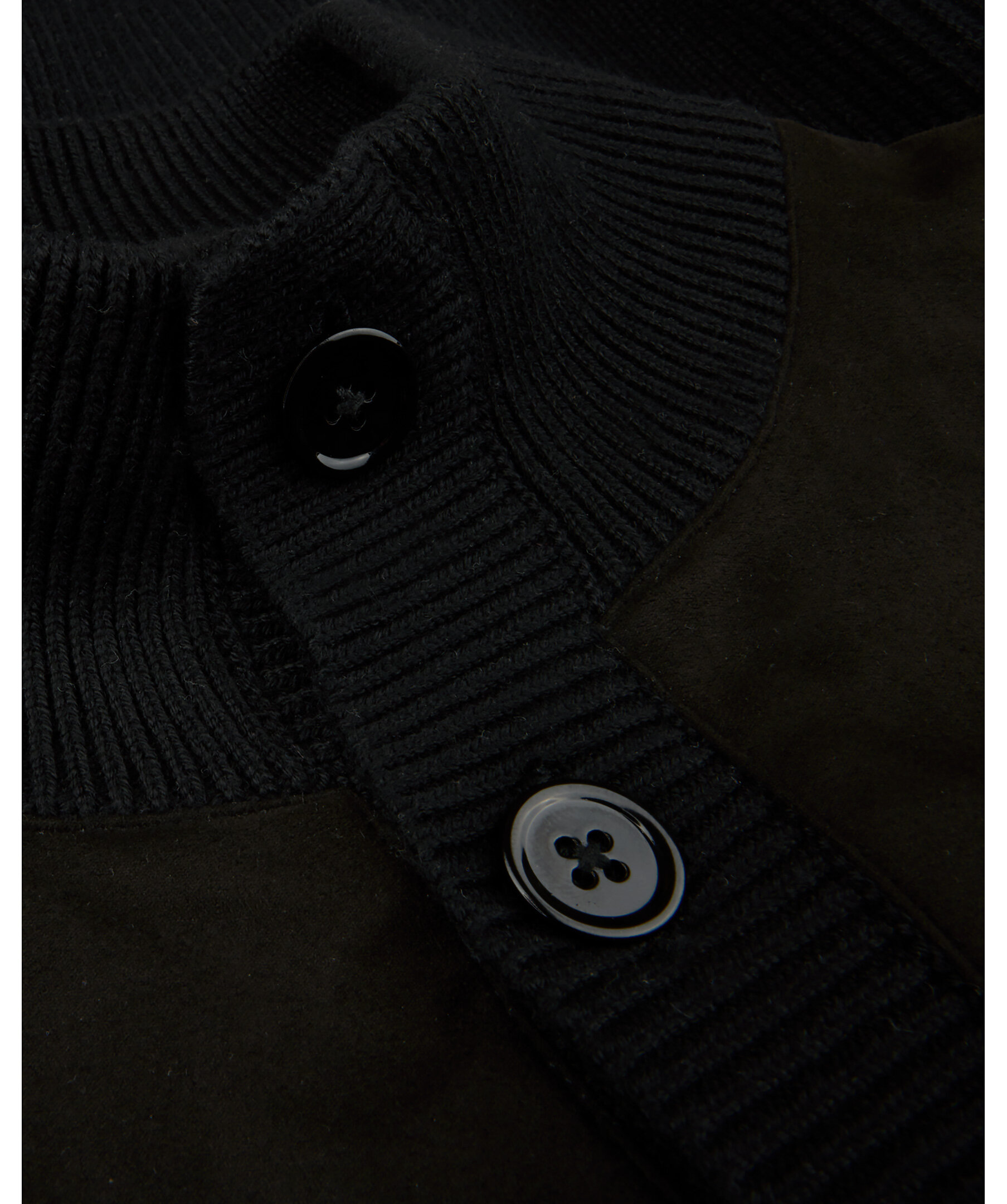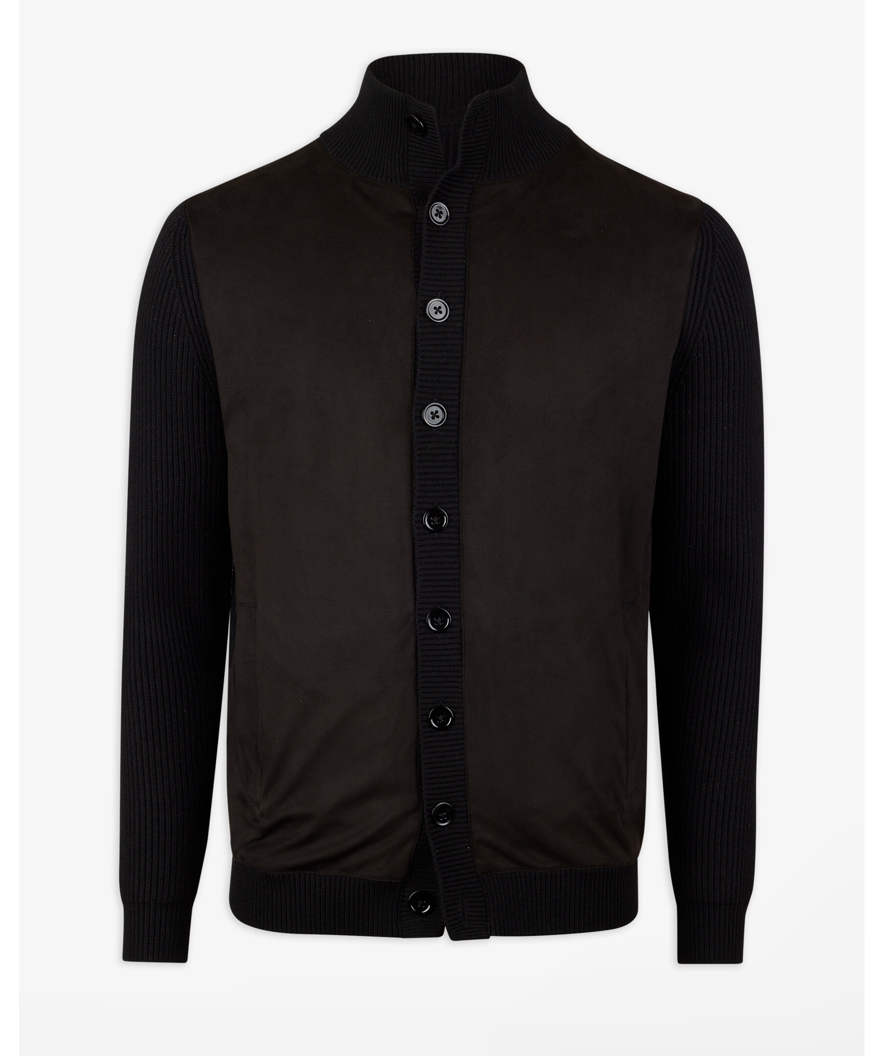 Svart cardigan i merinoull från Stenströms. Cardiganen har pärlemorknappar och ribstickade detaljer vid krage, ärm- och plaggslut.