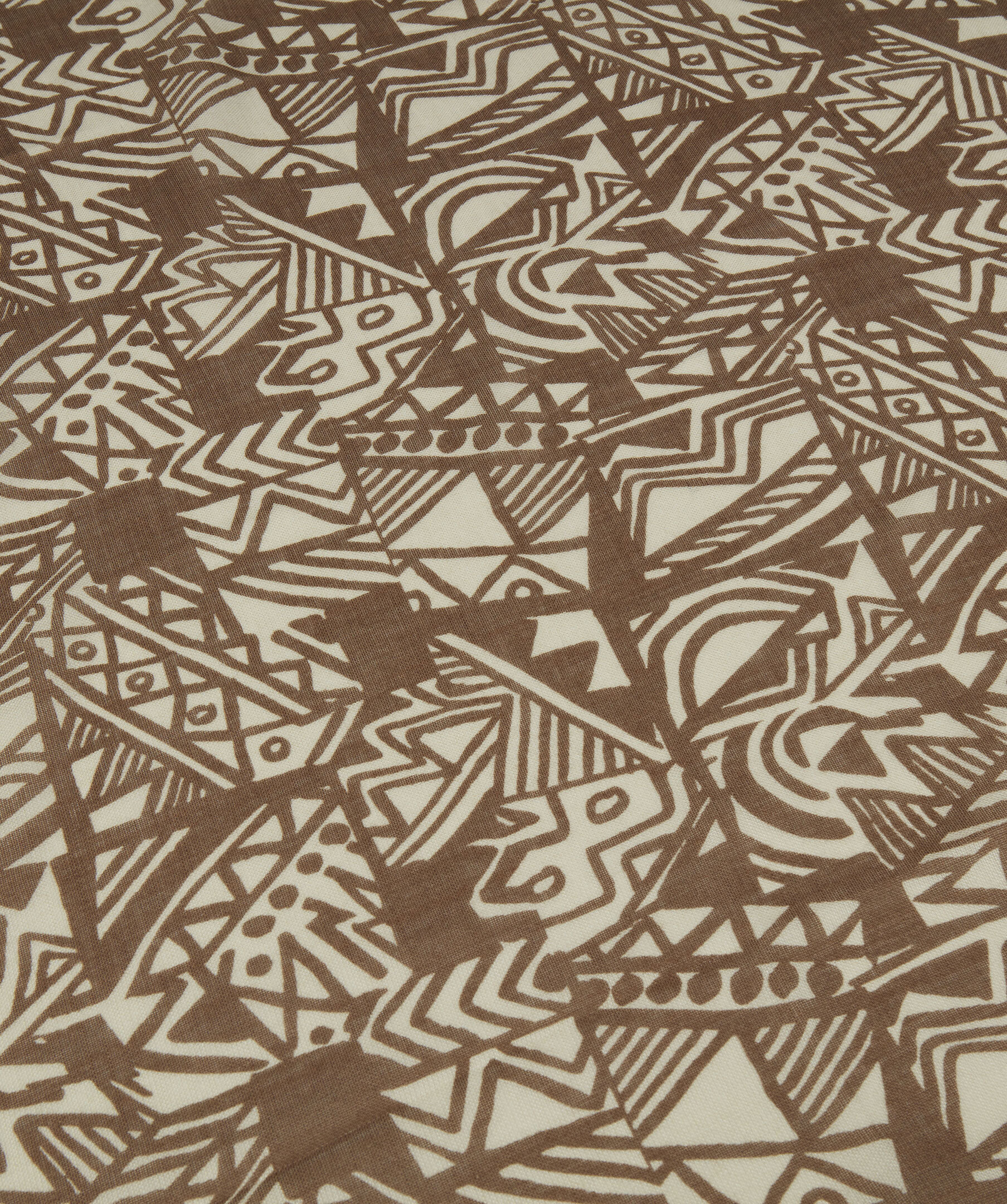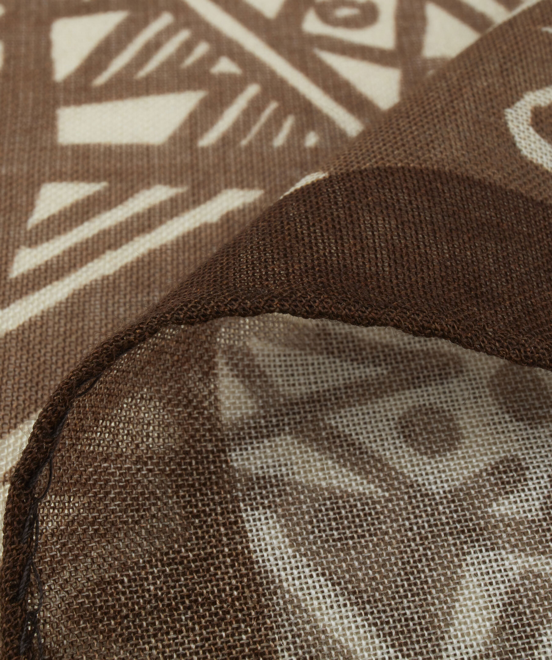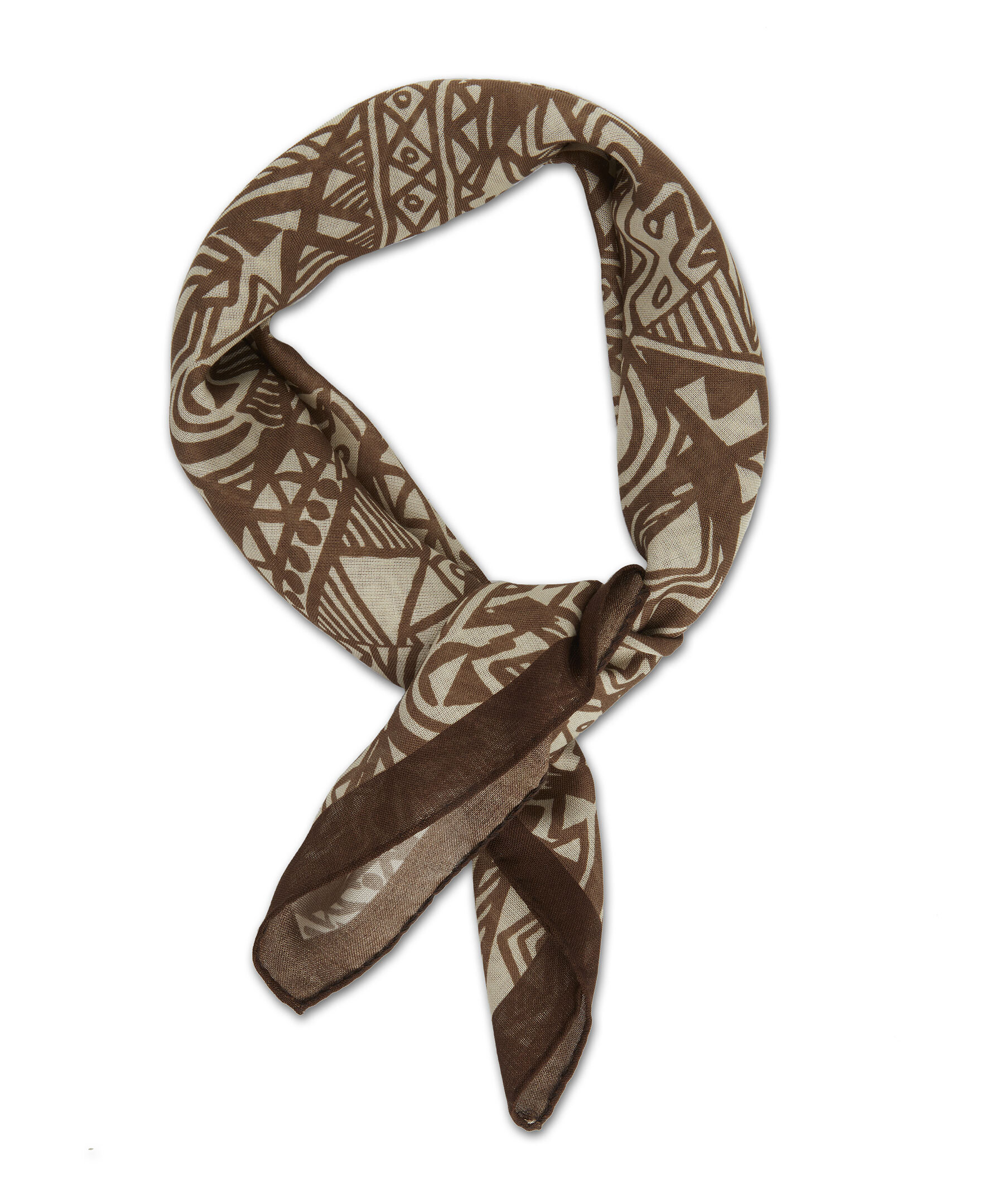 Denna bruna bandana är tillverkad av ull och siden. Näsduken är detaljerad med ett mönster och en röd ram runt.