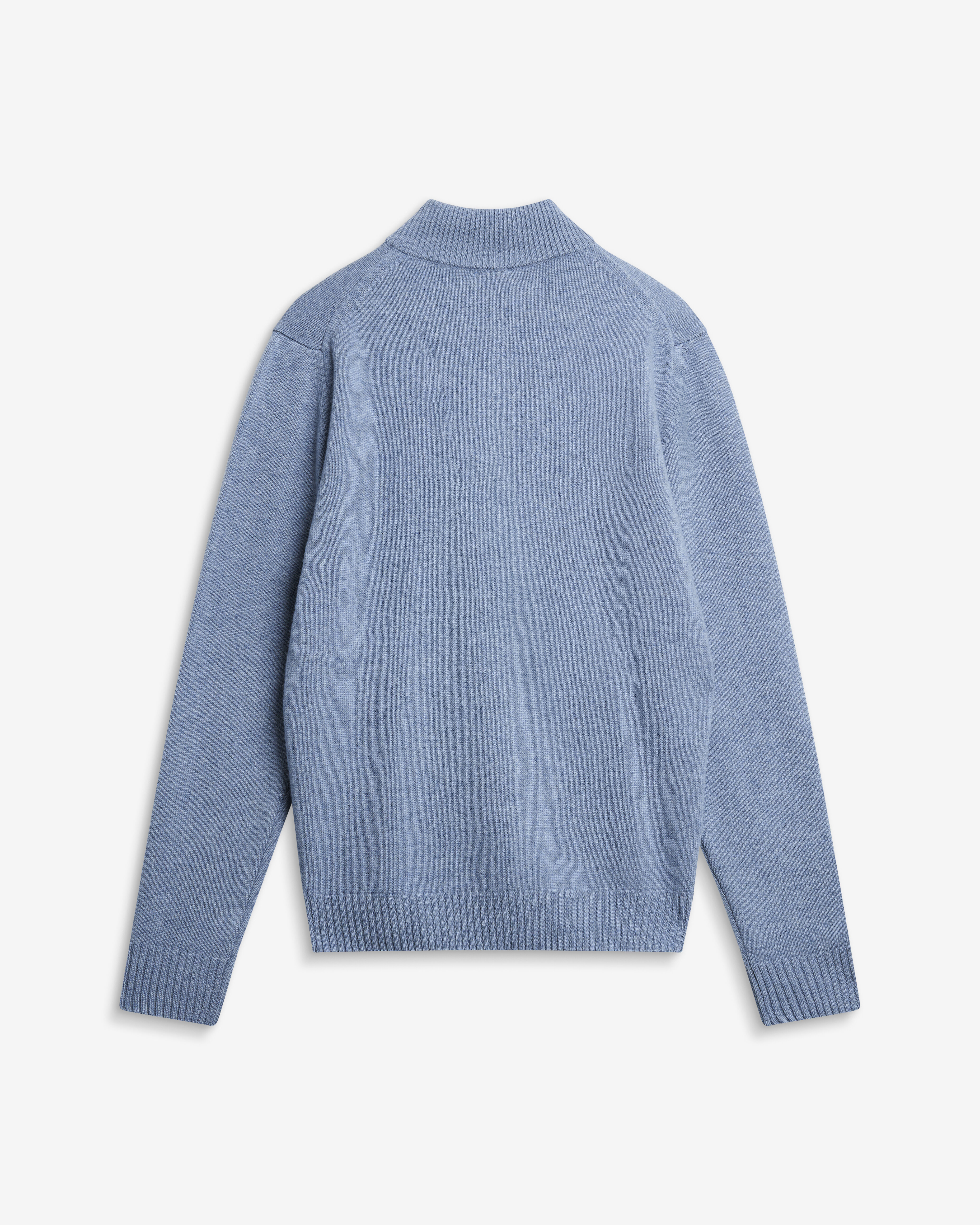 Ljusblå half-zip tillverkad av borstat merinoull och har ribbstickade detaljer vid krage, ärm- och plaggslut.