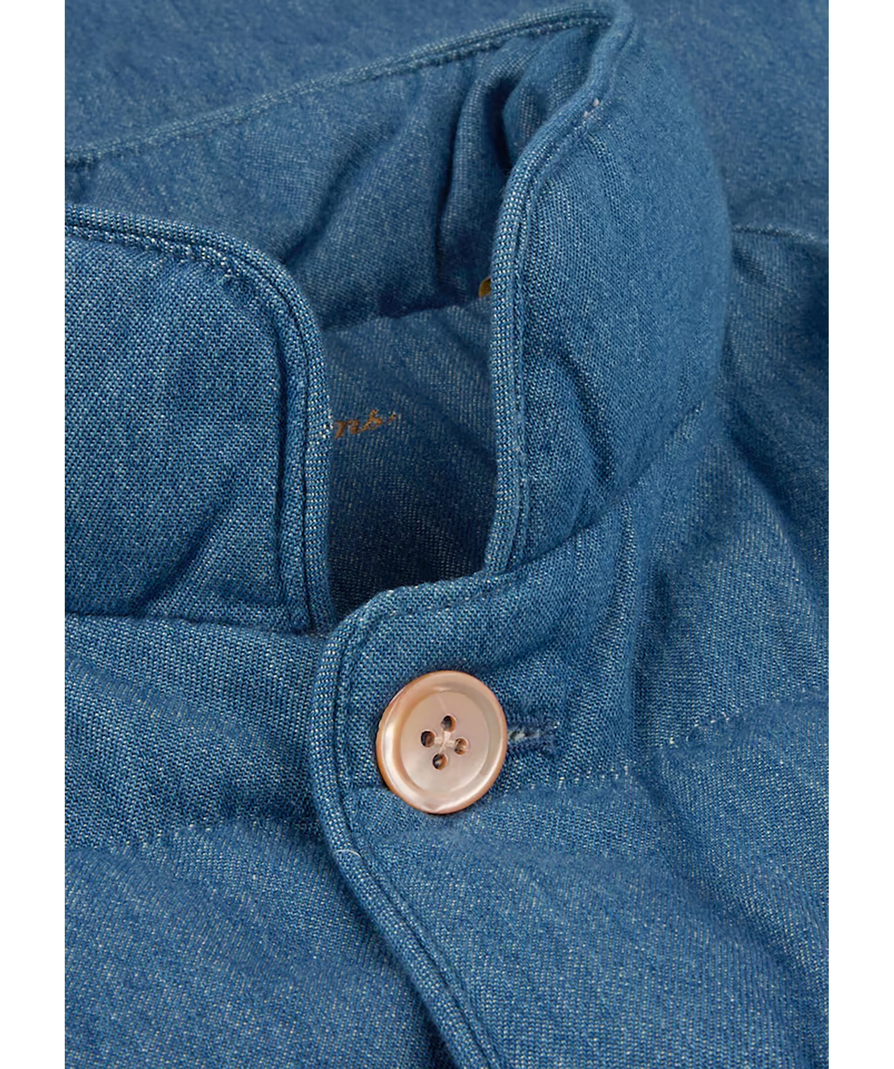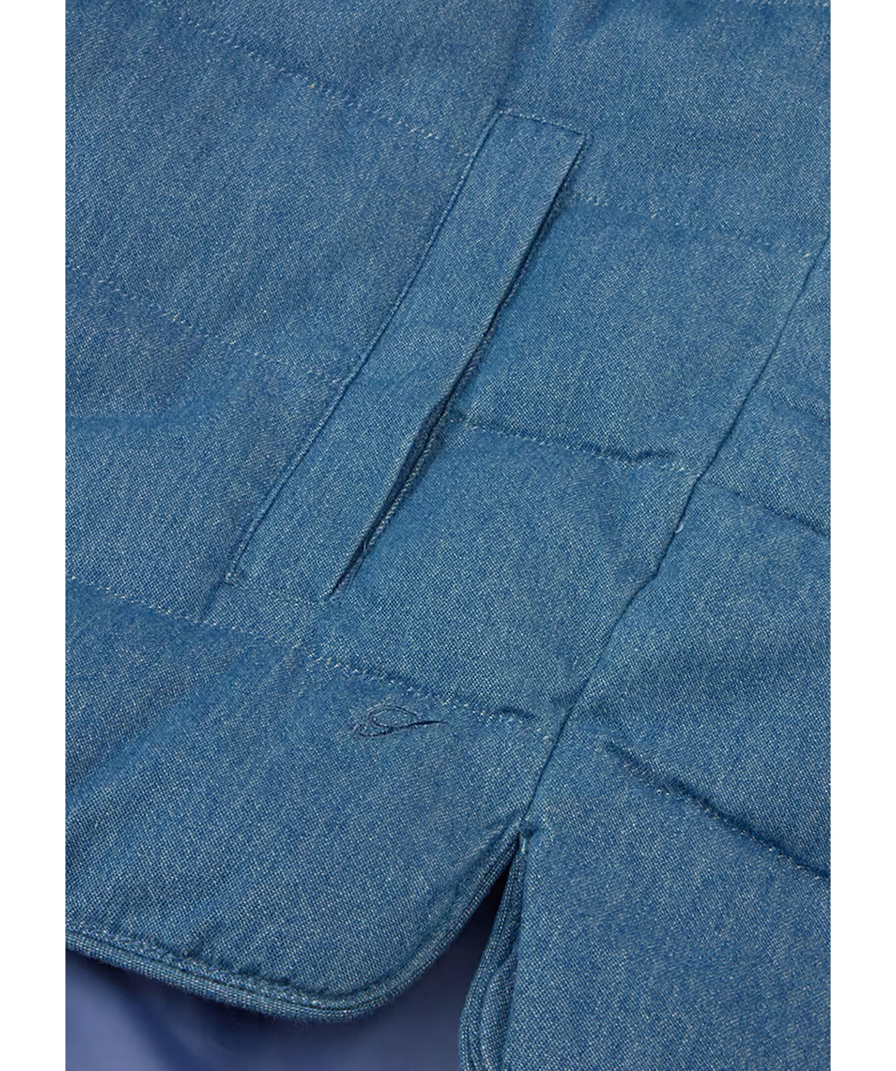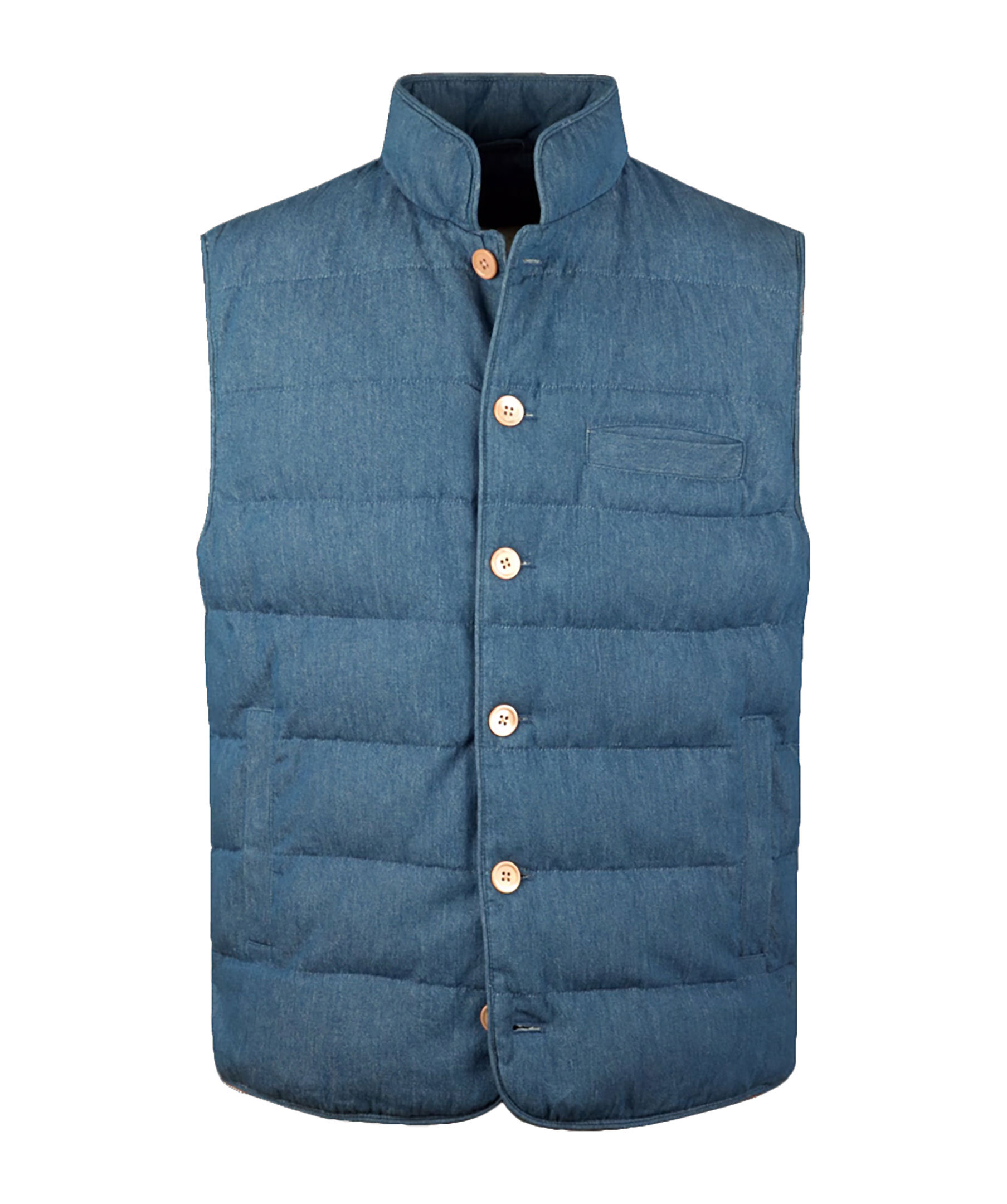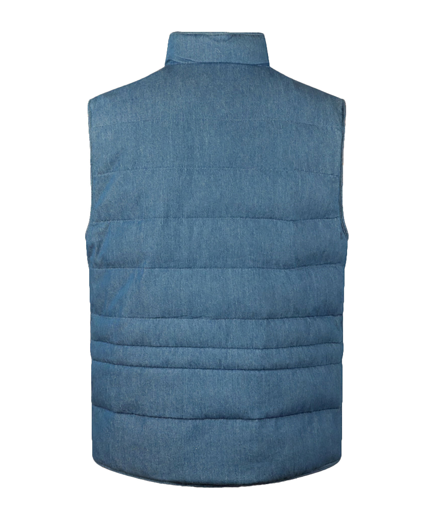 Blå, vadderad denimväst från Stenströms. Stängs med knappar framtill och har två sidfickor, en bröstficka samt dld dragsko i midjan. Tillverkad i bomull.