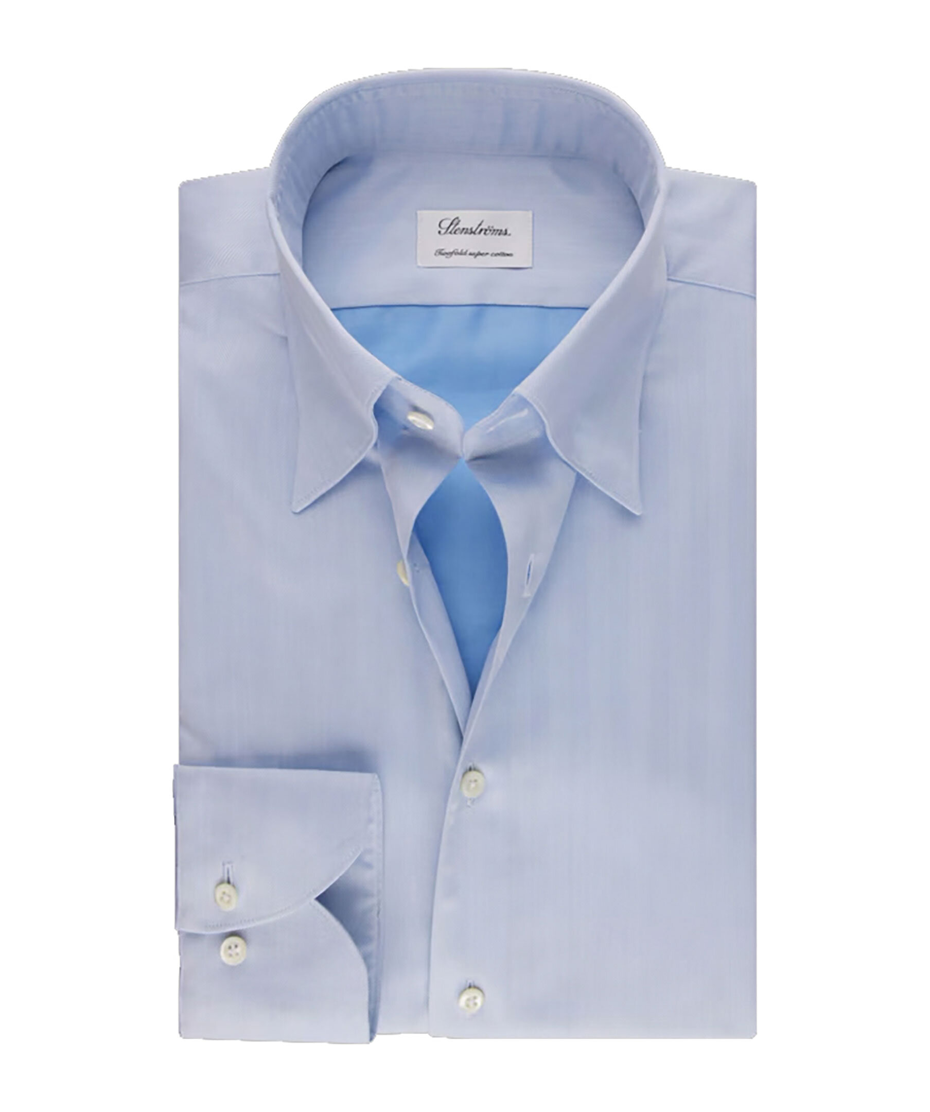 Ljusblå twillskjorta från stenströms. Skjortan har ett mönstrat tryck, button-under krage och pärlemoknappar samt enkla manschetter. Tillverkad av twofold bomull.