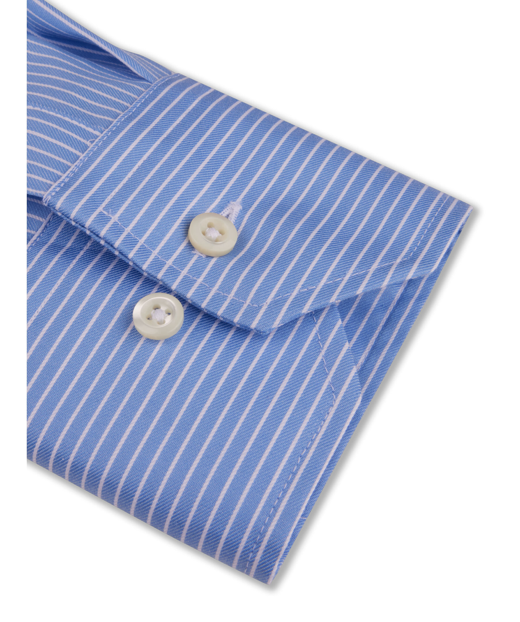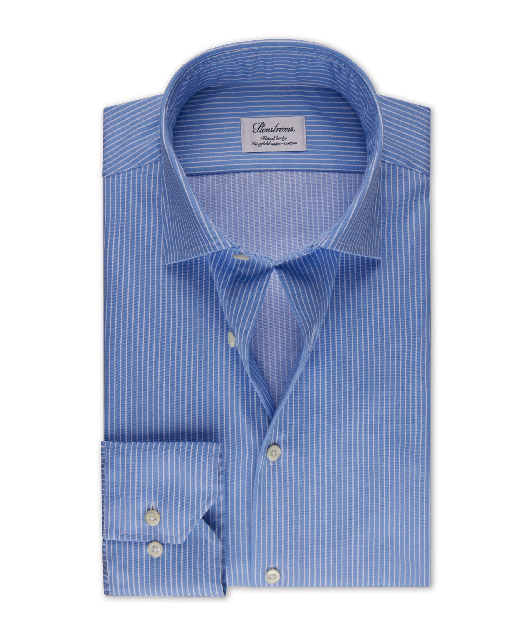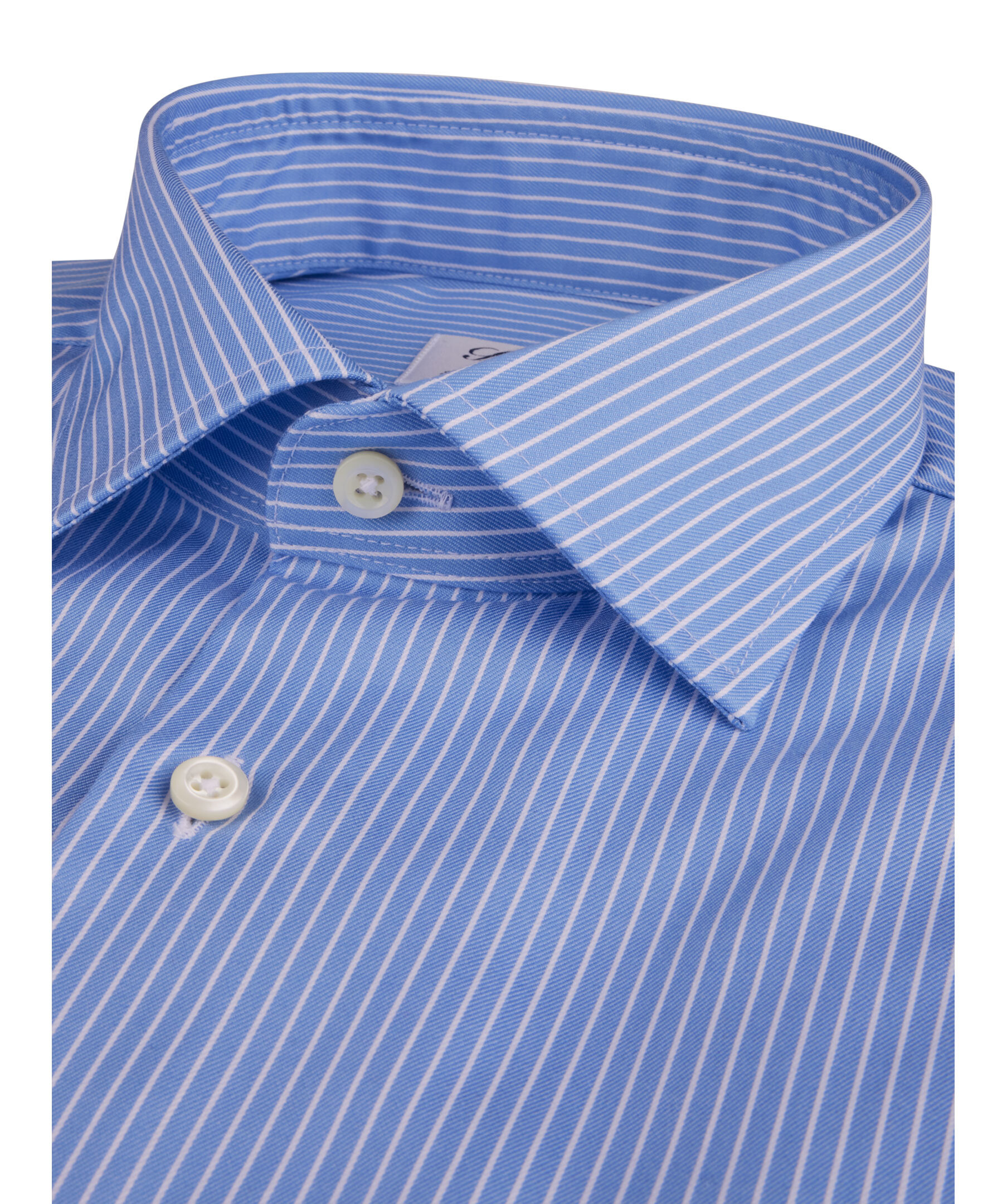 Denna randiga twillskjorta är tillverkad av twofold bomull. Skjortan har pärlemorknappar, enkla manschetter och en cut away krage.