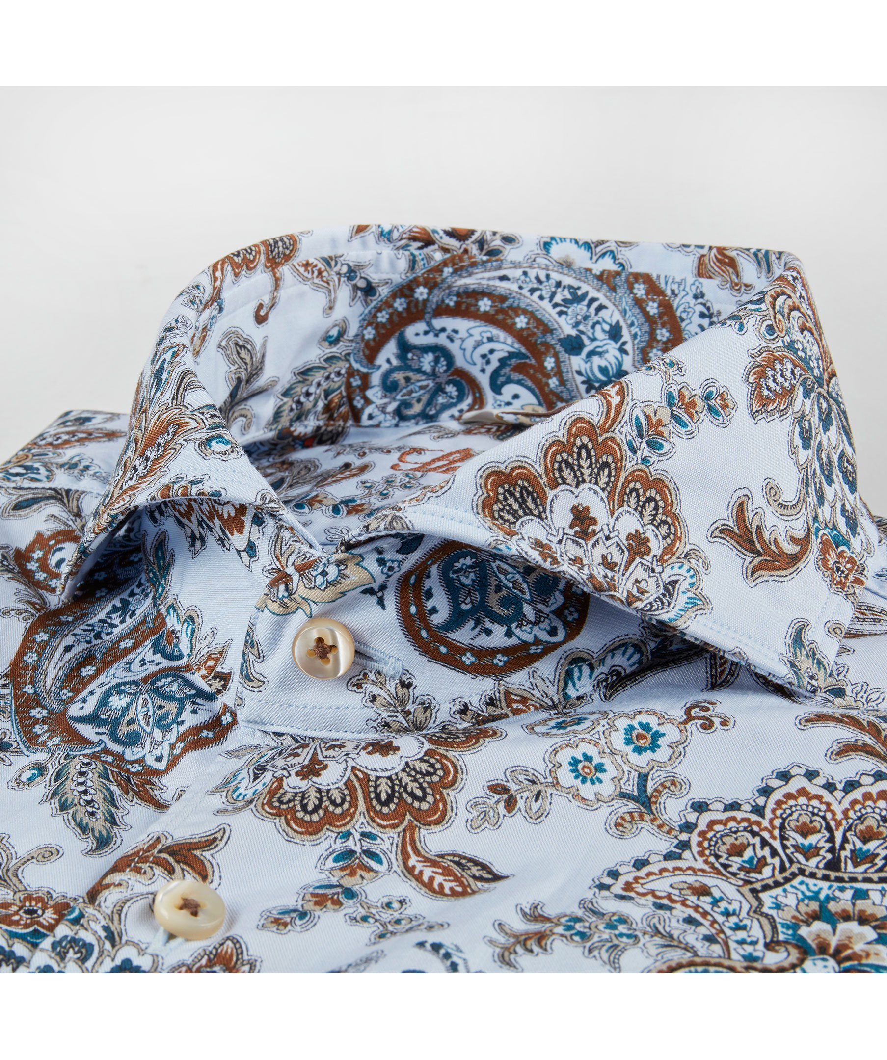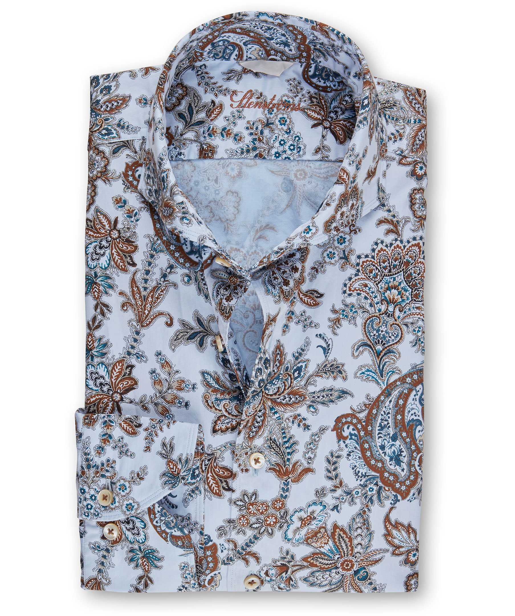 Ljusblå paisleymönstrad skjorta från Strenströms. Fitted body, enkel manschett, cut away krage.