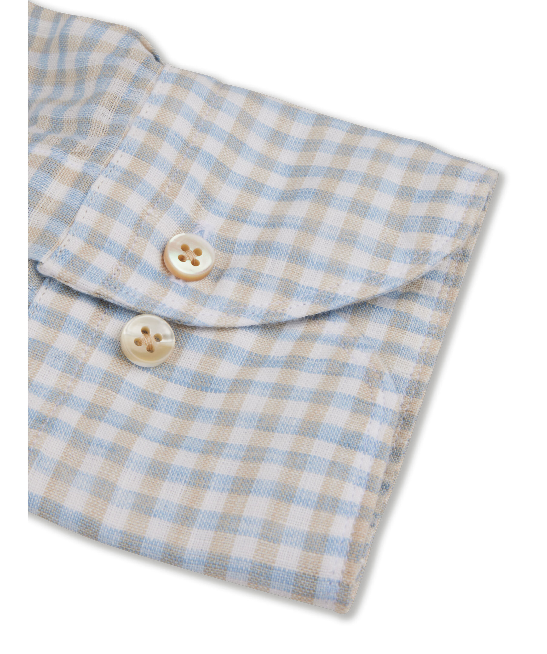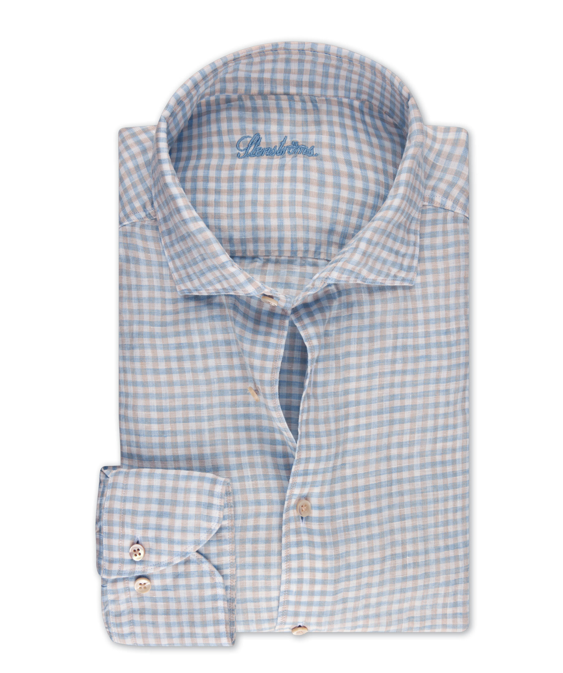 Denna rutiga skjorta är tillverkad av linne och har pärlemorknappar, enkla manschetter och en cut away krage.