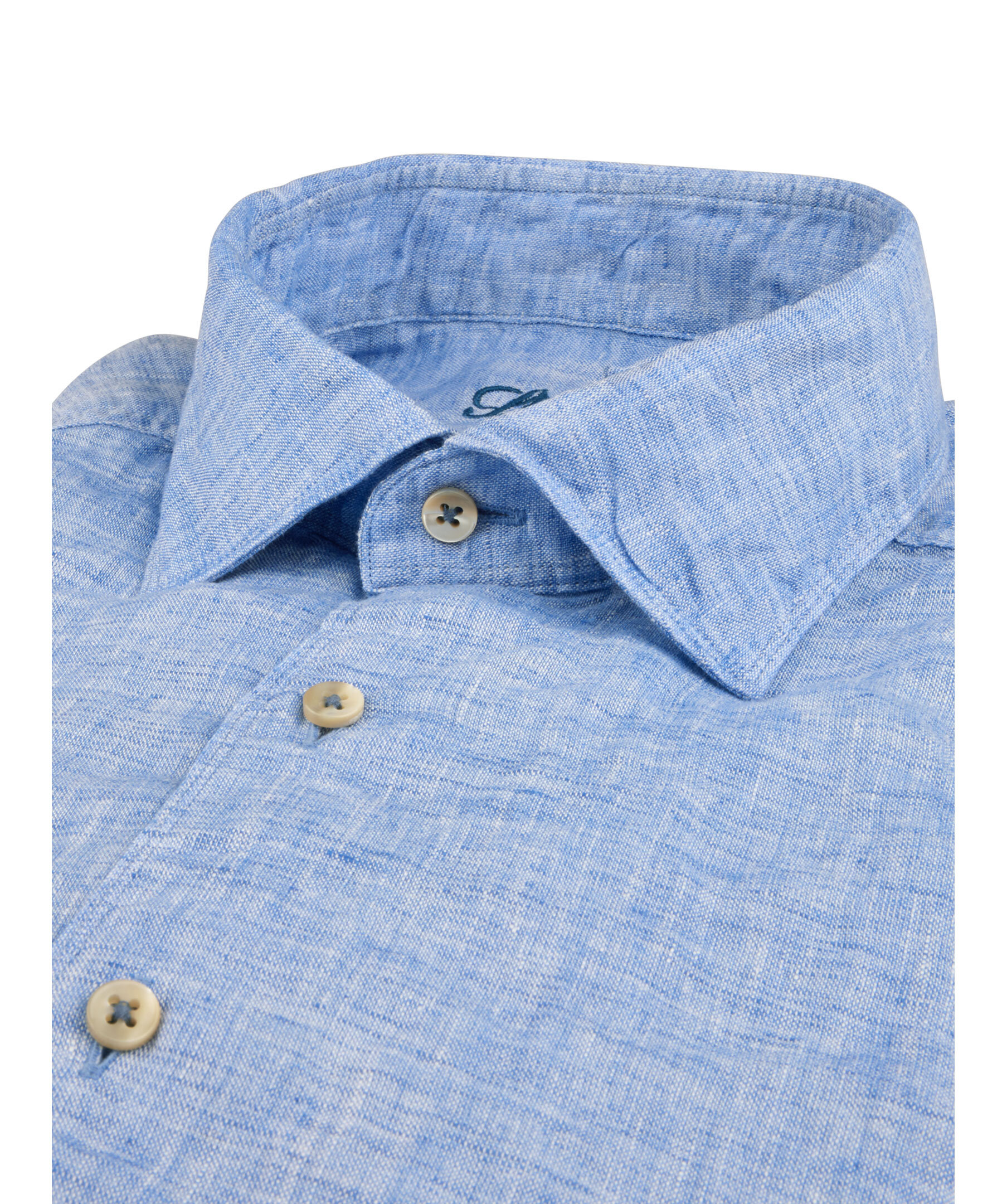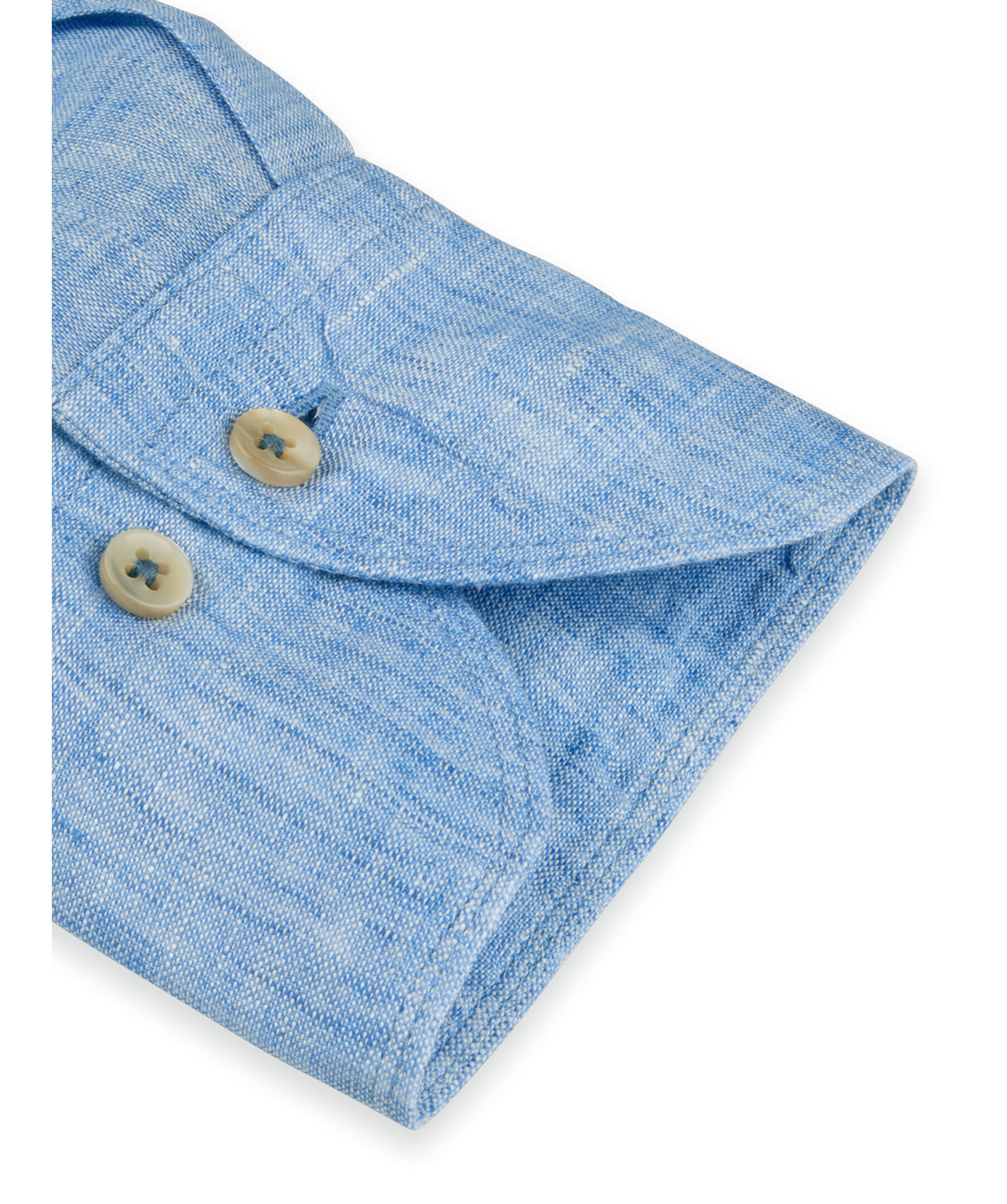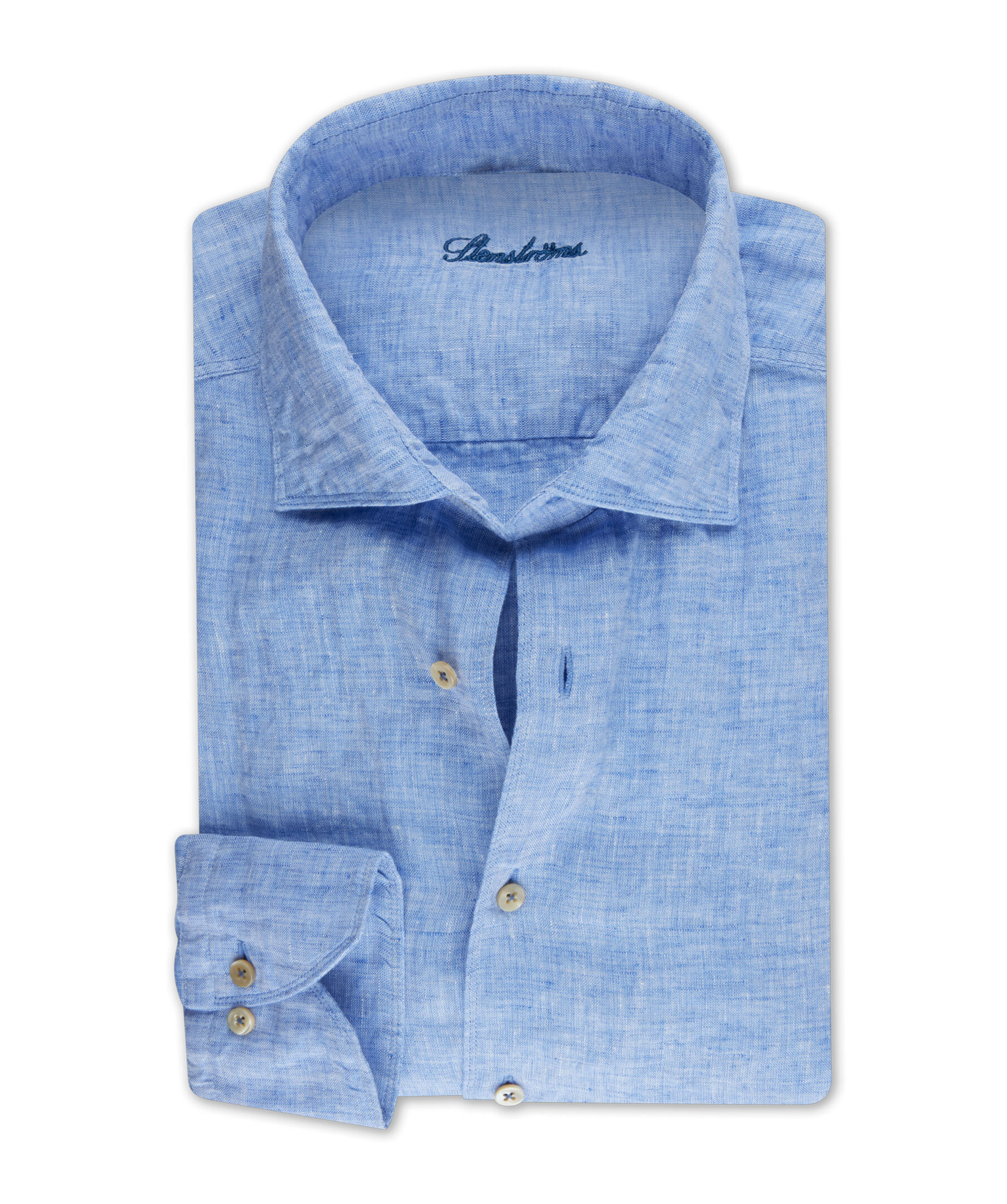 Denna Fitted Body-skjorta är tillverkad av linne och pärlemorknappar, enkla manschetter och en cut away krage.