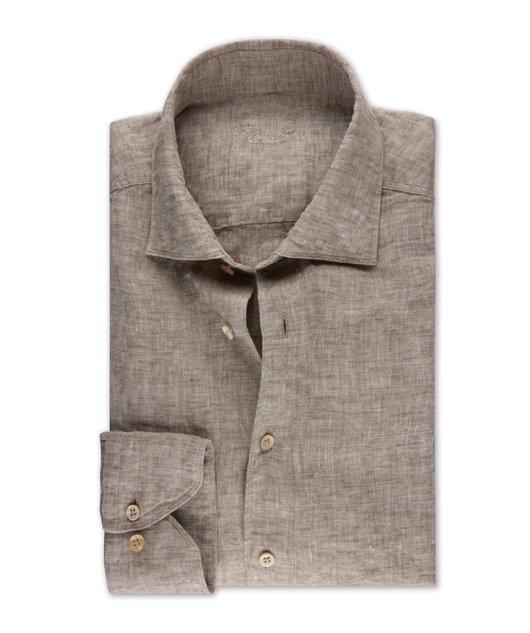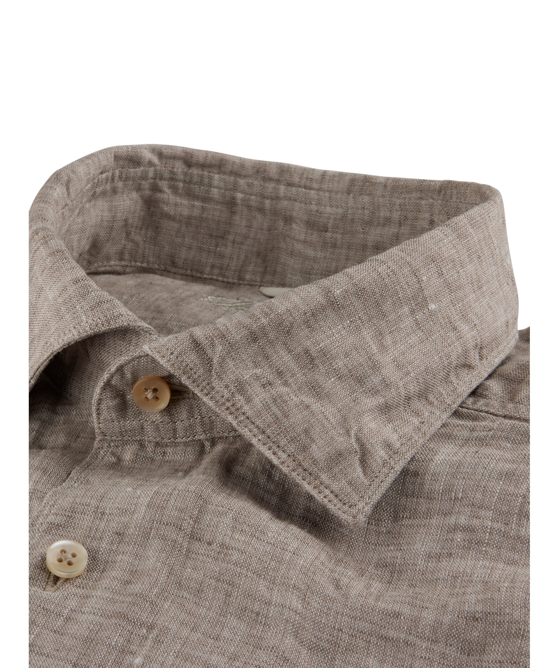 Denna Fitted Body-skjorta är tillverkad av linne och pärlemorknappar, enkla manschetter och en cut away krage.