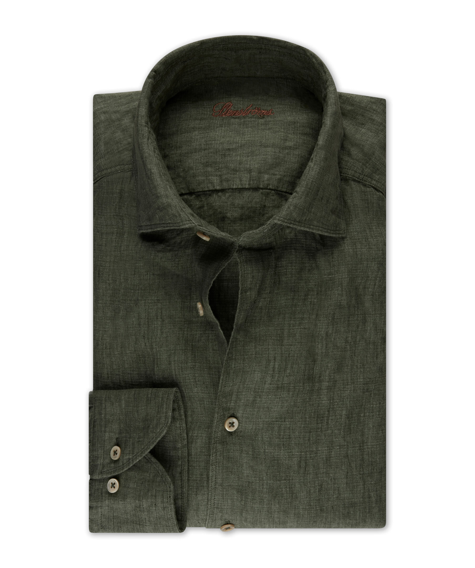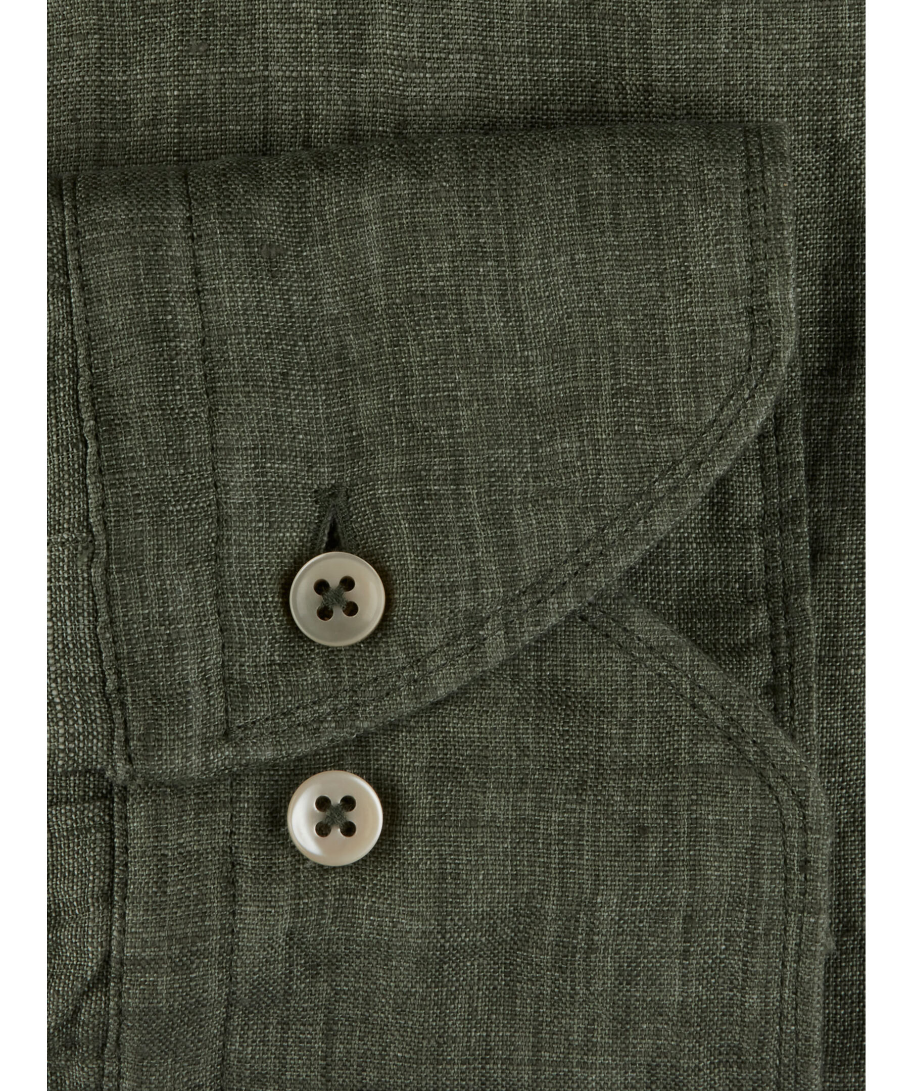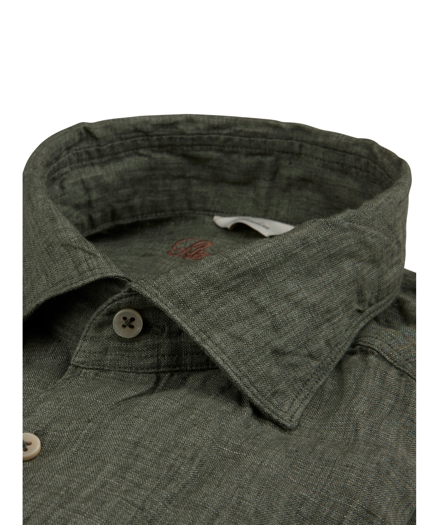 Denna Fitted Body-skjorta är tillverkad av linne och pärlemorknappar, enkla manschetter och en cut away krage.