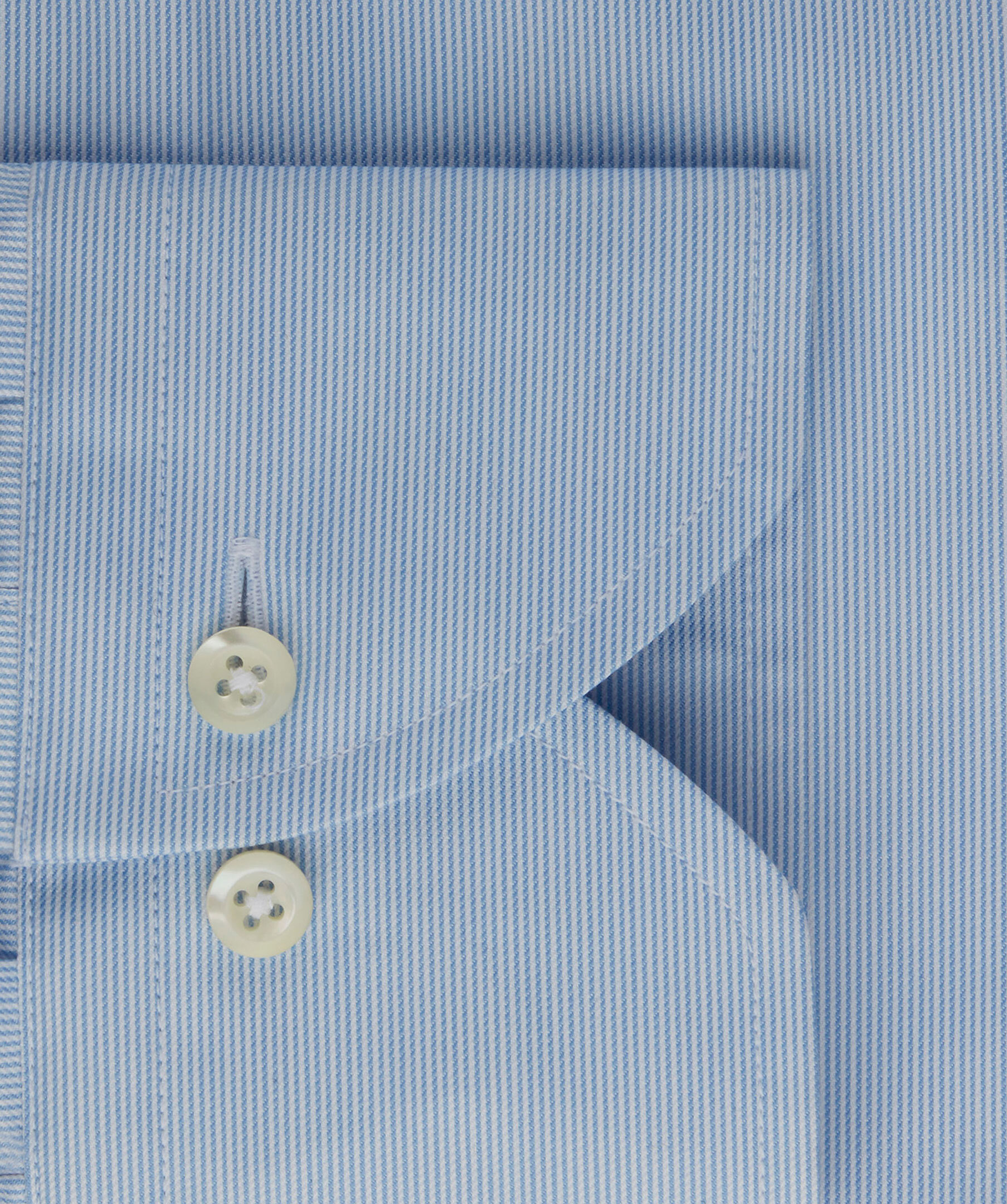 Denna kritstrecksrandiga fitted body skjortan från Stenströms är gjord av mjukt twofold bomull och har en något skräddarsydd midja. Detaljerad med enkla manschetter, pärlemoknappar och cut away krage. Vi gillar den bäst till ett par kostymbyxor.