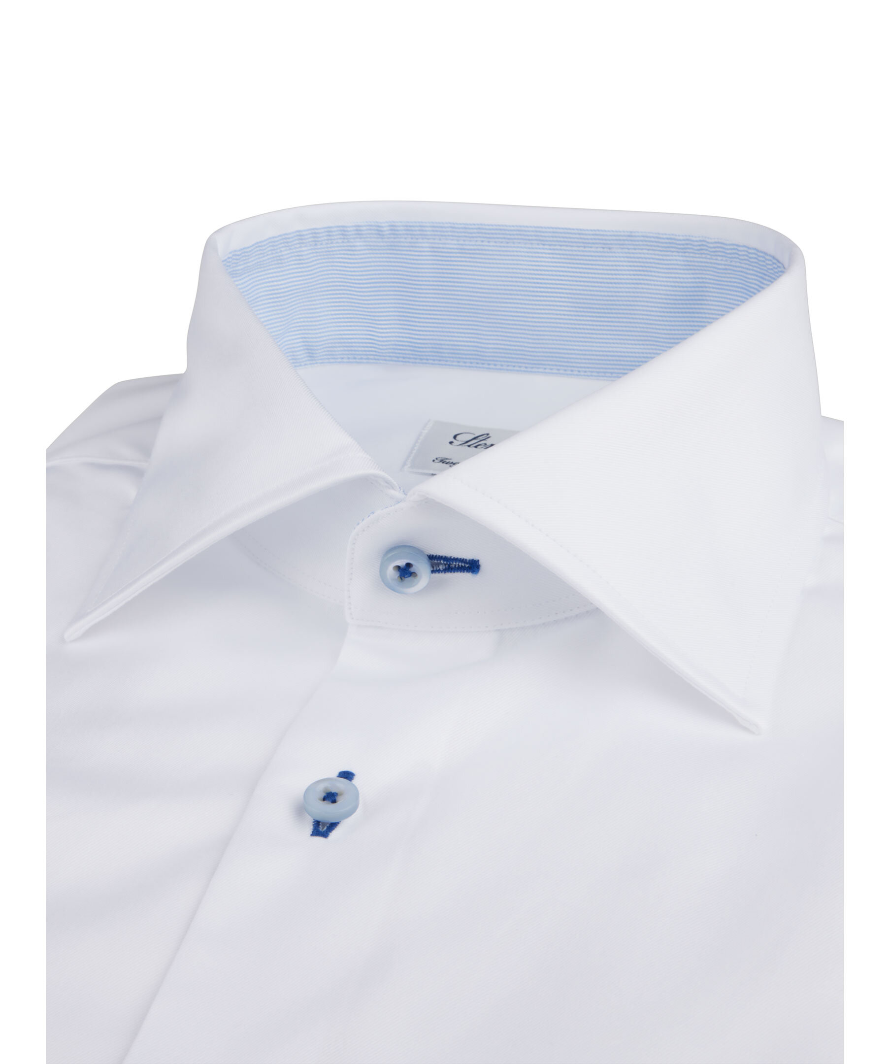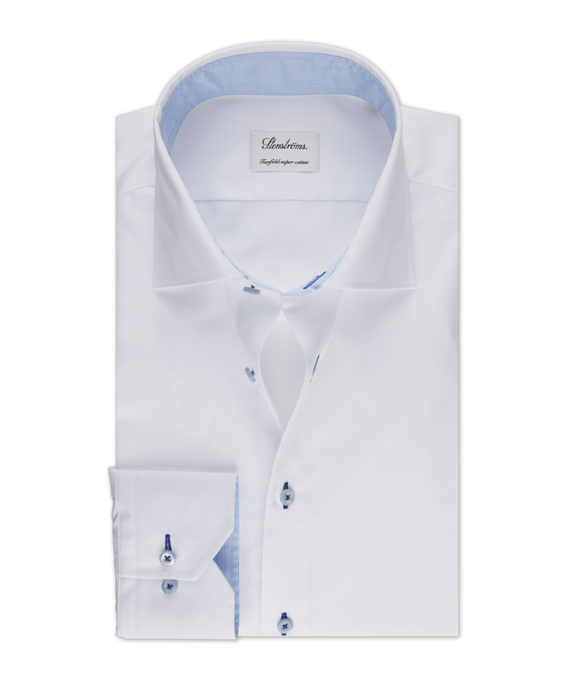 Denna Fitted Body twillskjorta är tillverkad av twofold bomull och har en kontrast i krage och manschett. Skjortan har marinblå knappshål, pärlemorknappar, enkla manschetter, en cut away krage och XL-ärmar.