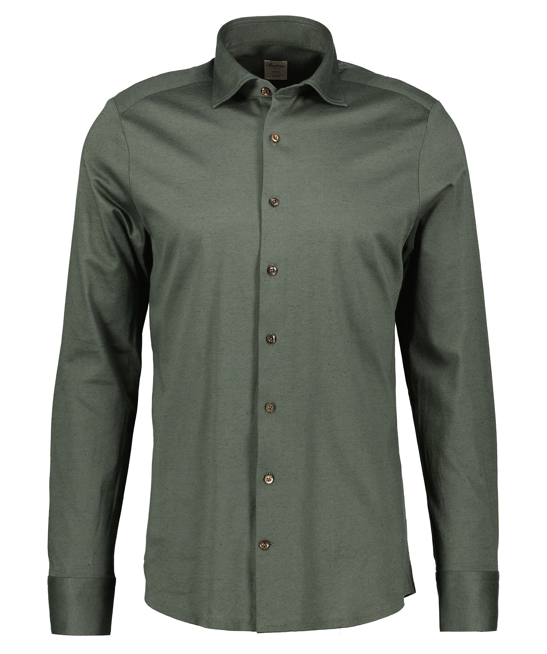 Skogsgröna skjorta från Stenströms är tillverkad av bomull och linne. Skuren för en smal passform. Detaljerad med enkla justerbara manschetter, pärlemorknappar och en Kent-krage. Matcha gärna med ett par kostymbyxor eller jeans, för en mer avslappnad look.