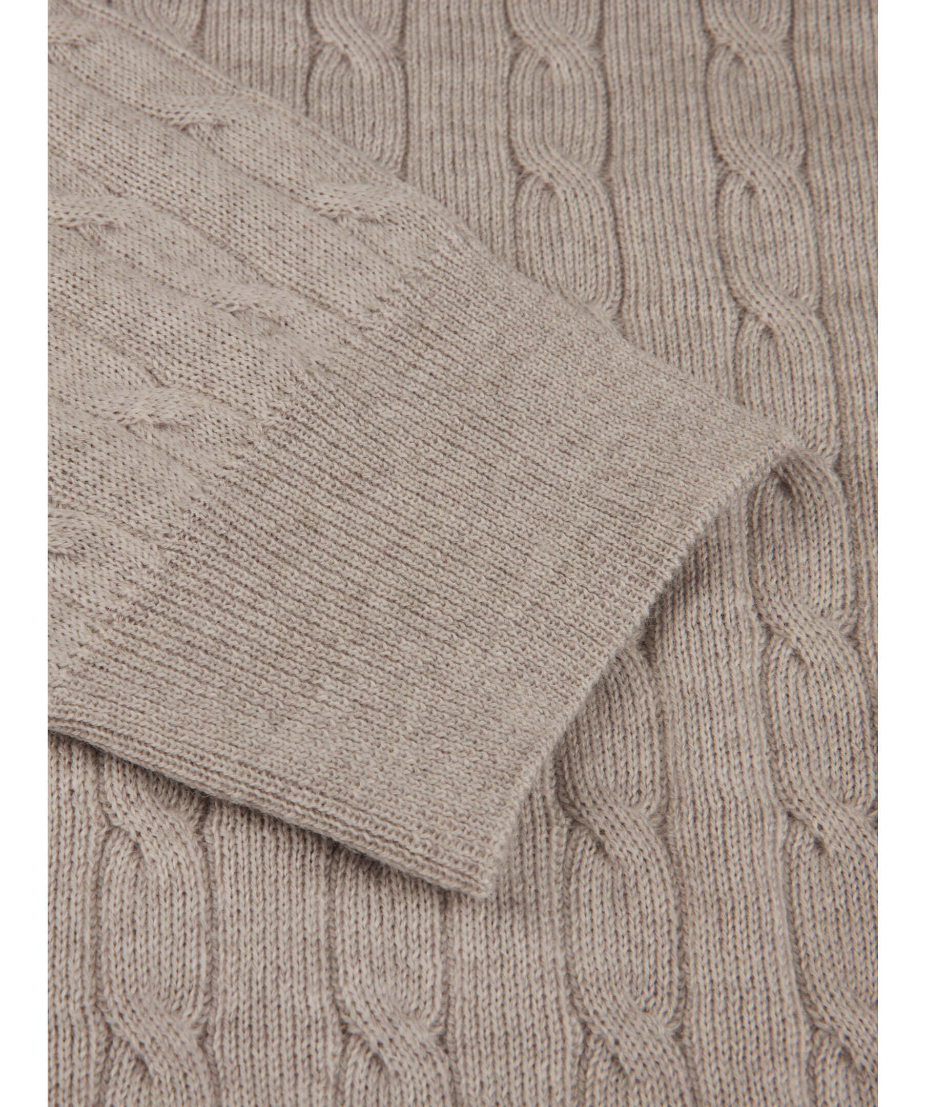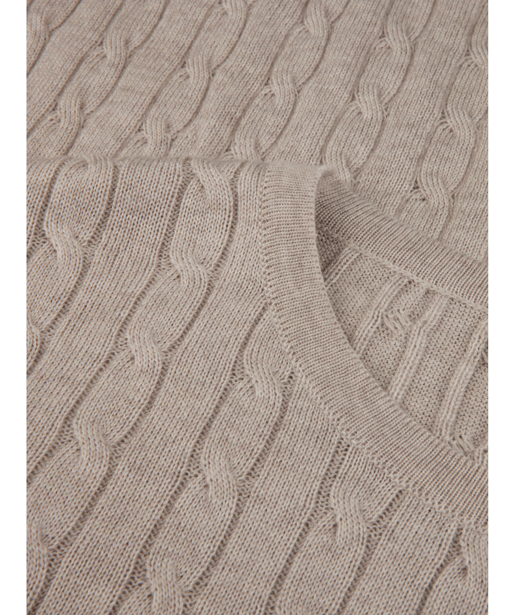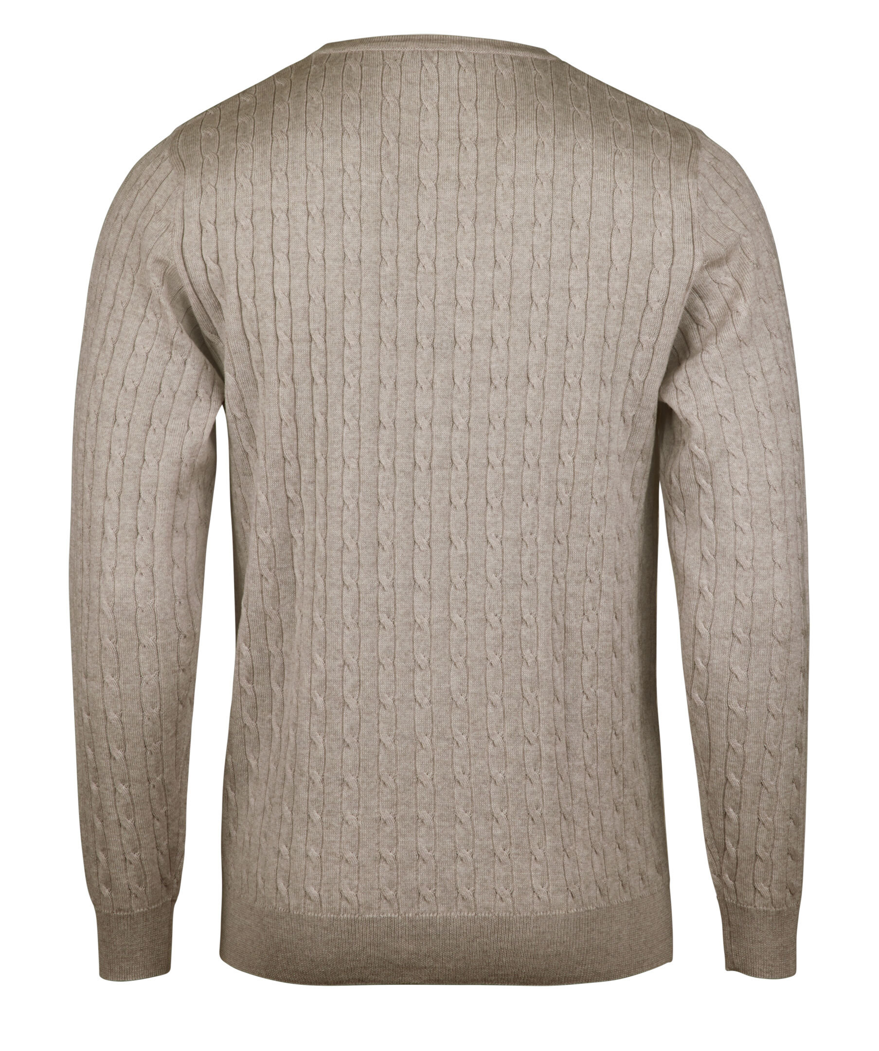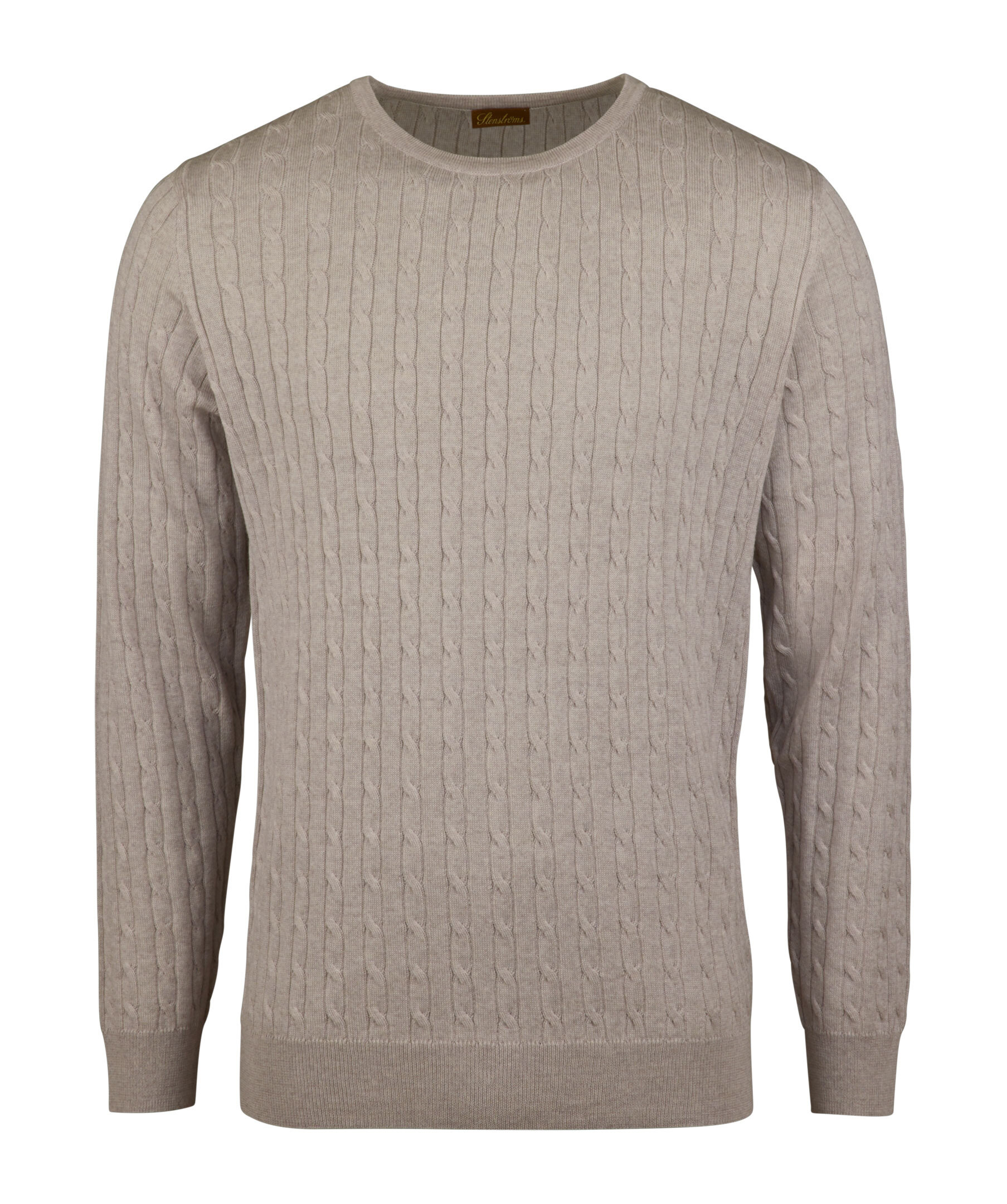 Denna kabelstickade rundhalsade tröja är tillverkad av merinoull. Tröjan har ribbstickade detaljer vid krage, ärm- och plaggslut.