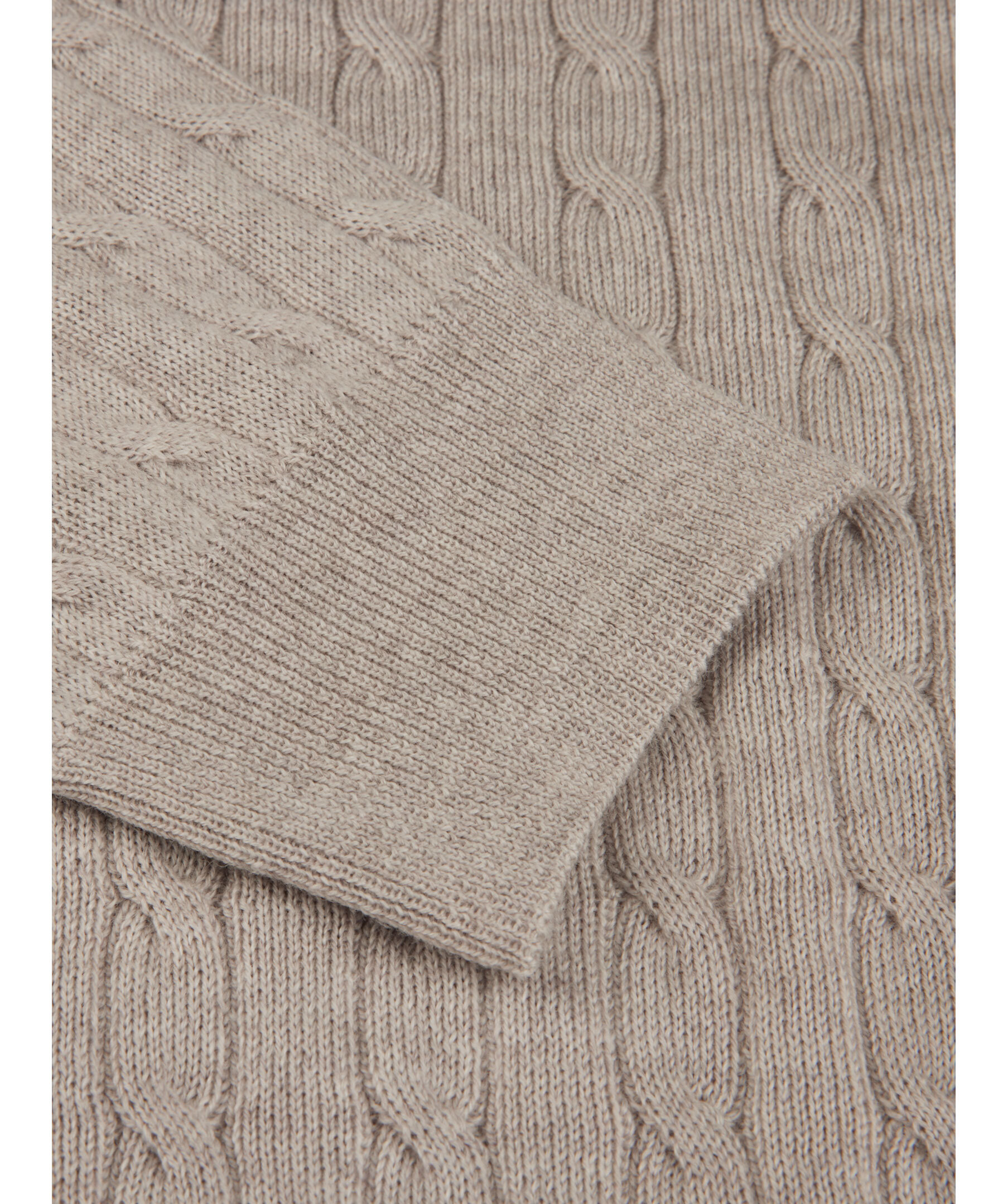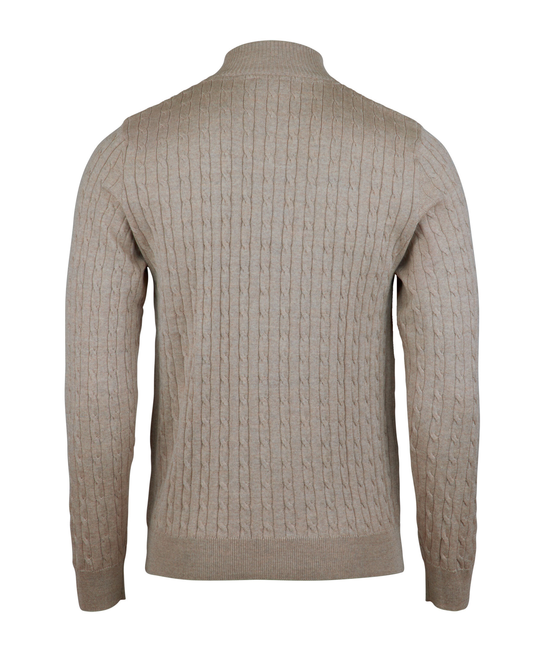 Denna kabelstickade halfzip tröja är tillverkad av merinoull och har ribbstickade detaljer vid krage, ärm- och plaggslut.