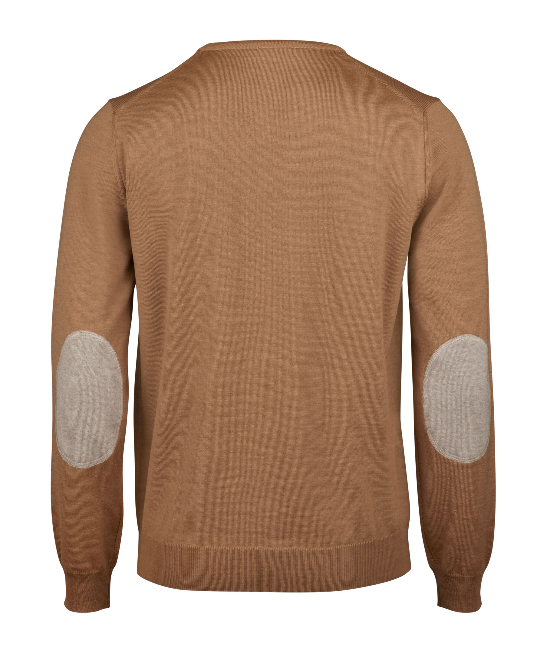 Denna rundhalsade tröja är tillverkad av merinoull och har armbågspatches och ribbstickade detaljer vid krage, ärm- och plaggslut.