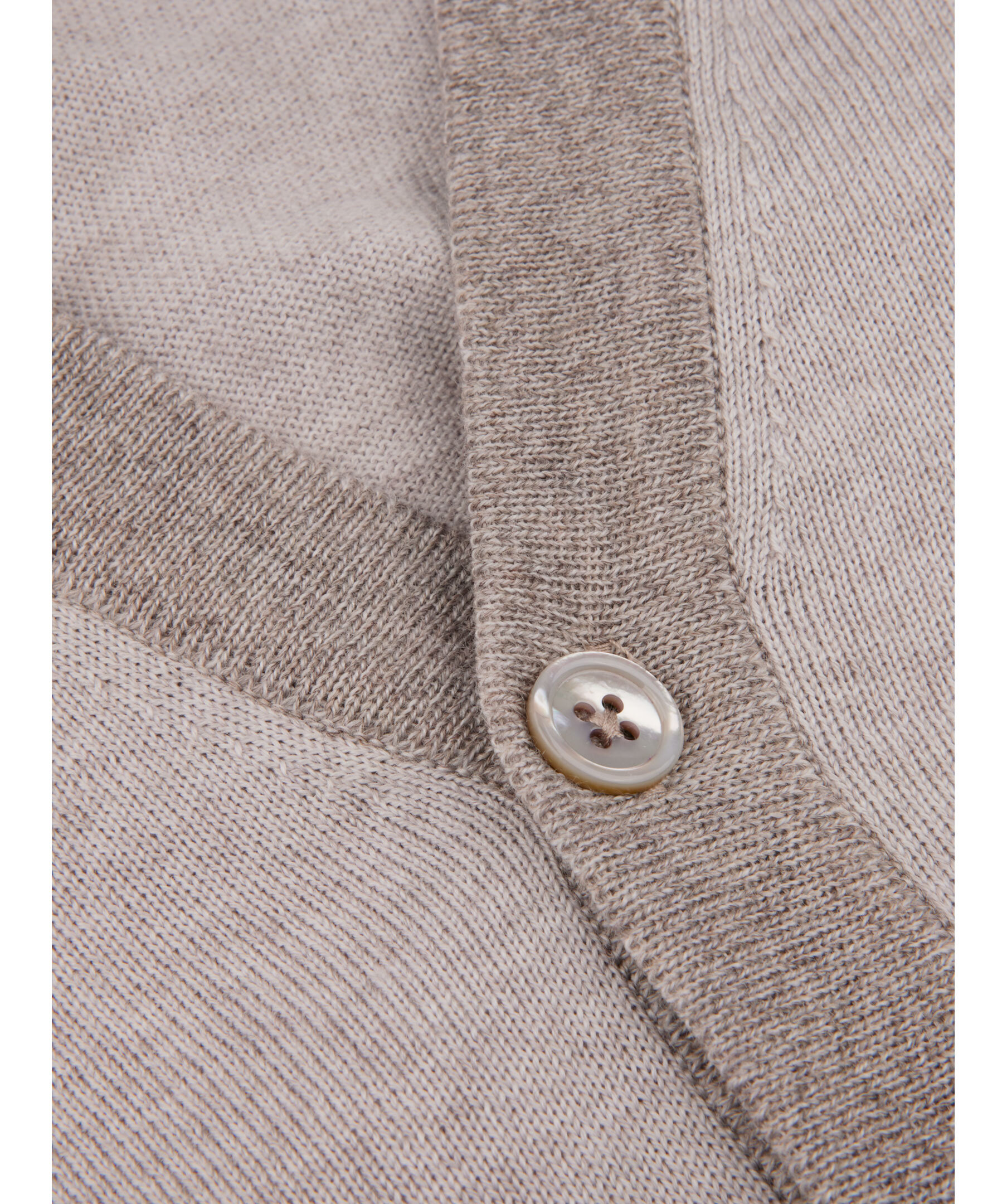 Denna kofta är tillverkad av merinoull och är detaljerad med en moulinékontrast. Koftan har pärlemorknappar och ribbstickade detaljer vid ärm, krage och plaggslut.