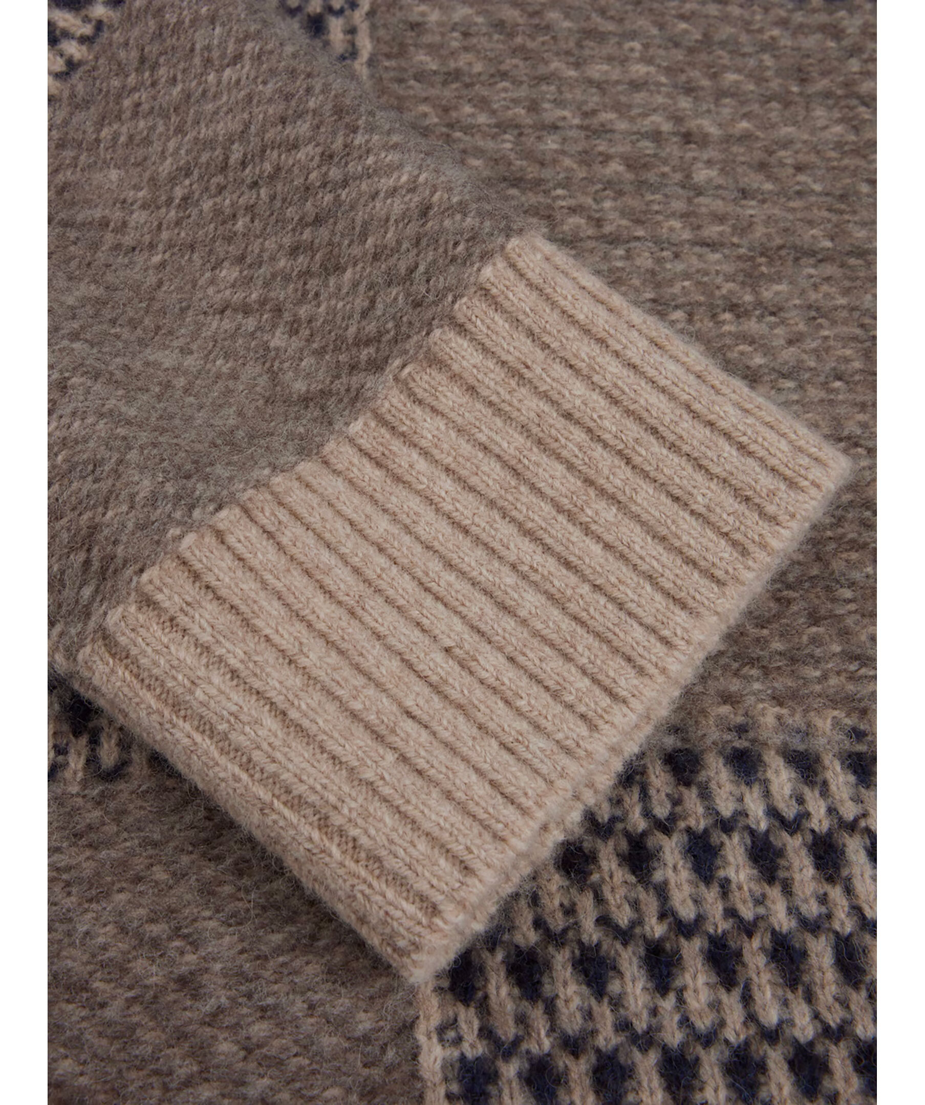 Denna rutiga rundhalsade tröja är tillverkad av jak och merinoull. Tröjan har ribbstickade detaljer vid krage, ärm- och plaggslut.