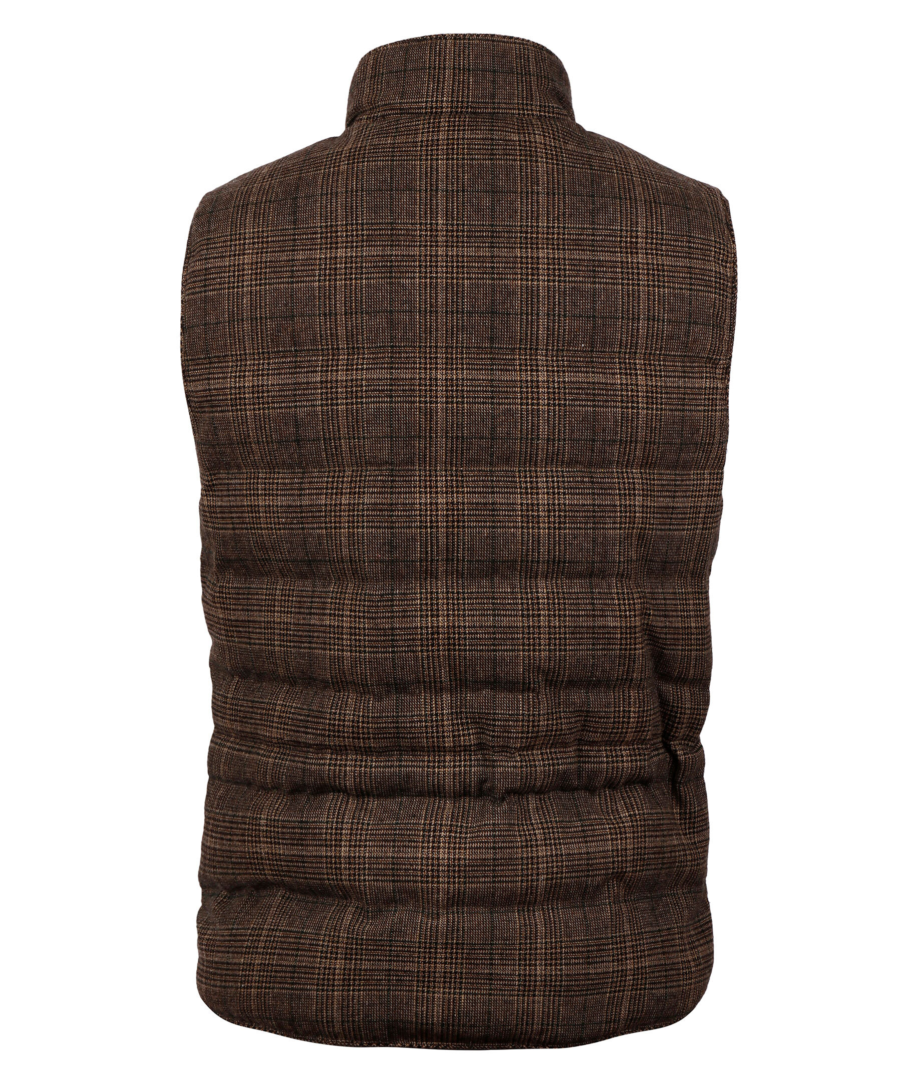 Brun quiltad dunväst med hundtandsmönster i bruna toner från Stenströms. Tillverkad i ullmix, Stängs framtill med knappar. tre fickor fram varav en bröstficka på vänster sida. Dragsko i midjan.