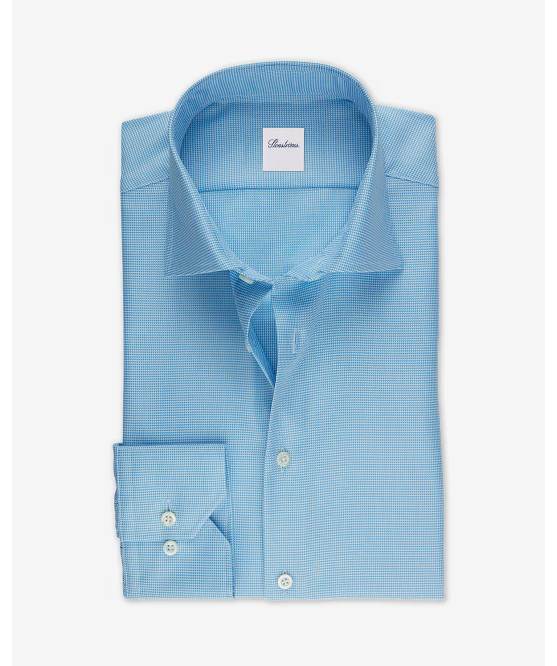 Ljusblå willskjorta är tillverkad av twofold bomull och har ett hundtandsmönster. Skjortan har pärlemorknappar, enkla manschetter och en cut away krage.