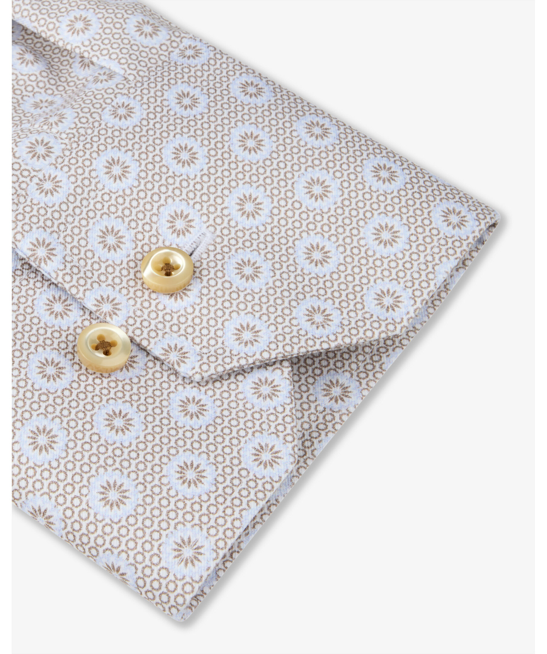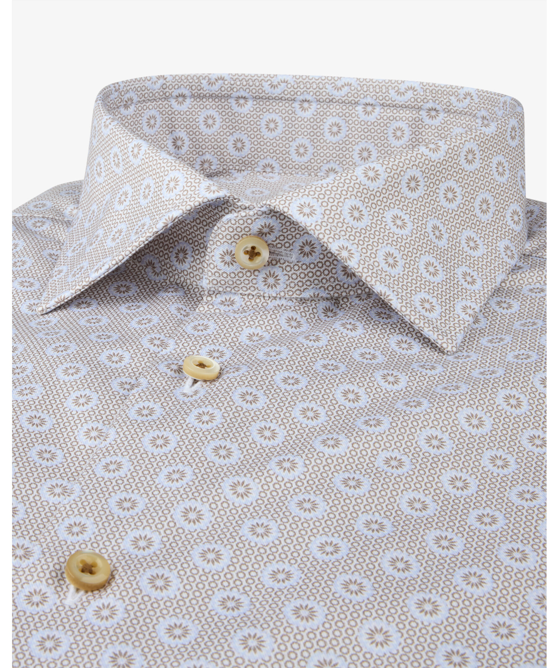 Beige mönstrad twillskjorta tillverkad av twofold bomull och har ett mikromönster. Skjortan har pärlemorknappar, enkla manschetter och en cut away krage.