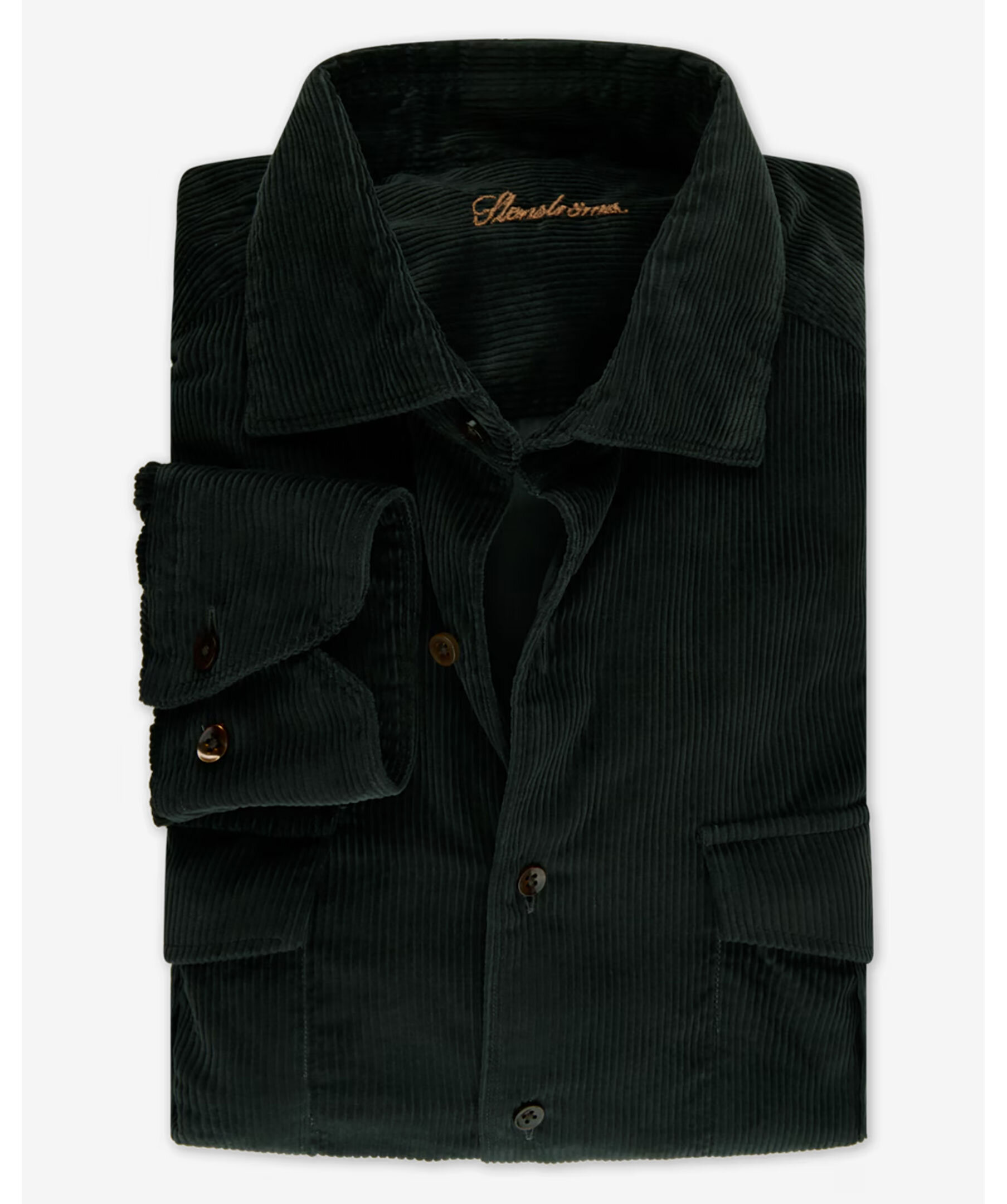 Mörkgrön manchesterskjorta från Stenströms. Skjortan har en klassisk cut-away-krage och enkelmanschett. Den är tillverkad i mjuk manchestermaterial (bomull med struktur) som ger textur och värme, perfekt för svalare säsonger. En elegant skjorta som passar både under kavaj och för mer avslappnade outfits.