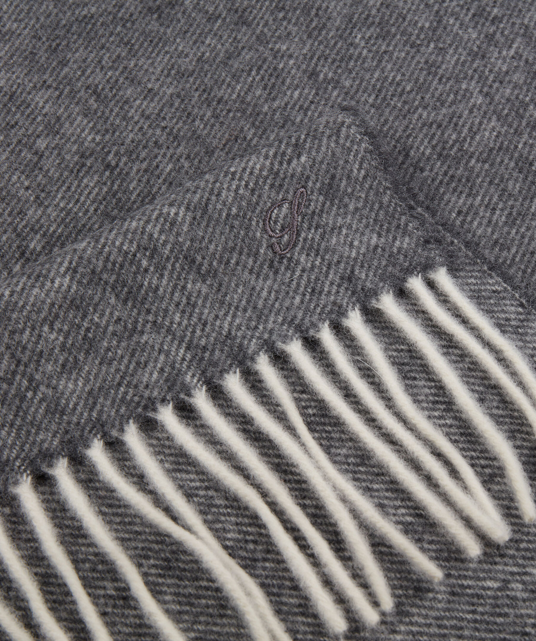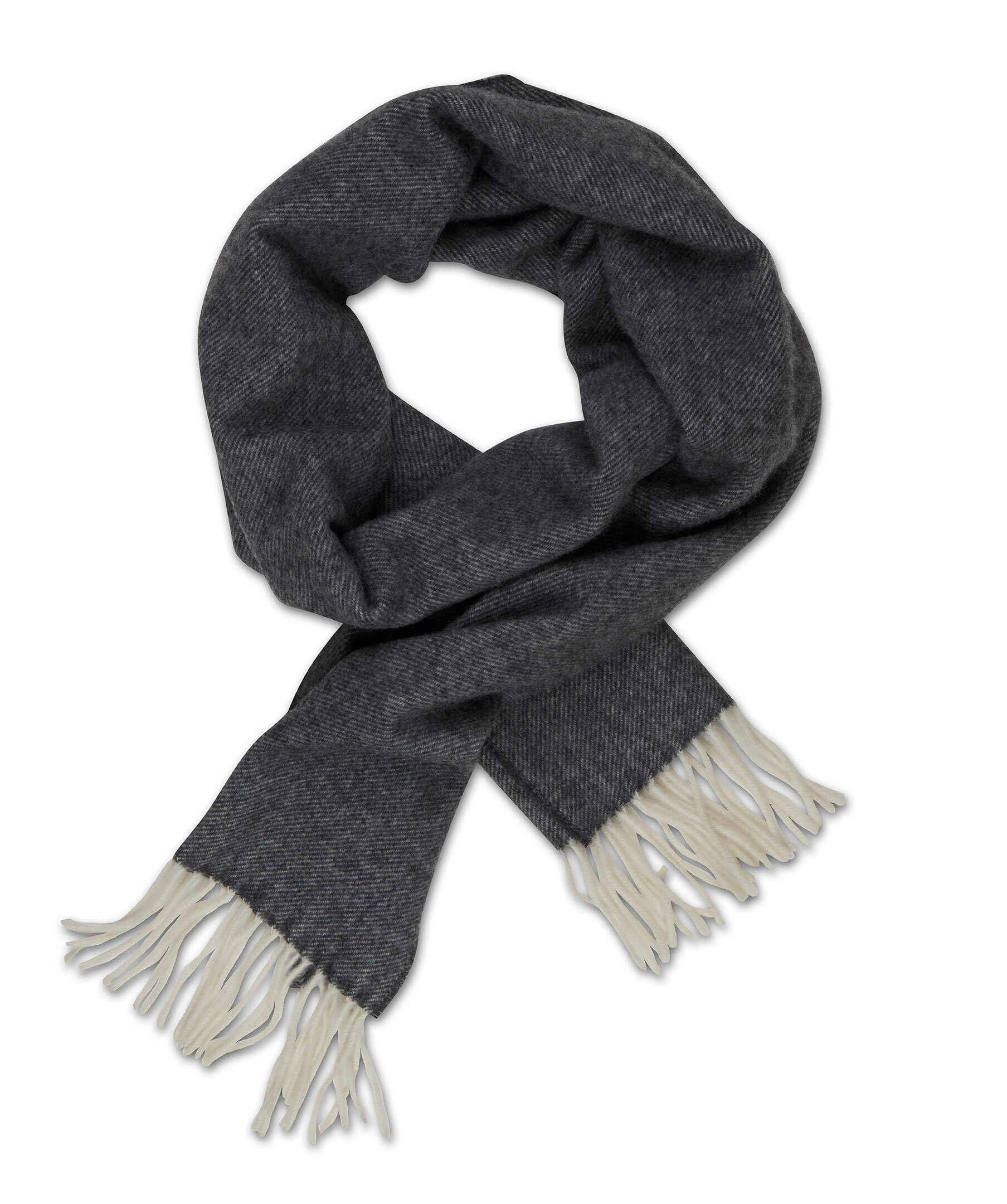 Grå halsduk från Stenströms. Brun och vit twill, vita fransar. 200 x 30 cm. Tillverkad i 100% ull.