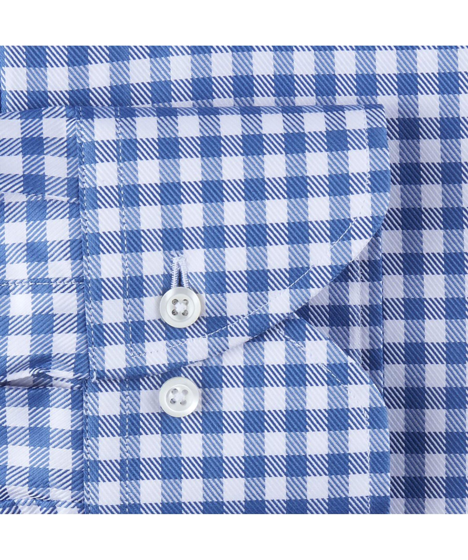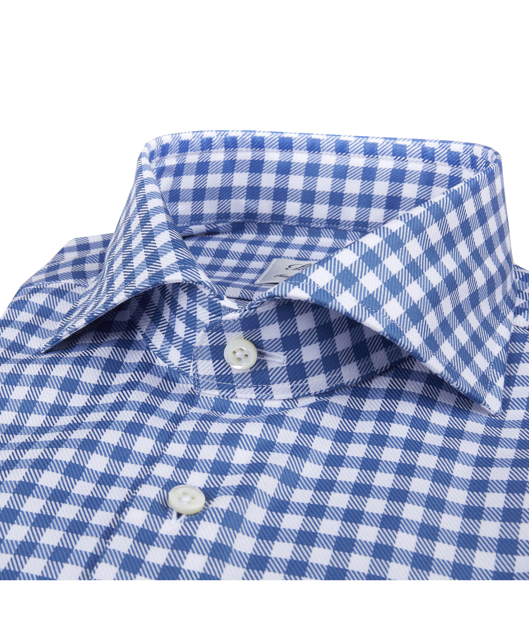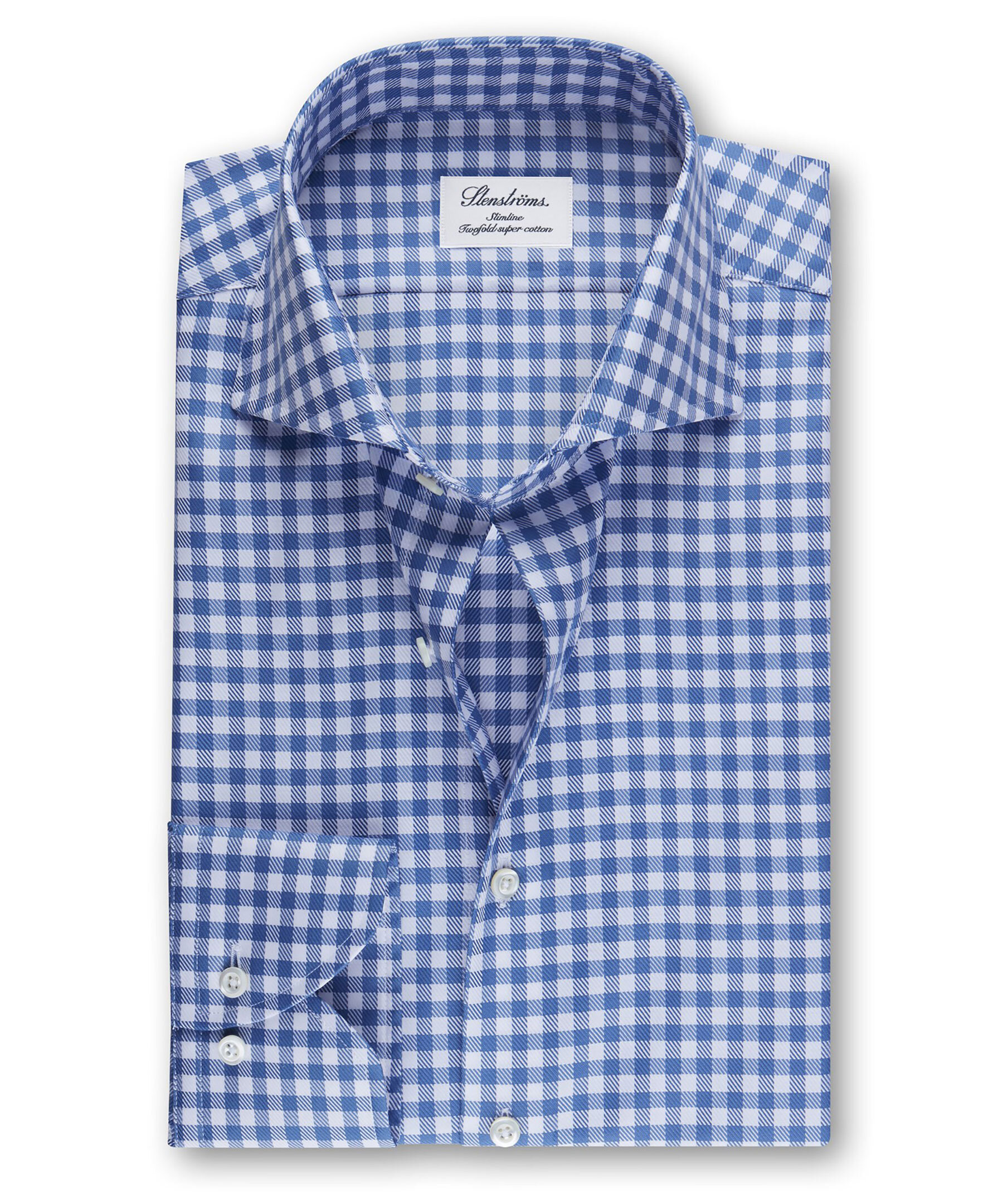 Vit och blårutig skjorta i modell Slimline från Stenströms. Smal och flexibel passform som är gjord i en mjuk och följsam dubbeltvinnad (twofold) bomull med ett vävt Gingham rutigt mönster. Vita pärlemorknappar fram och i ärmslut på manchetter.