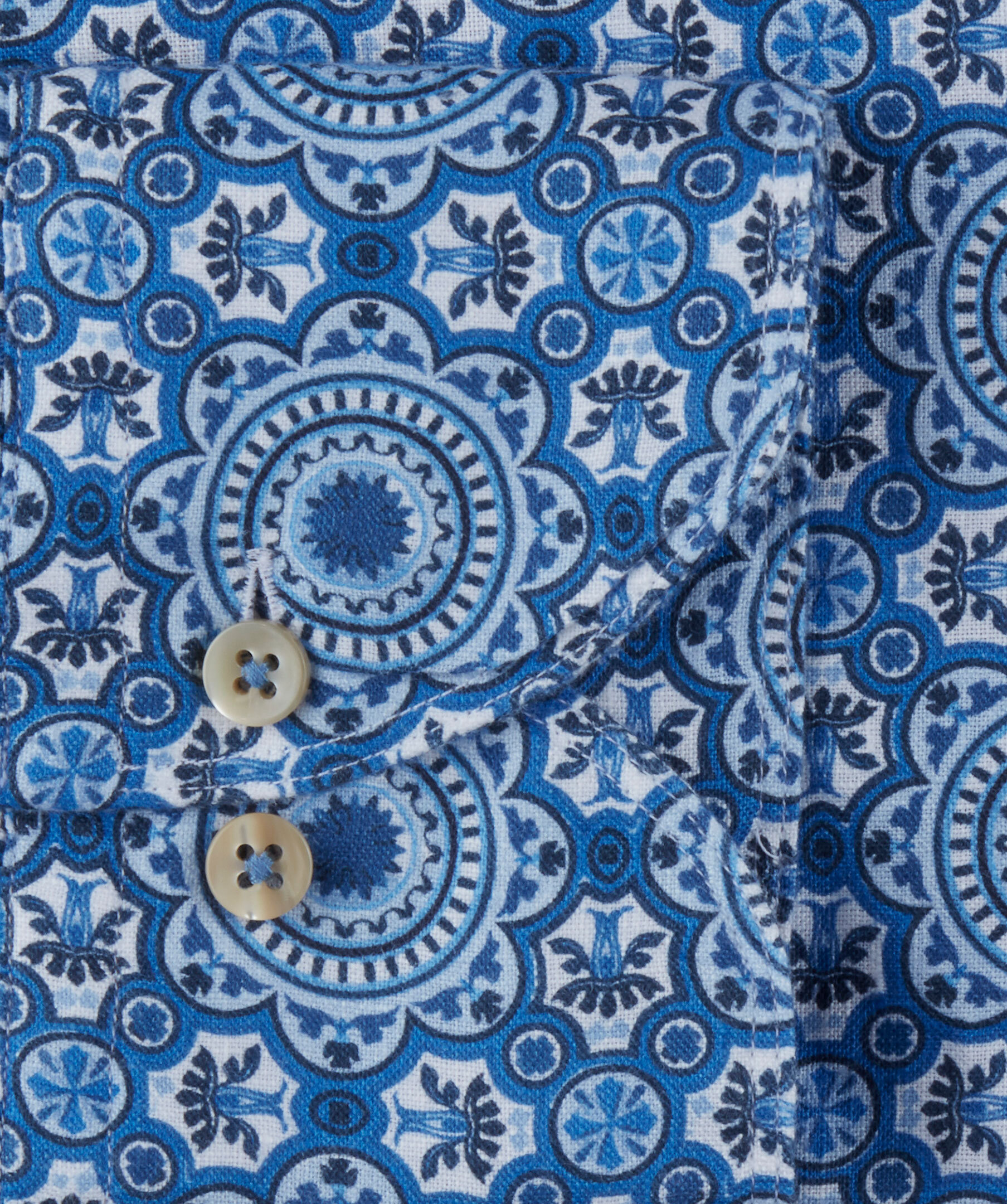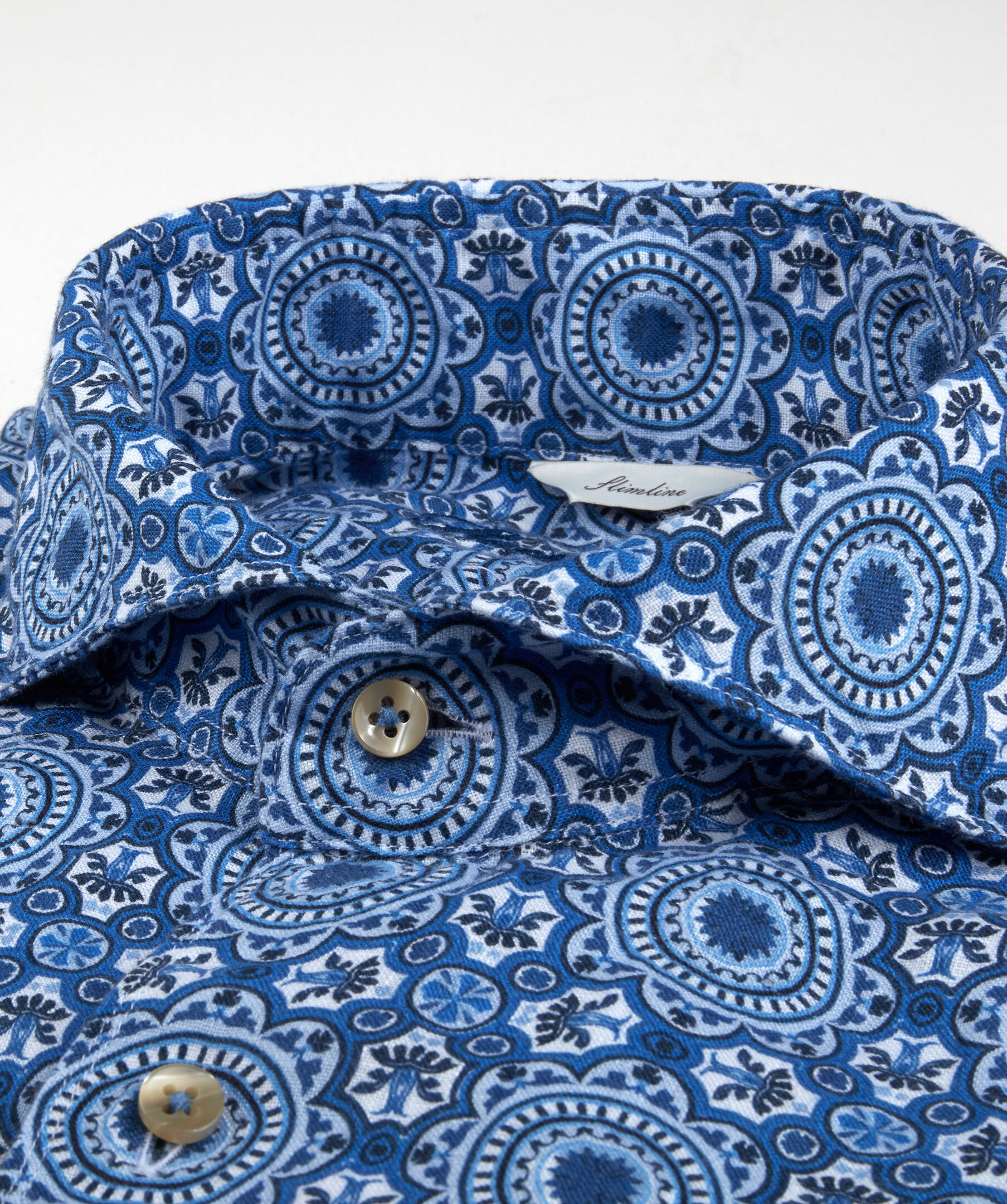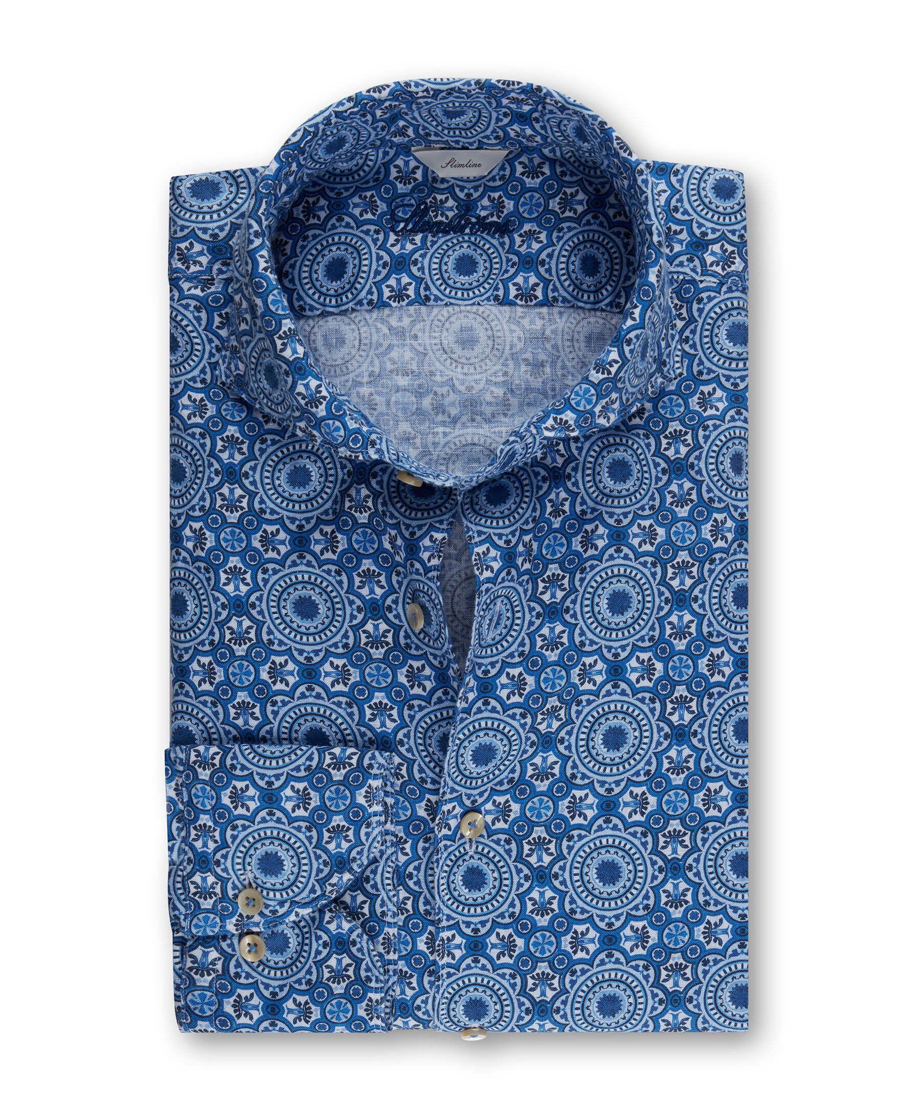 Den här ikoniska Slimline-skjortan i linne har en smal passform och är detaljerad med ett mönster i olika blå toner. Den har beigea pärlemorknappar, en cutaway krage och enkla justerbara manschetter. Det här är utan tvekan sommarens skjorta. Bär till vita jeans eller shorts för en avslappnad somrig look.